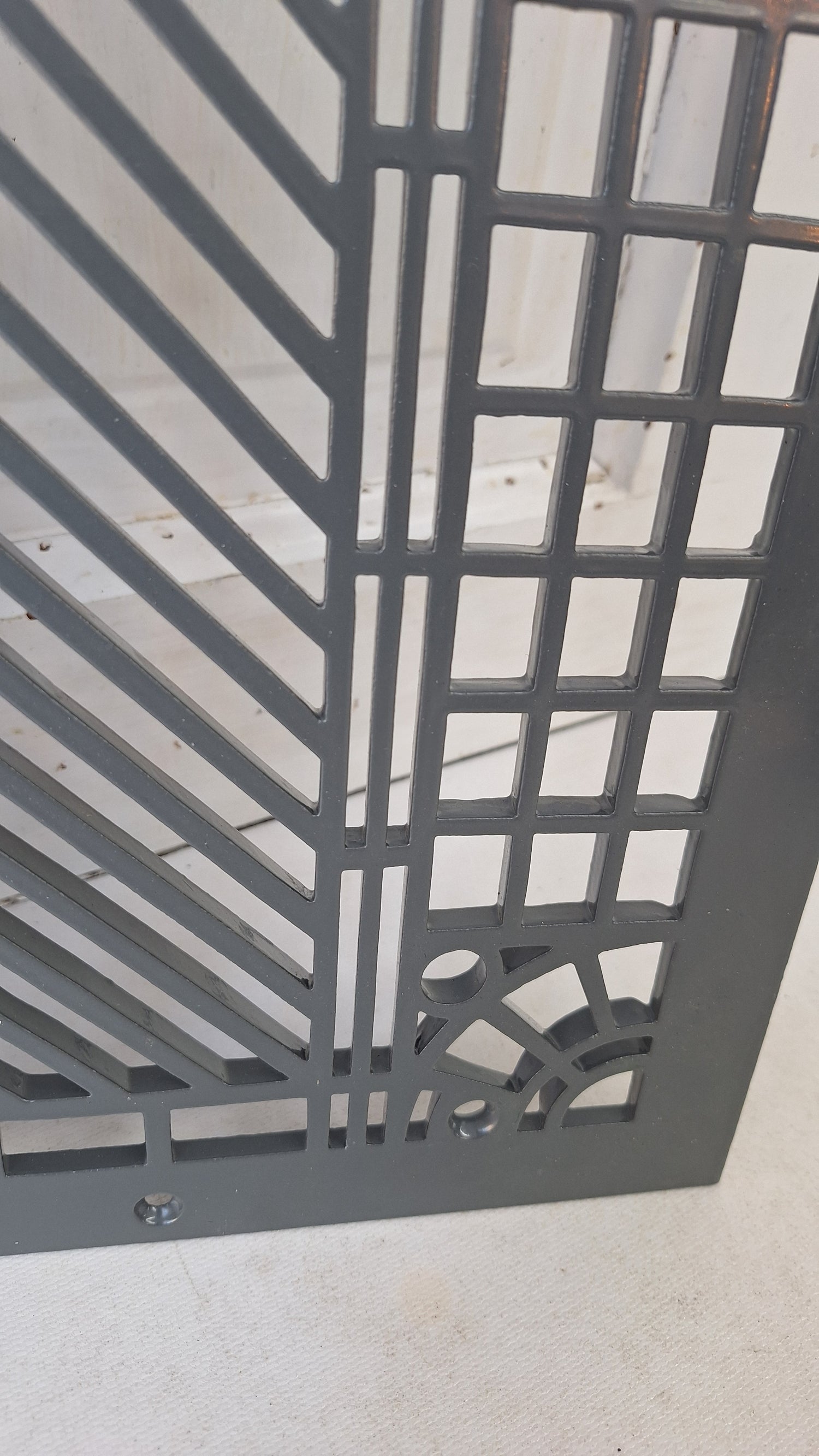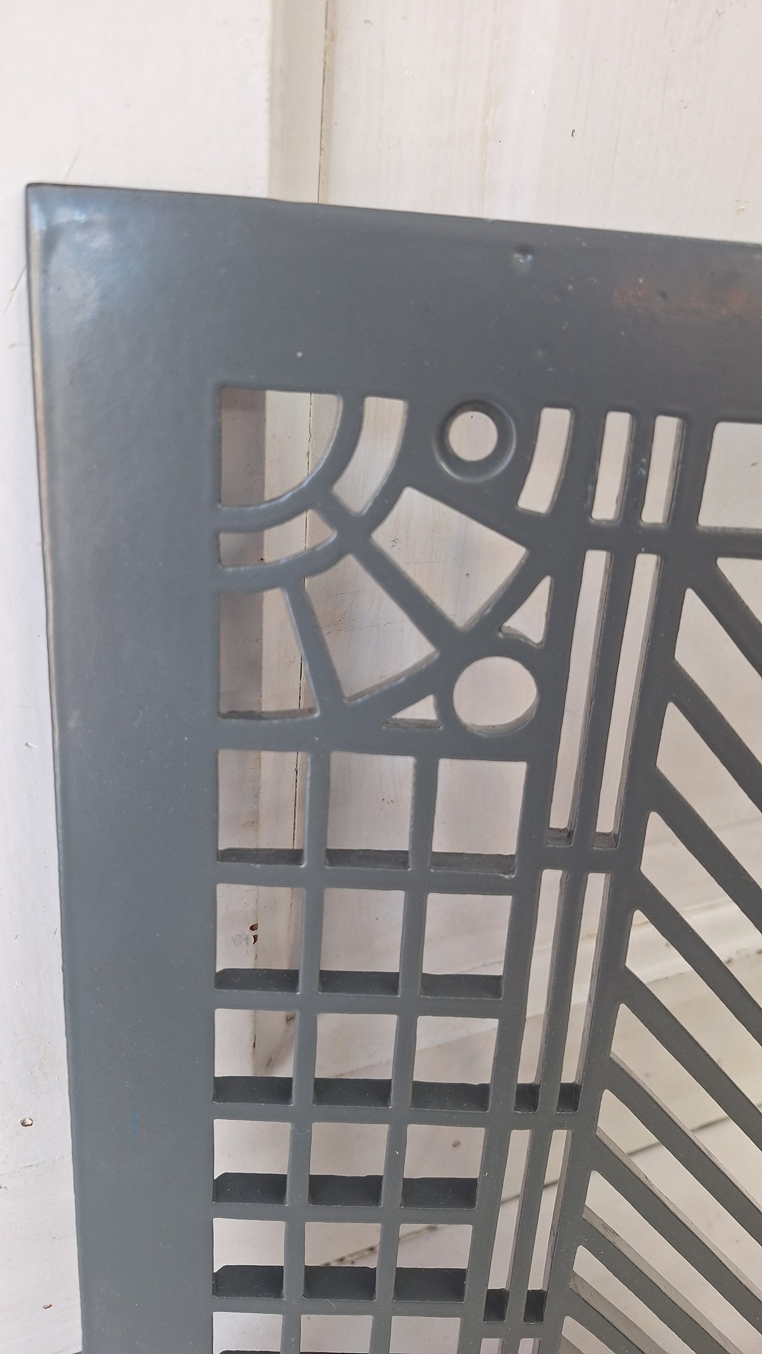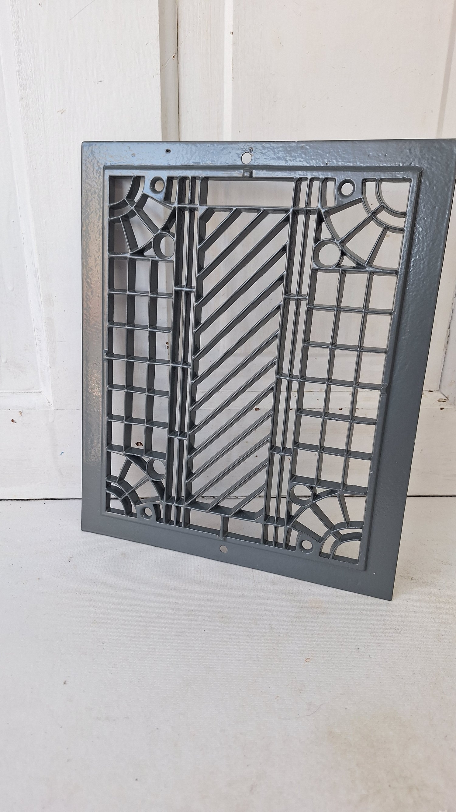 A beautiful cast iron vent cover from the turn of the century. This piece features an unusual geometric design and has been painted in a semi gloss dark gray paint. It is in excellent condition as shown. Please see all of our pictures for details.