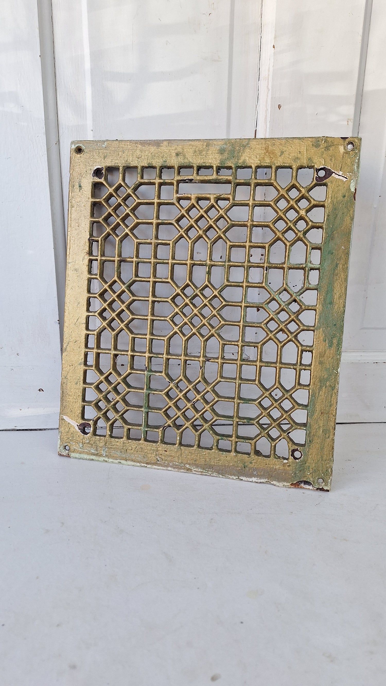 An attractive geometric pattern in sturdy cast iron. These vent covers are popular for reuse in both old and new homes. They are very well made and over 100 years old. They can also be used as wall art due to their lovely decorative patterns.