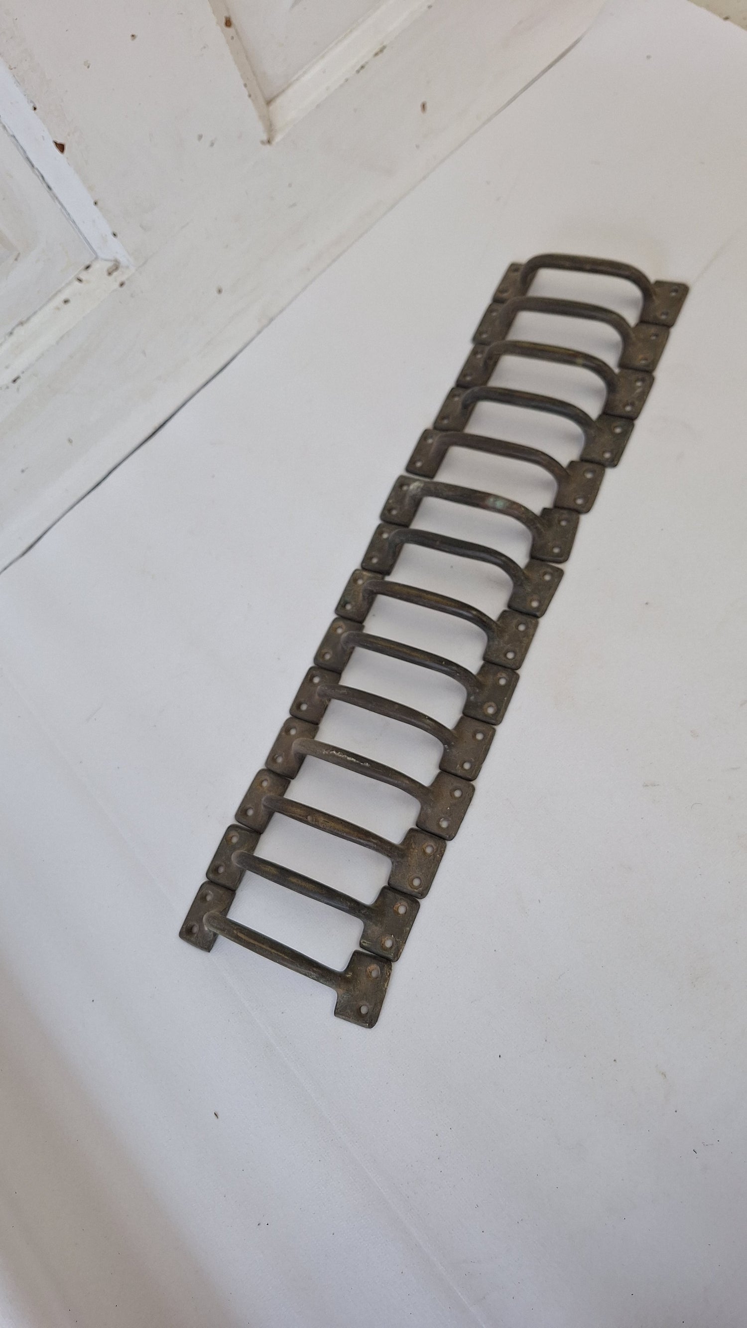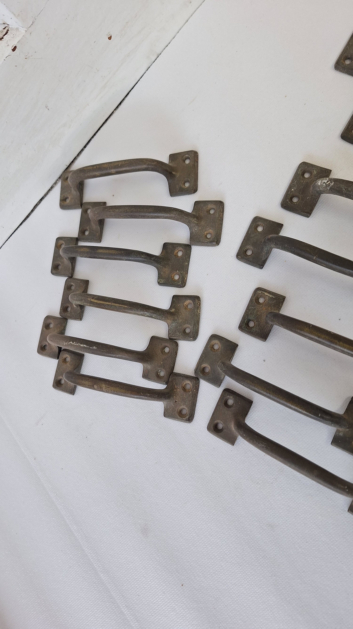 A set of 14 antique bronze window sash handles. These are all matching in style and size although some have slight bends in the handles from use as shown in the photos. These are in 'as found' condition and have not been cleaned. Please see all of our pictures for details and dimensions on this set. This set ships free within the US. www.peoriasalvage.com