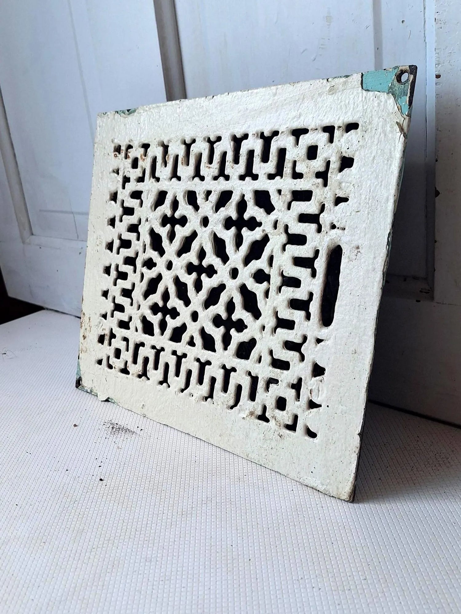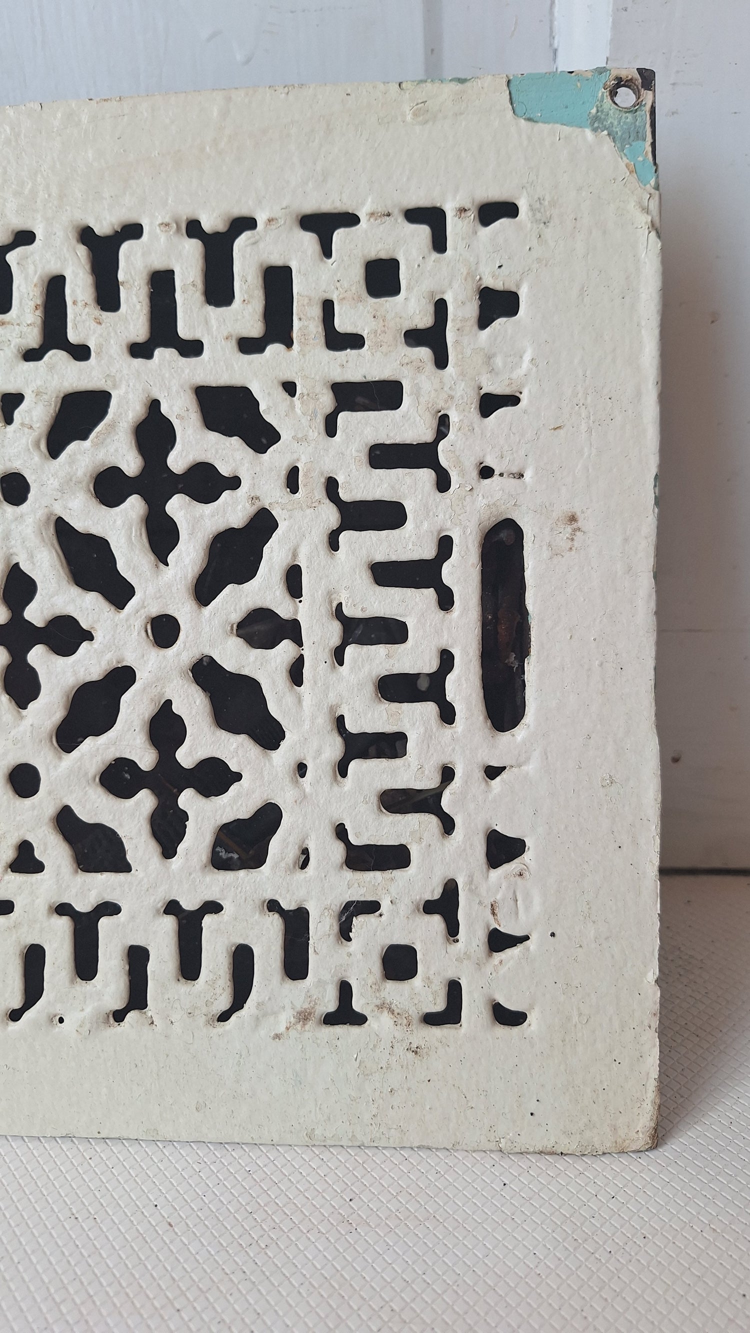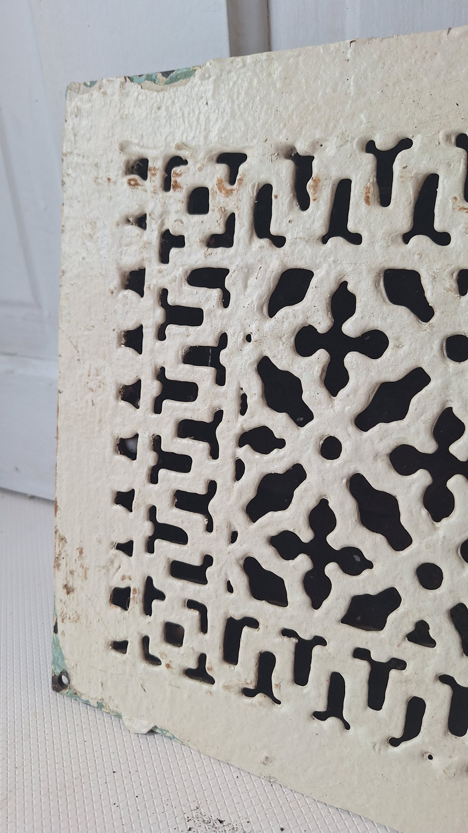 A beautifully designed geometric pattern vent cover from the turn of the century. These are popular to use as heating vent covers as intended, but can also be hung as wall art, trivets, doormats, and more. They are made from durable cast iron and can be left as is or painted in your color of choice. There are several layers of paint as shown. Please see all of our pictures for details.