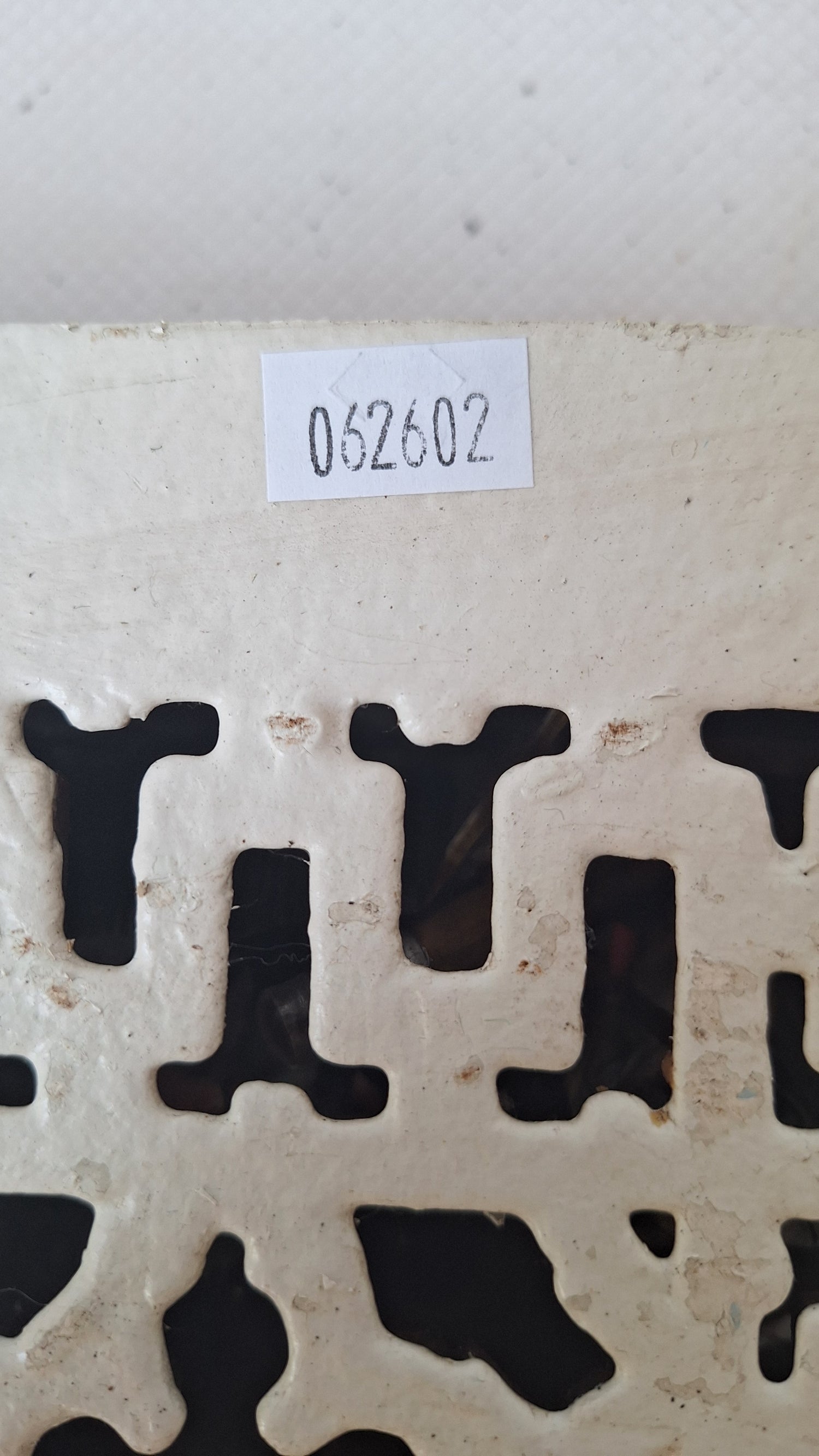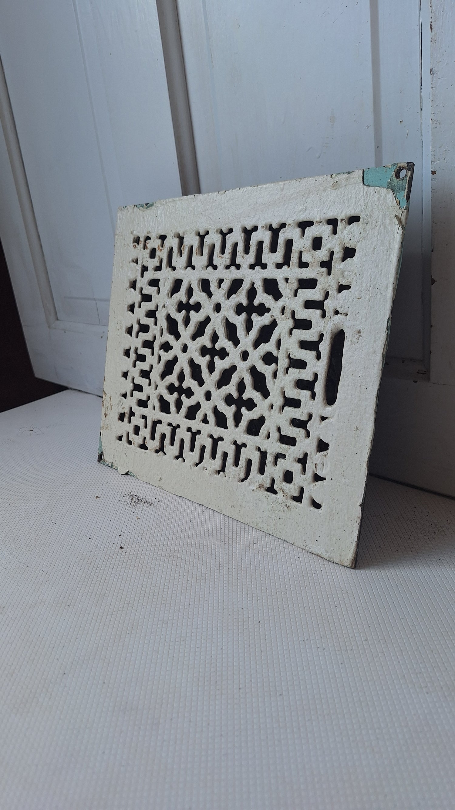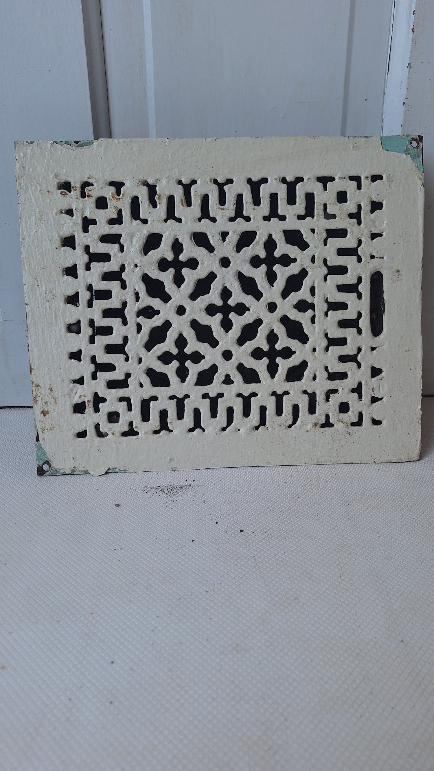 A beautifully designed geometric pattern vent cover from the turn of the century. These are popular to use as heating vent covers as intended, but can also be hung as wall art, trivets, doormats, and more. They are made from durable cast iron and can be left as is or painted in your color of choice. There are several layers of paint as shown. Please see all of our pictures for details.