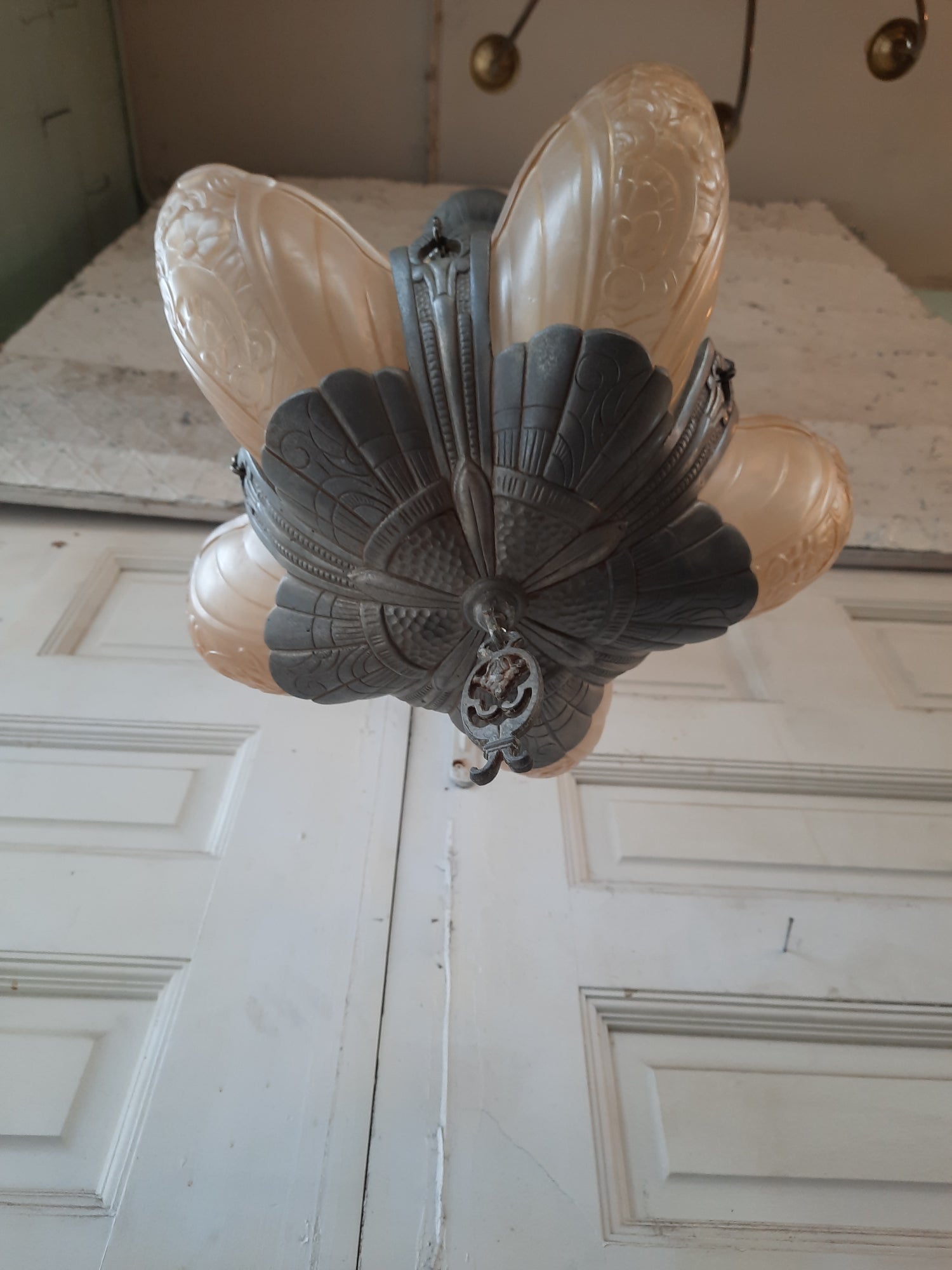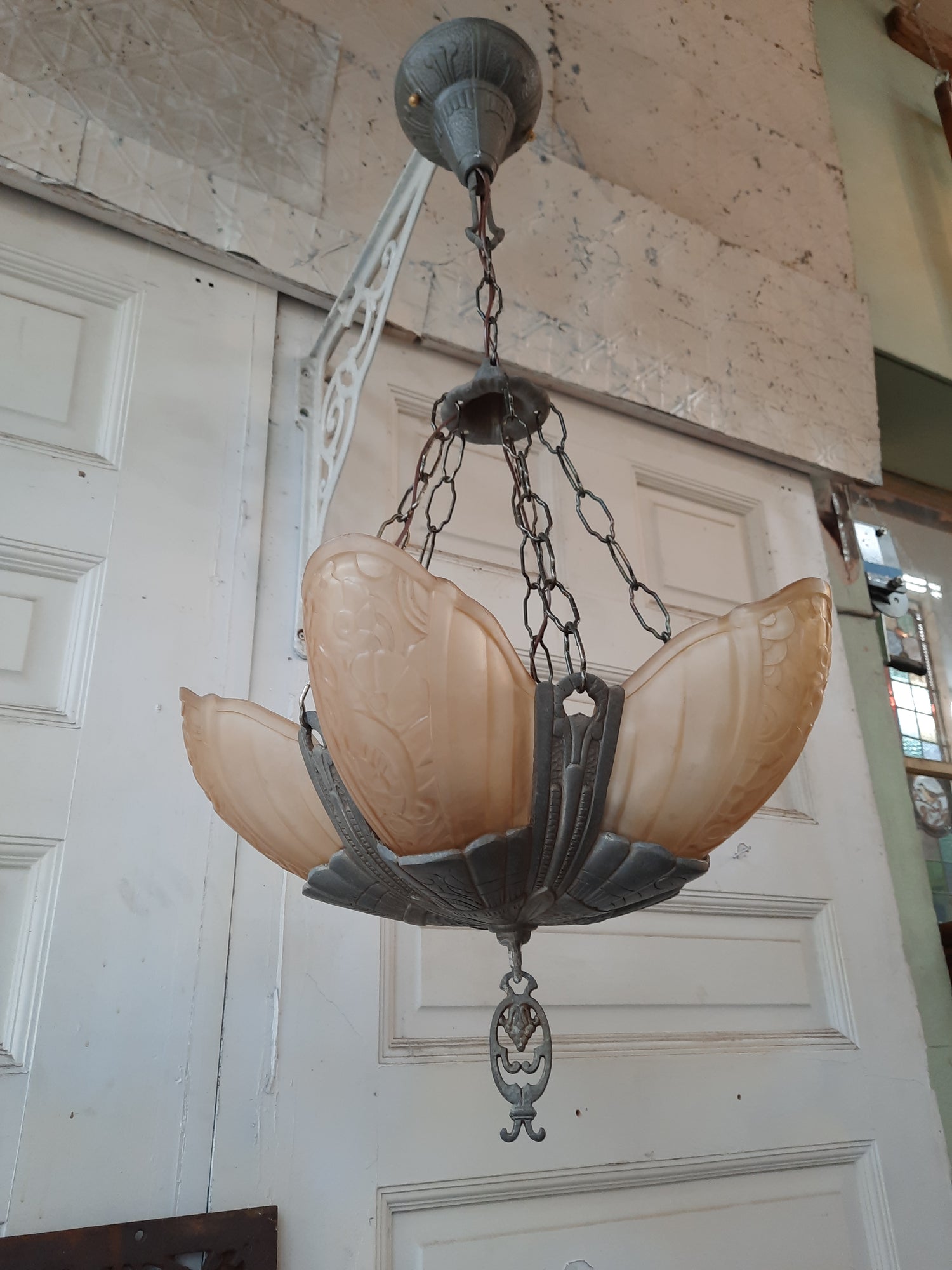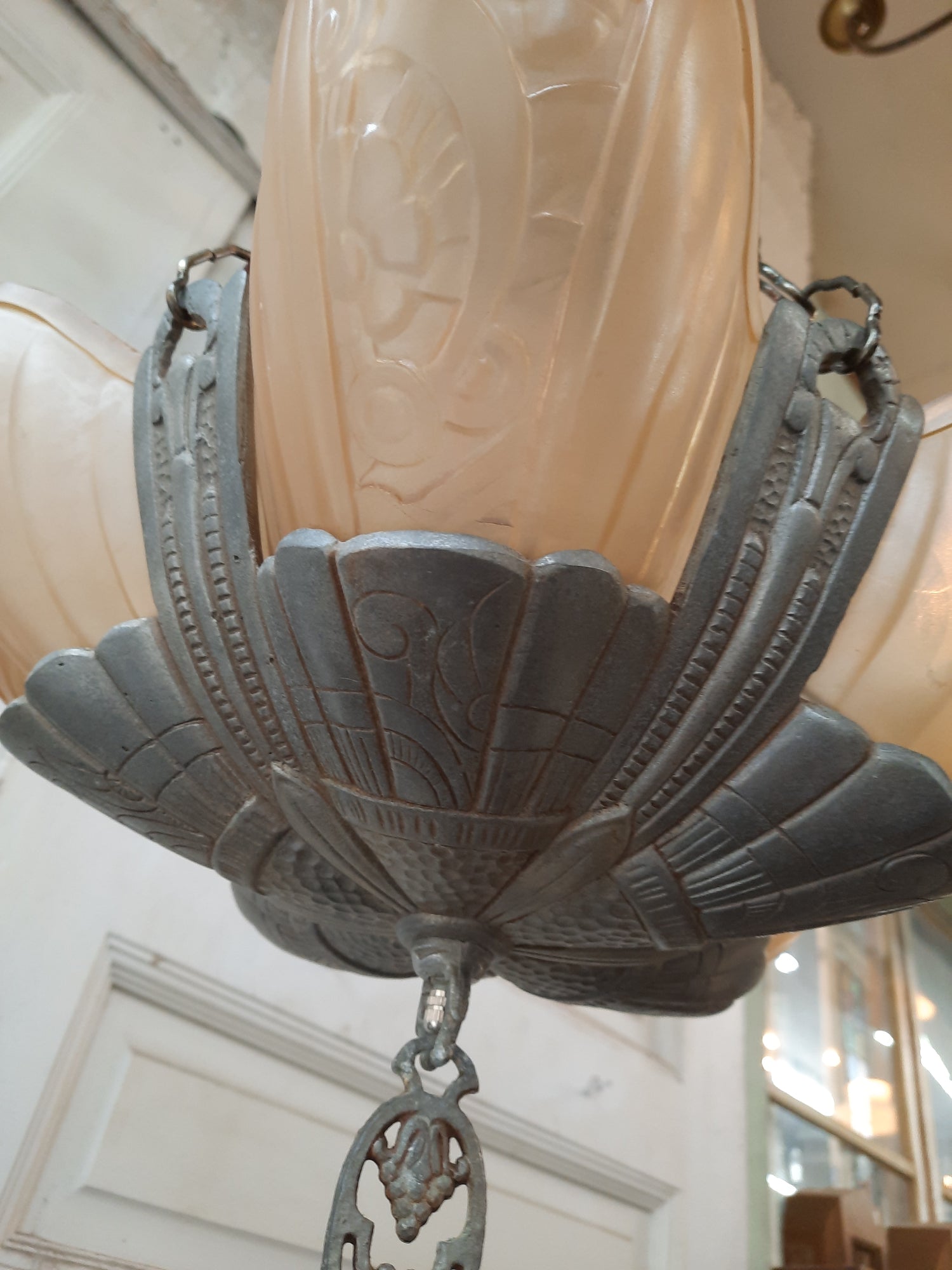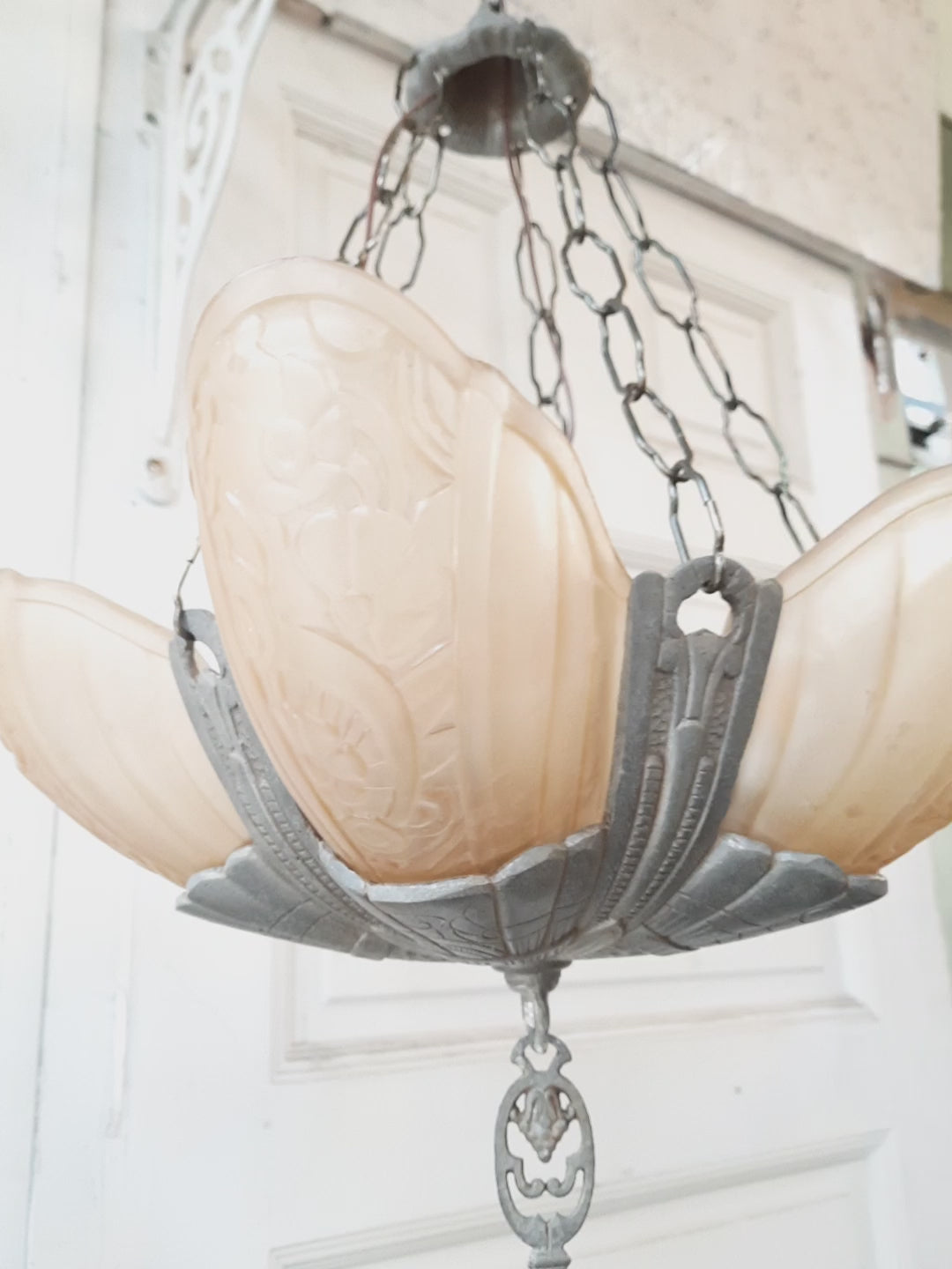 1930s Slip Shade Chandelier, Art Deco Slipper Shade Light with Peach Pink Glass Shades