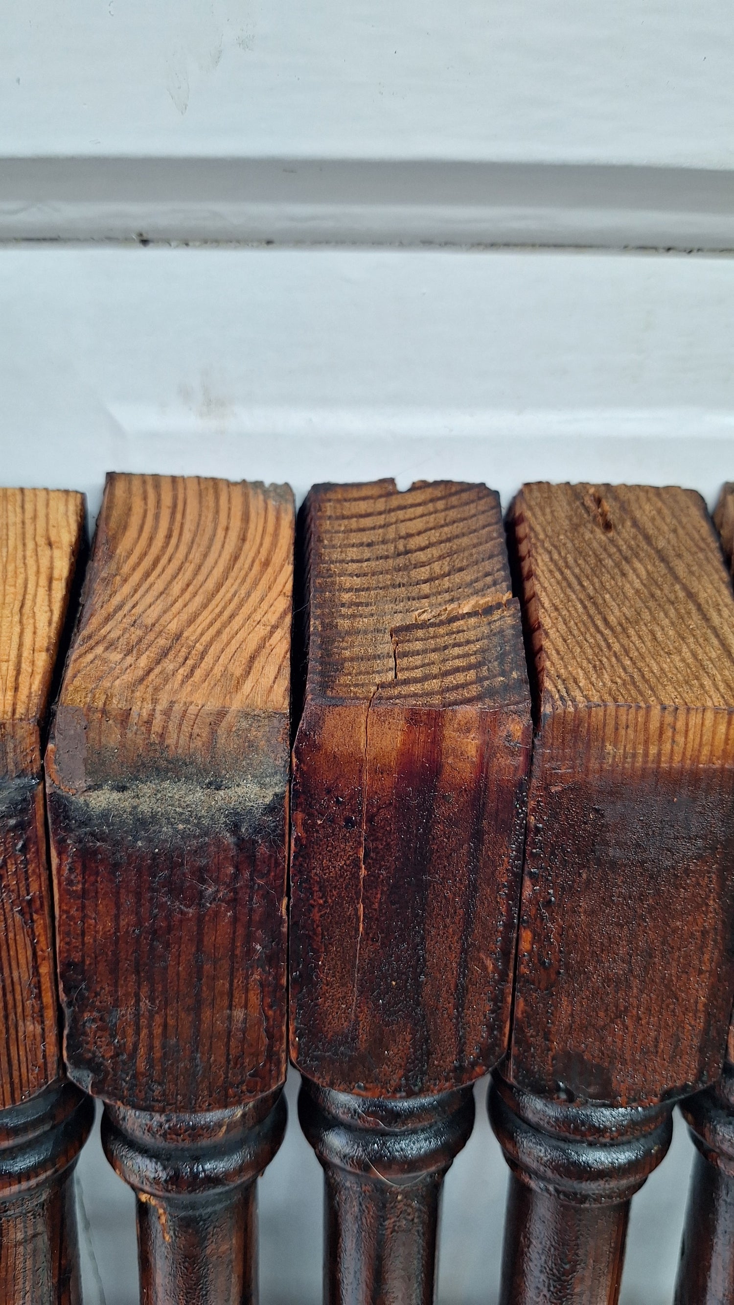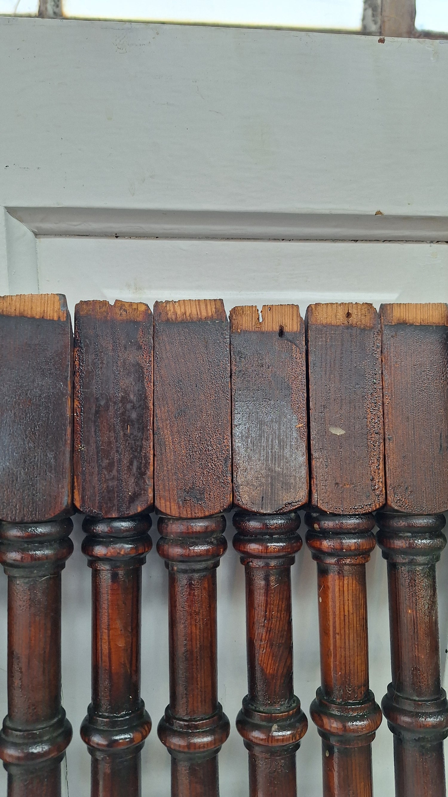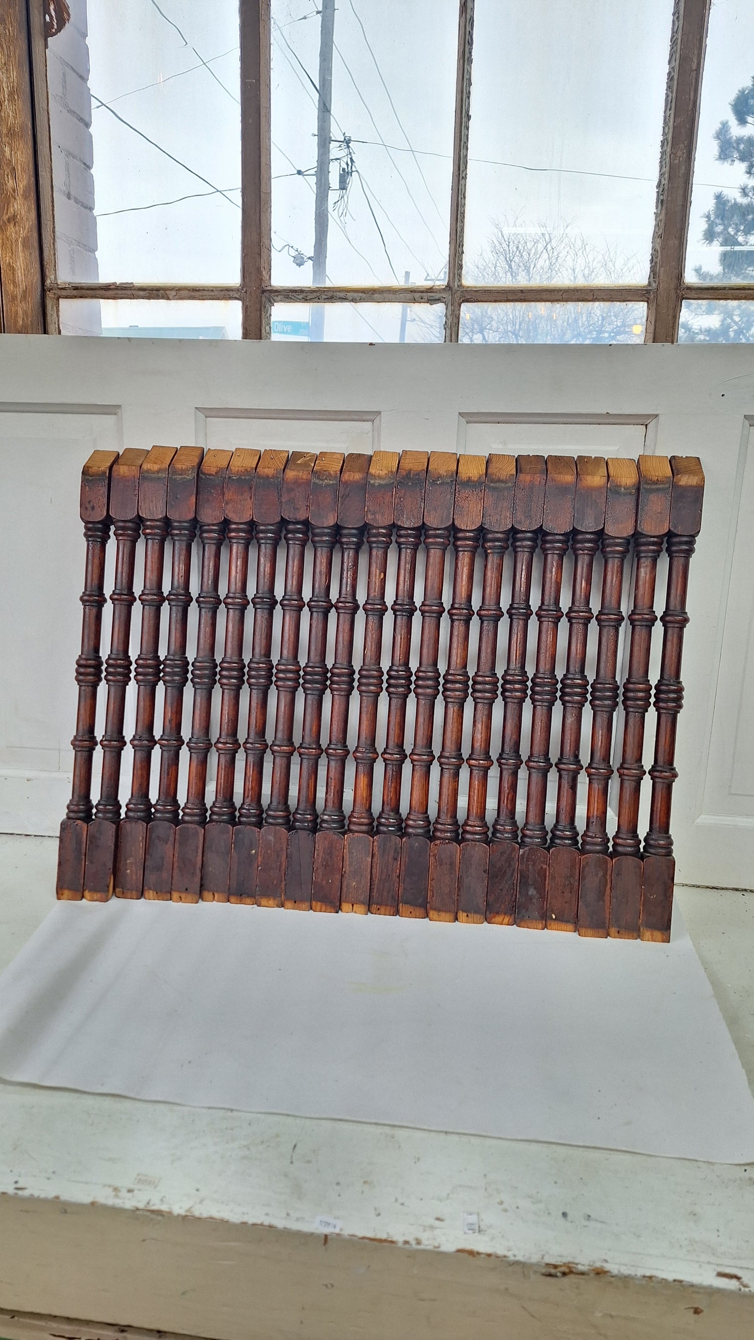 A set of 21 matching Victorian era spindles with the original unpainted finish. These are late 1800s turned style spindles and would be perfect for a restoration or upcycle project. This set is in 'as found' condition, there are imperfections in the finish as shown and nail holes in the bottoms from installation. The finish is 'alligatored' as shown and some have a few spots of white paint. Two spindles have a split in the wood and two have damaged to the turned section as shown. Please see all of our pictures for close ups and sizing on this set. This set ships free within the continental US. No PO boxes please.
