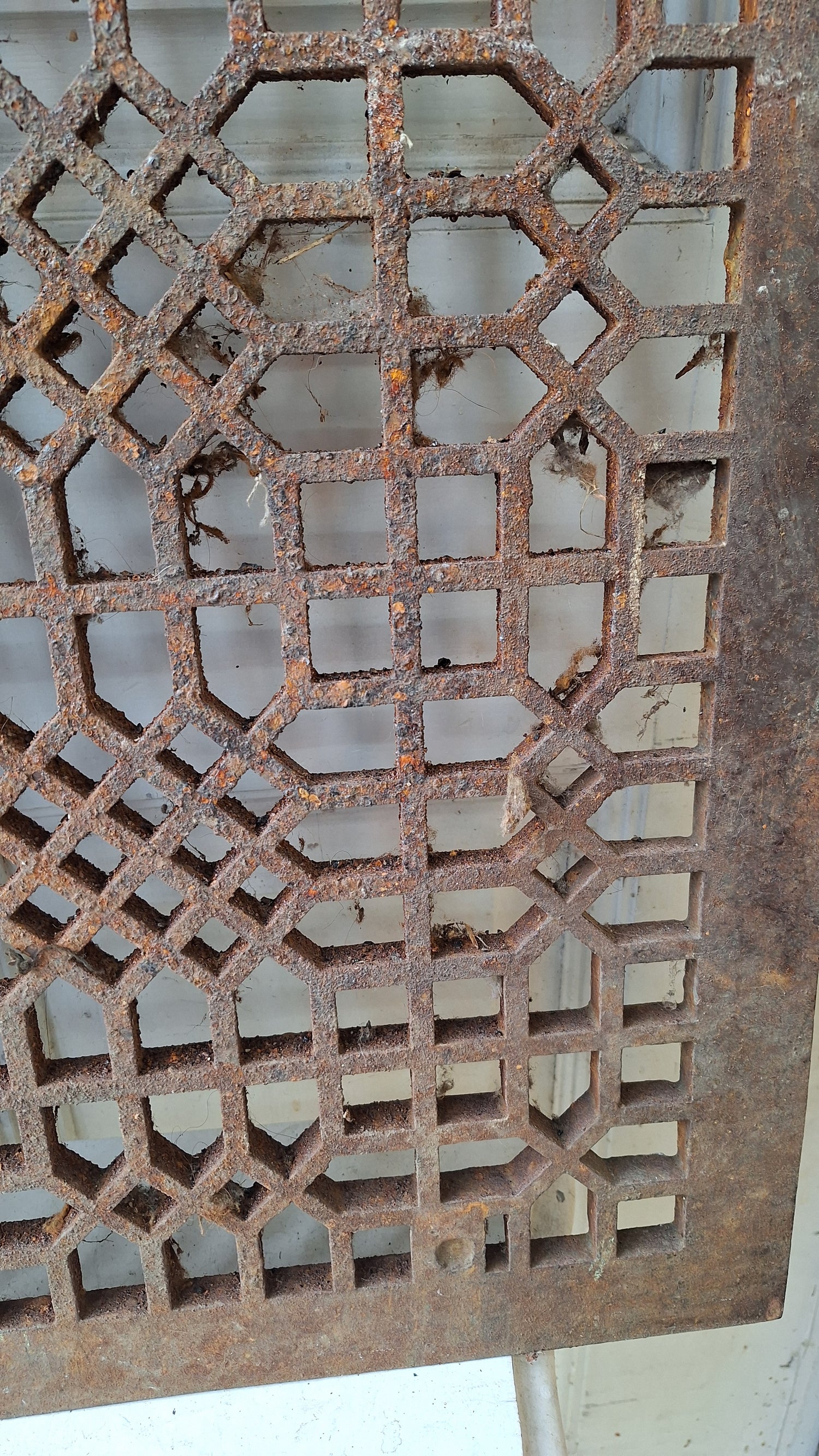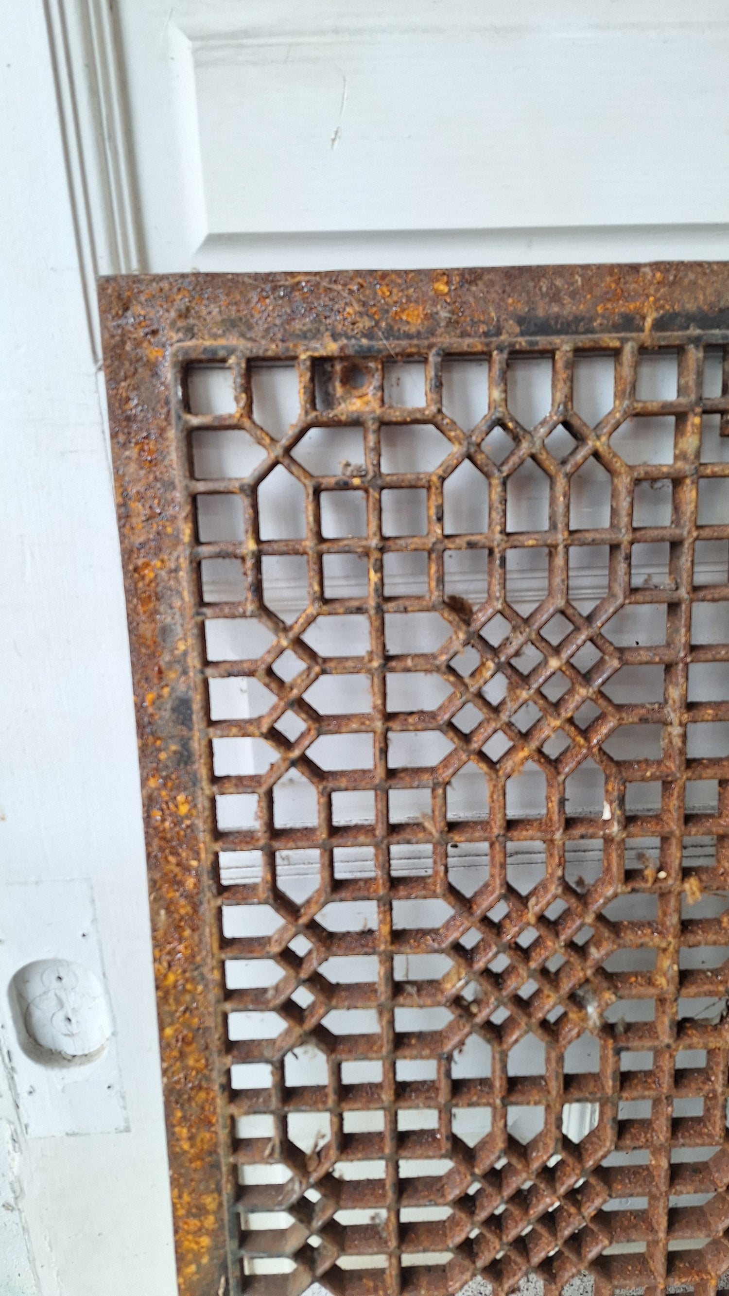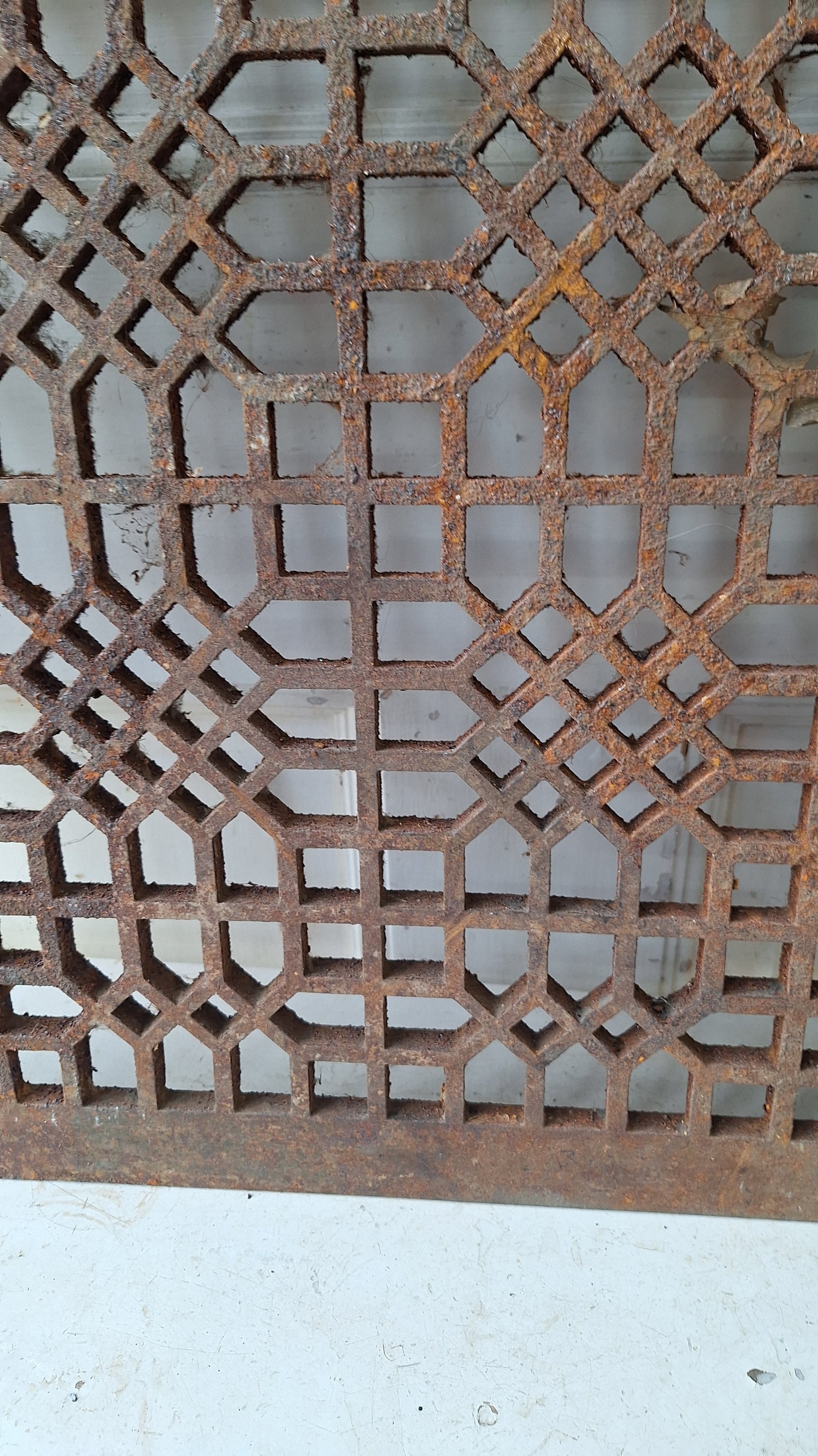 An extra large sized antique iron floor grate from a Victorian era home. These large sized grates are used for covers on cold air returns in floors. This piece is made from very durable, heavy cast iron and is in very good condition. They also make excellent table tops. This piece is in 'as found' condition and will need cleaning before installation. Many buyers opt to clean and refinish for a fresh look.