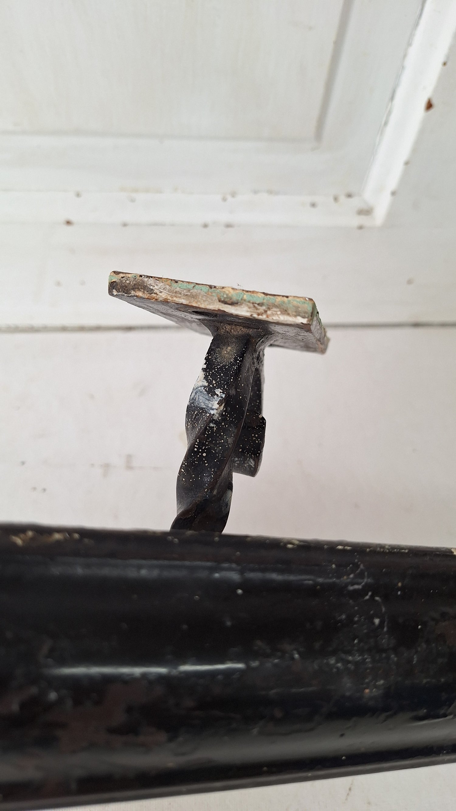 A 1930s era iron railing with wrought supports from a church building. The handrail has an elegant profile supported with twisted, wrought iron scroll brackets. The finishes have imperfections like small areas of missing paint or spots of white paint. Please see all of our pictures for details.