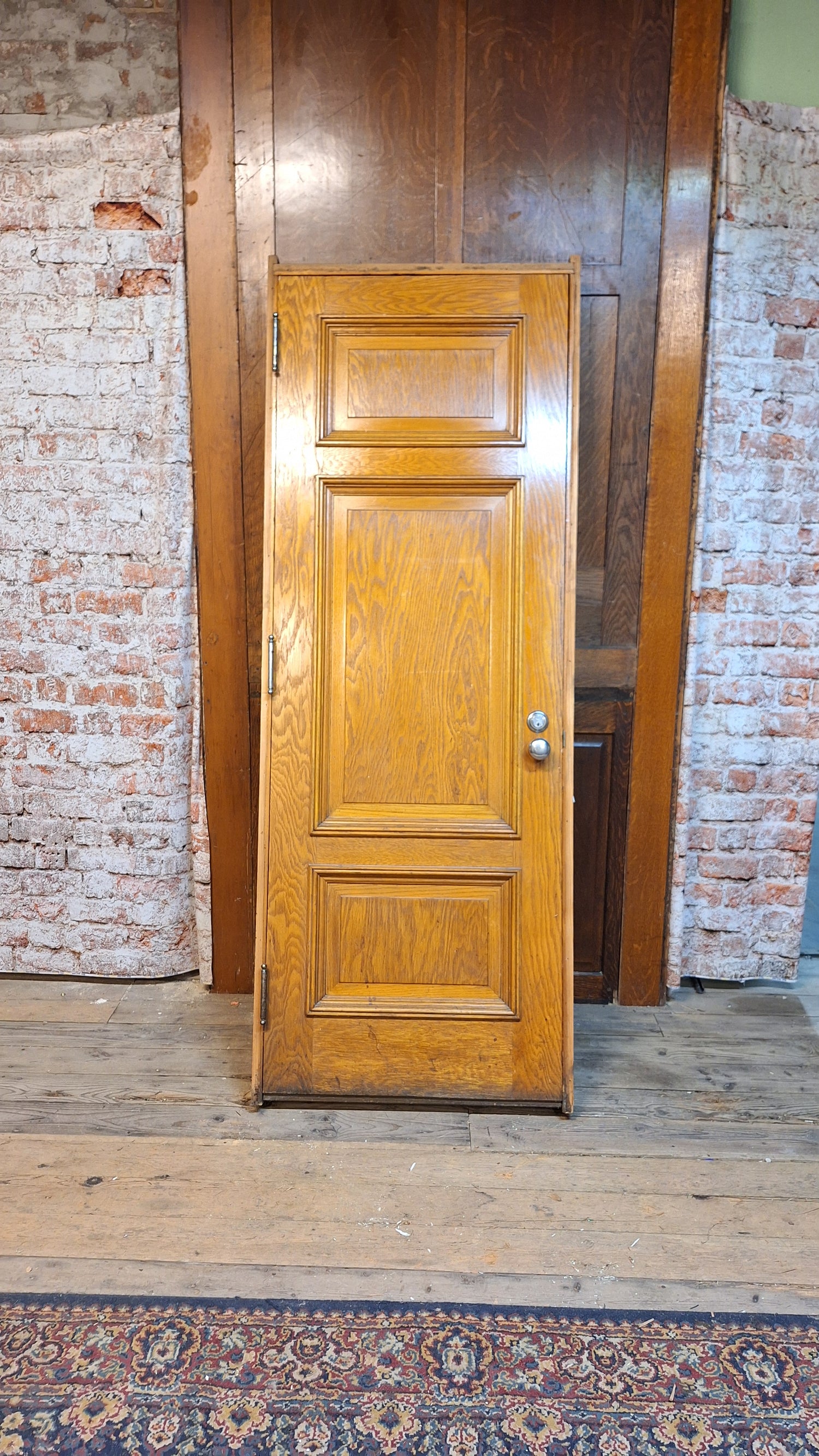 This antique door measures 32" wide by 86 1/4" tall with the frame; frame is 5 1/8" thick. The door itself is 29 7/8" wide by 83 1/2" tall. This door ships free within the continental US. Please allow 2-3 weeks handling time. It can also be picked up from our warehouse for a discounted price.