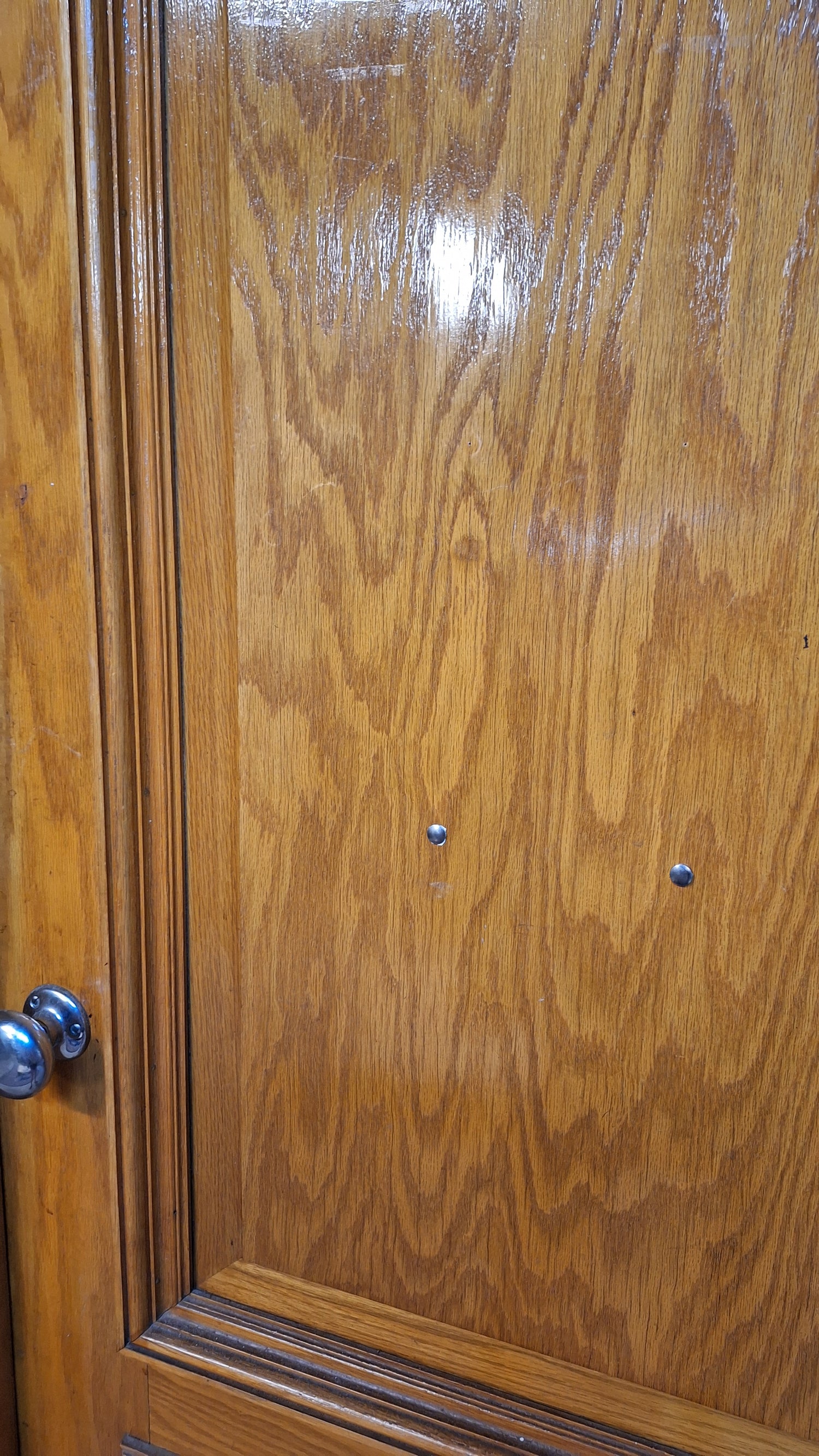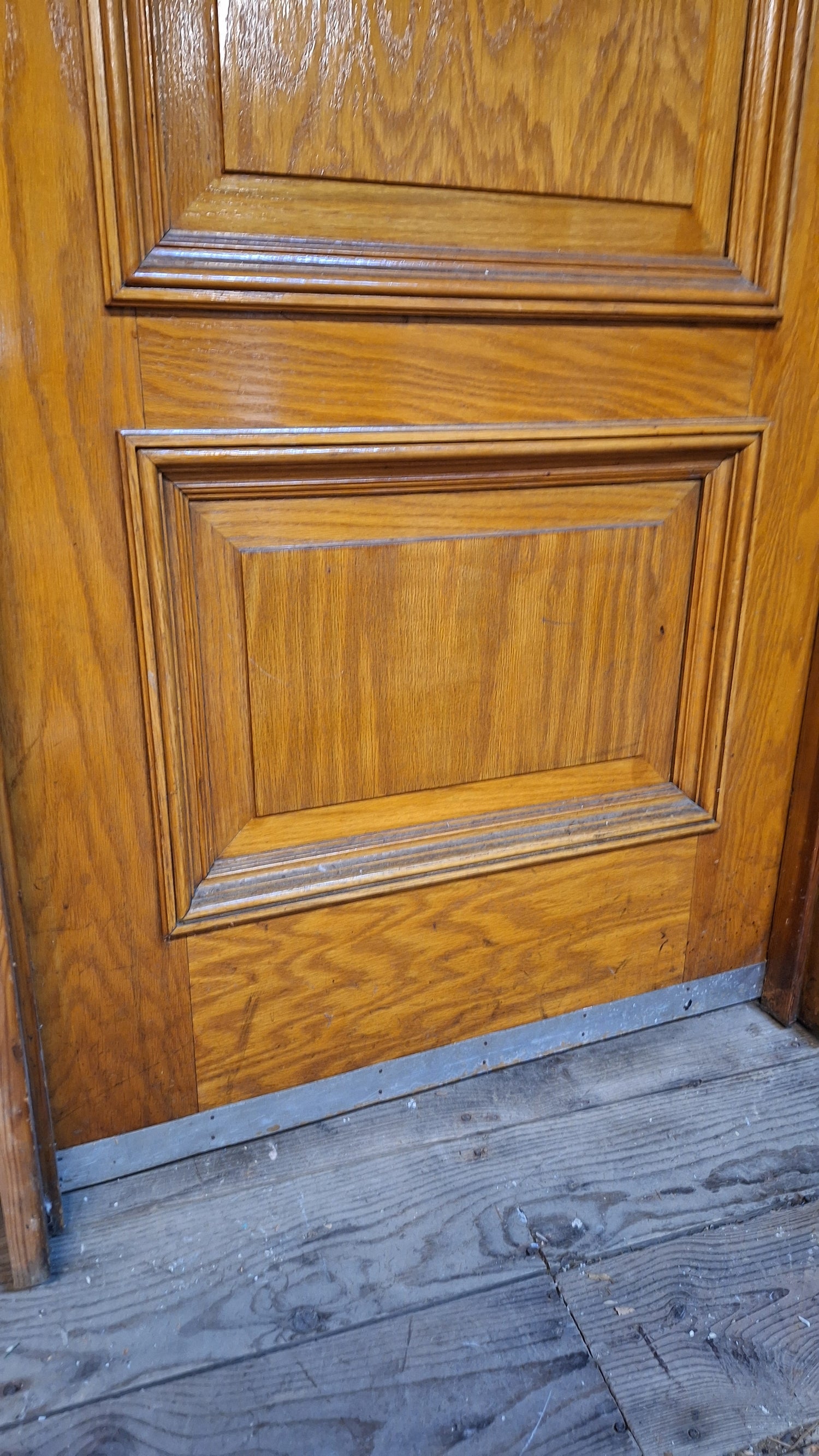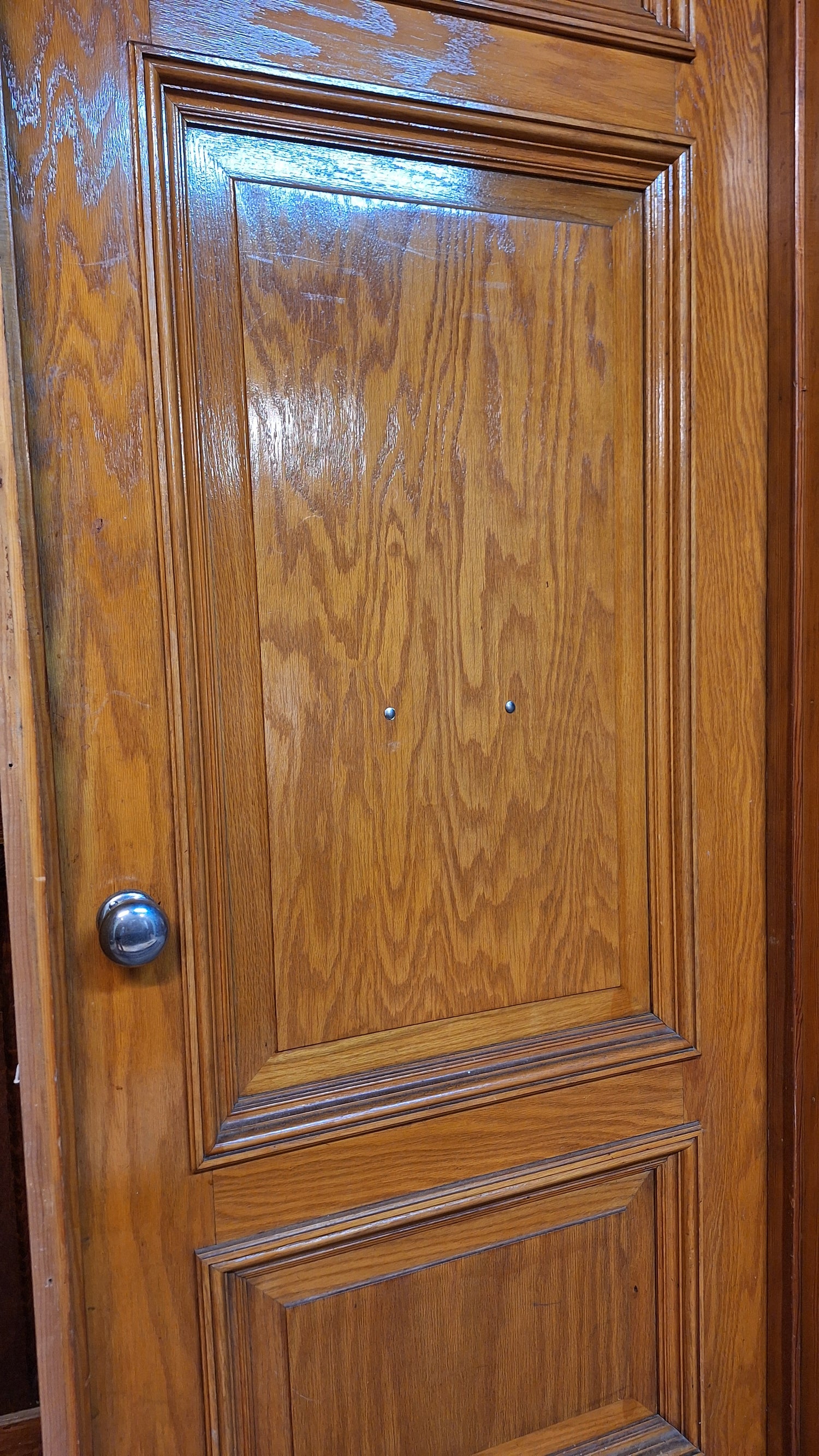 A solid wood, antique door with beautiful raised panels with molded trim borders. This door has stenciled gold numbers at the top on one side. It comes with a jamb and hardware including hinges, mortise lock, rosettes and knobs. There are some darker areas in the wood as shown and a split in the surface of the wood panel at the top. Please see all of our pictures for details. We have additional doors in this style. Please see our shop section Antique Doors or message us for links.