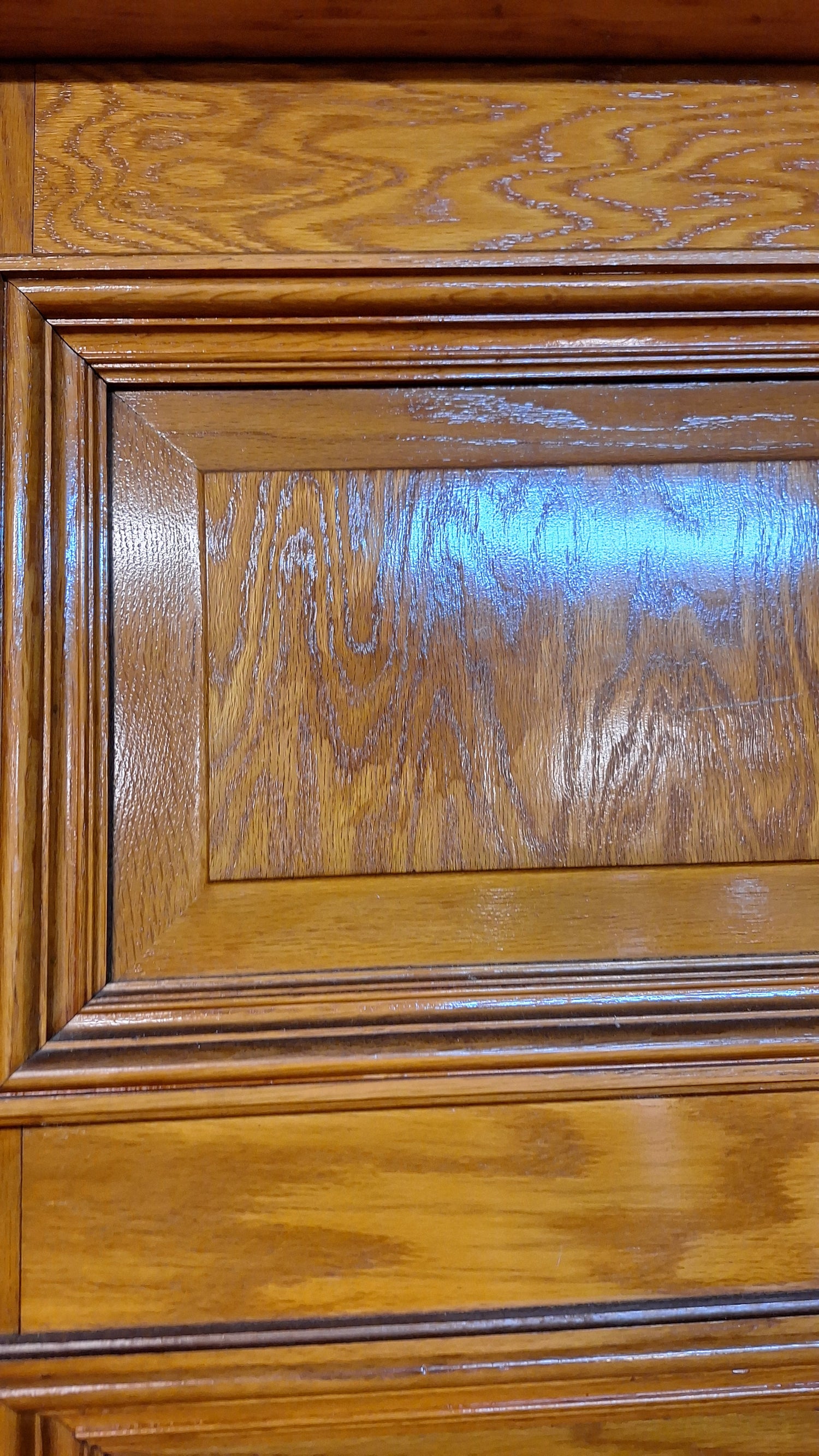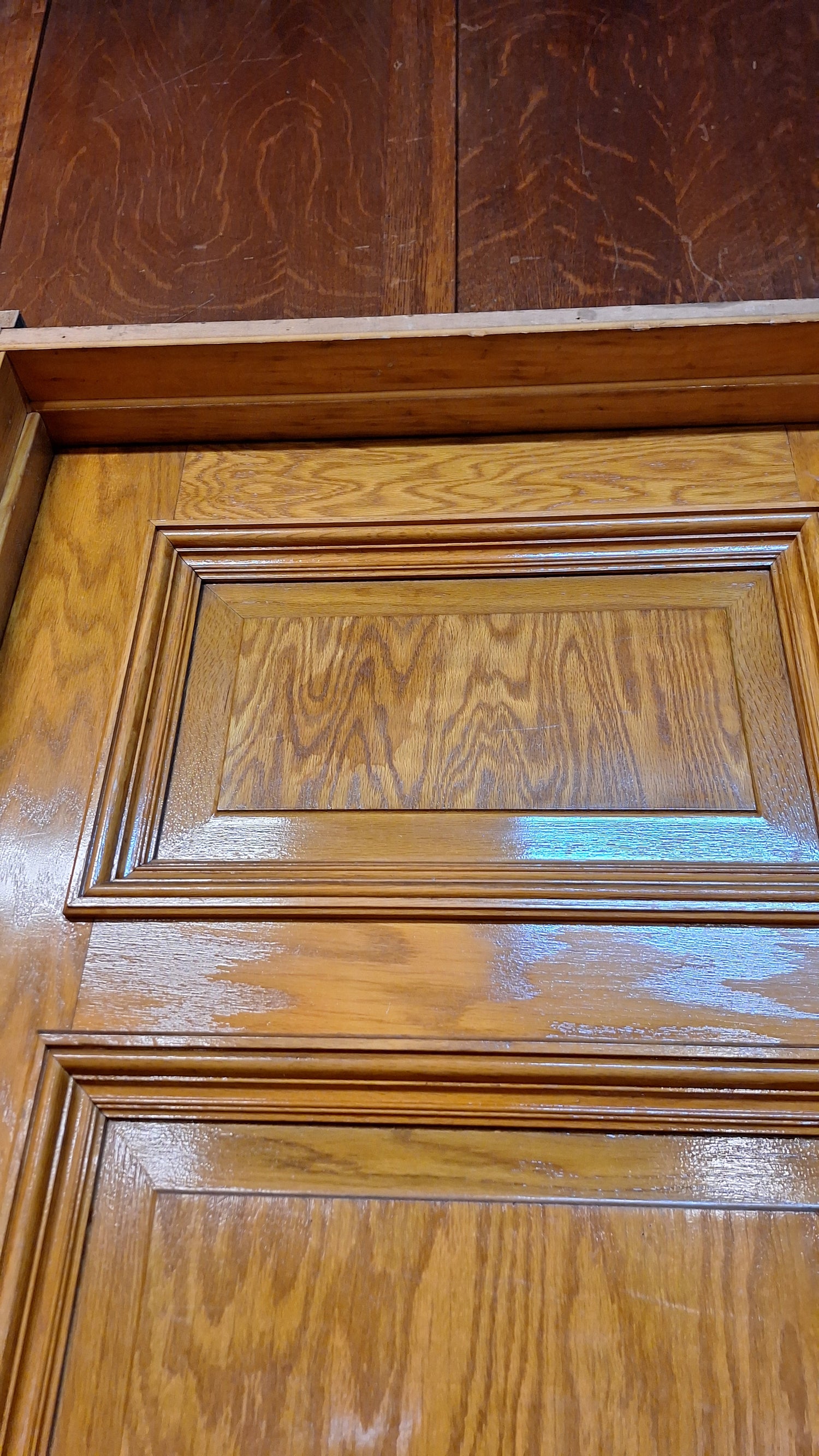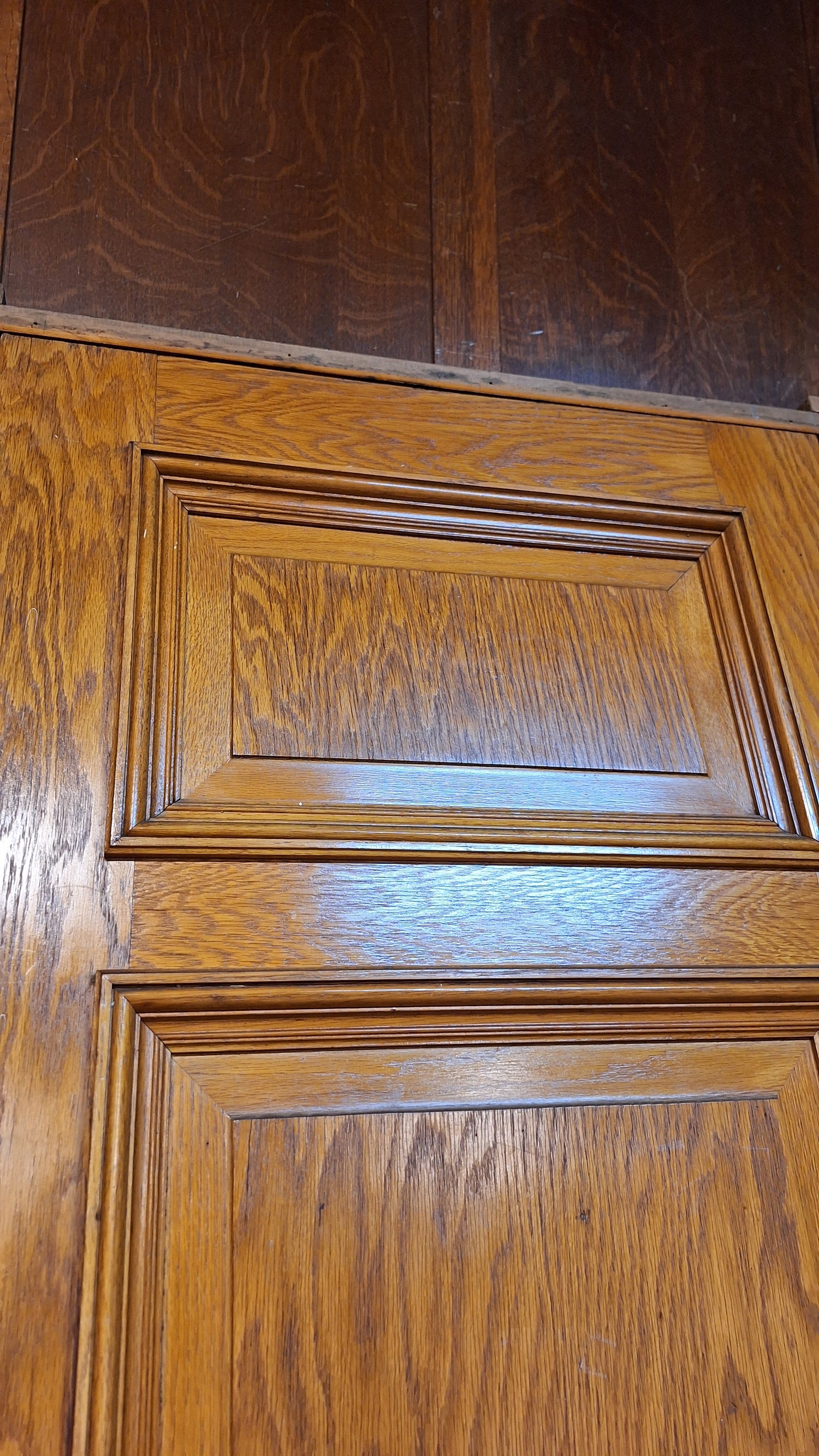 A solid wood, antique door with beautiful raised panels with molded trim borders. This door has stenciled gold numbers at the top on one side. It comes with a jamb and hardware including hinges, mortise lock, rosettes and knobs. There are some darker areas in the wood as shown and a split in the surface of the wood panel at the top. Please see all of our pictures for details. We have additional doors in this style. Please see our shop section Antique Doors or message us for links.