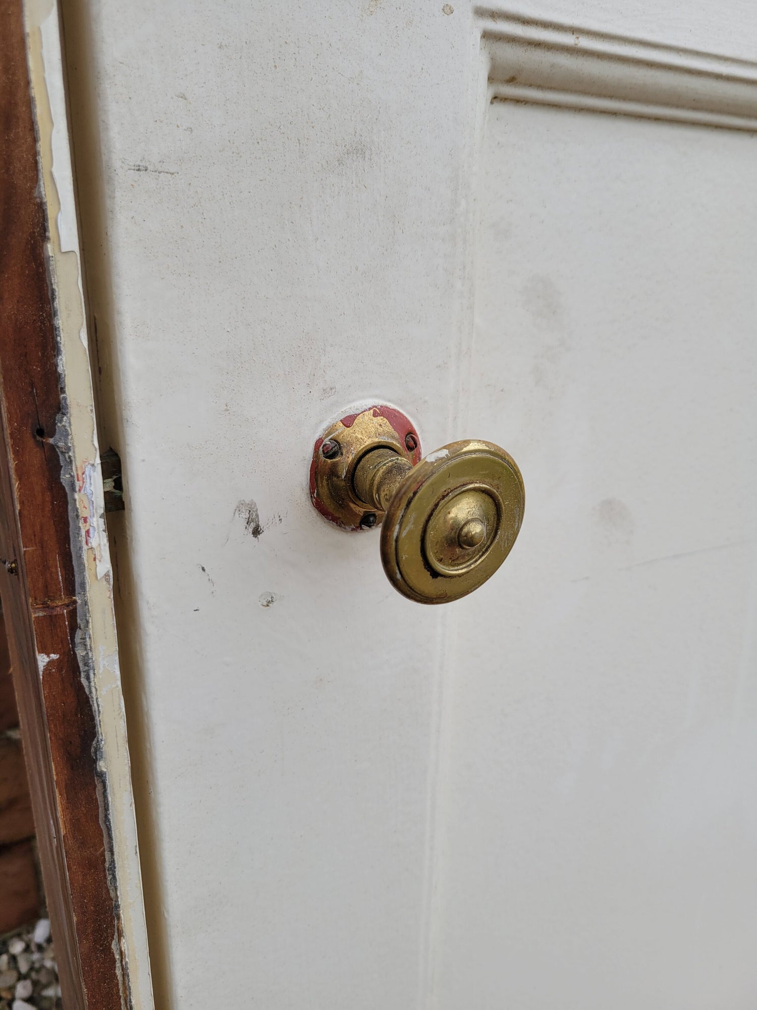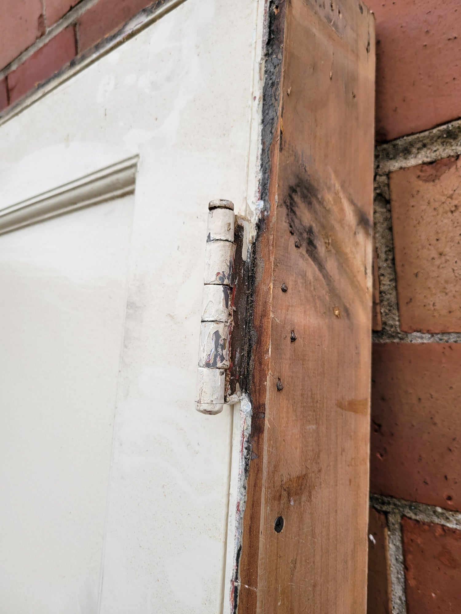 An simple, but stately two paneled door from a 1920/30s Chicago apartment which was removed for a remodel. We have many sizes of similar style doors available; perfect for a new house build or a remodel of an existing space. This door is painted a crisp white and comes with all of the hinges, lock, and doorknob. The hardware is very nice quality although two of the brass steeple tips from a hinge is missing (does not affect functioning). It is in its original jamb making installation much simpler. We do not know the species of wood due to the painted finish.