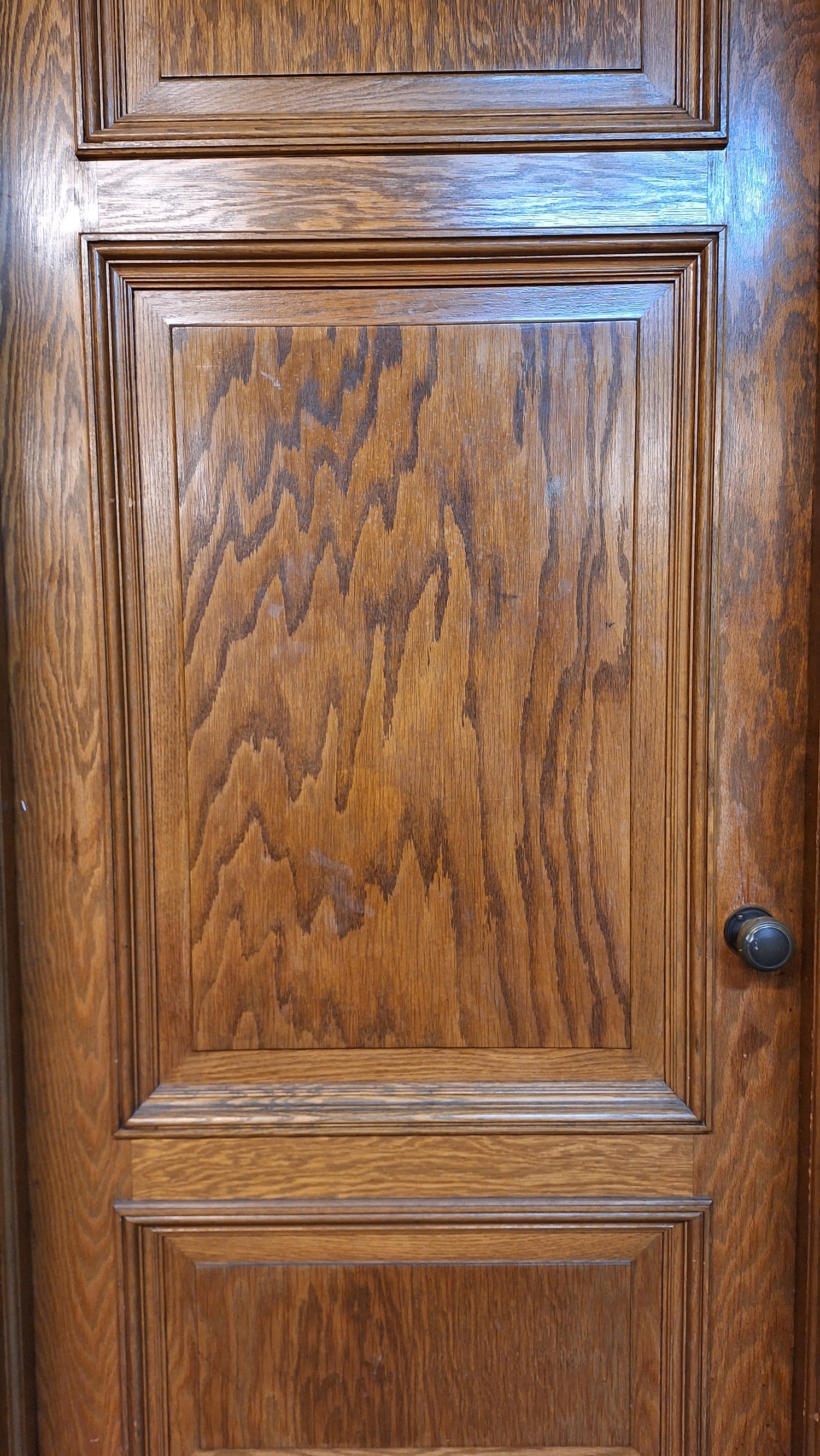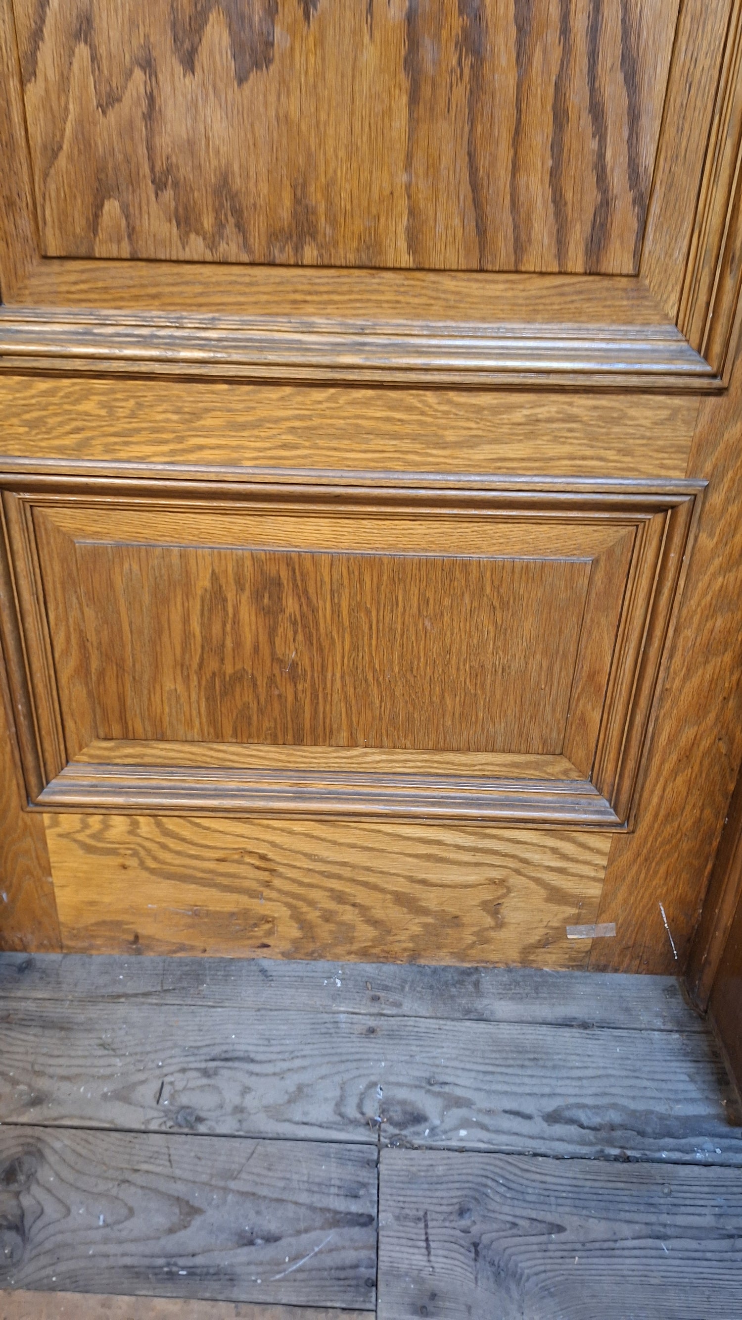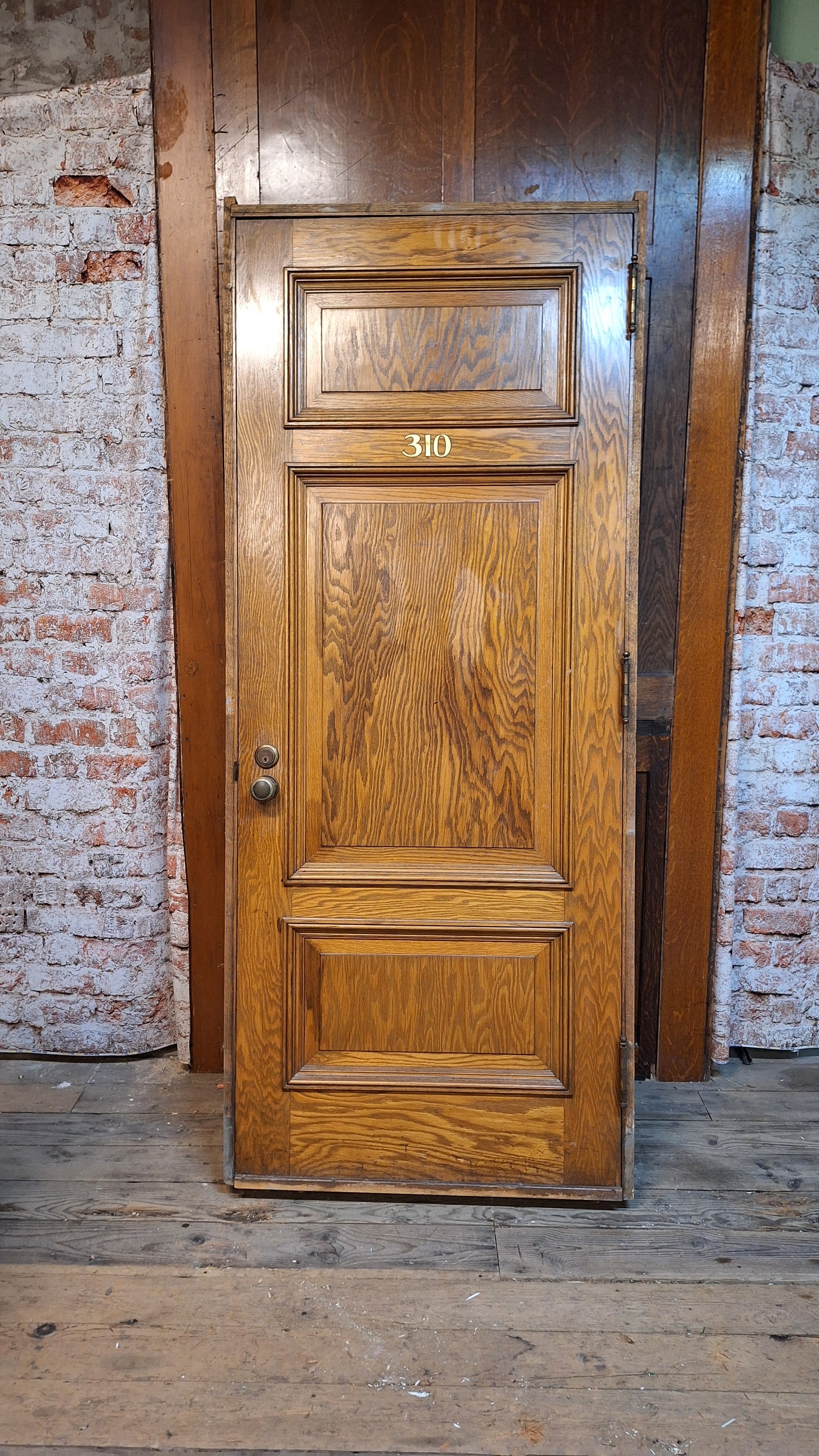 A solid wood, antique door with beautiful raised panels with molded trim borders. This door has stenciled gold numbers at the top on one side. It comes with a heavy, extra thick jamb and hardware including hinges, mortise lock, rosettes and knobs. There are some dark areas in the wood as shown. Please see all of our pictures for details. We have additional doors in this style. Please see our shop section Antique Doors or message us for links.