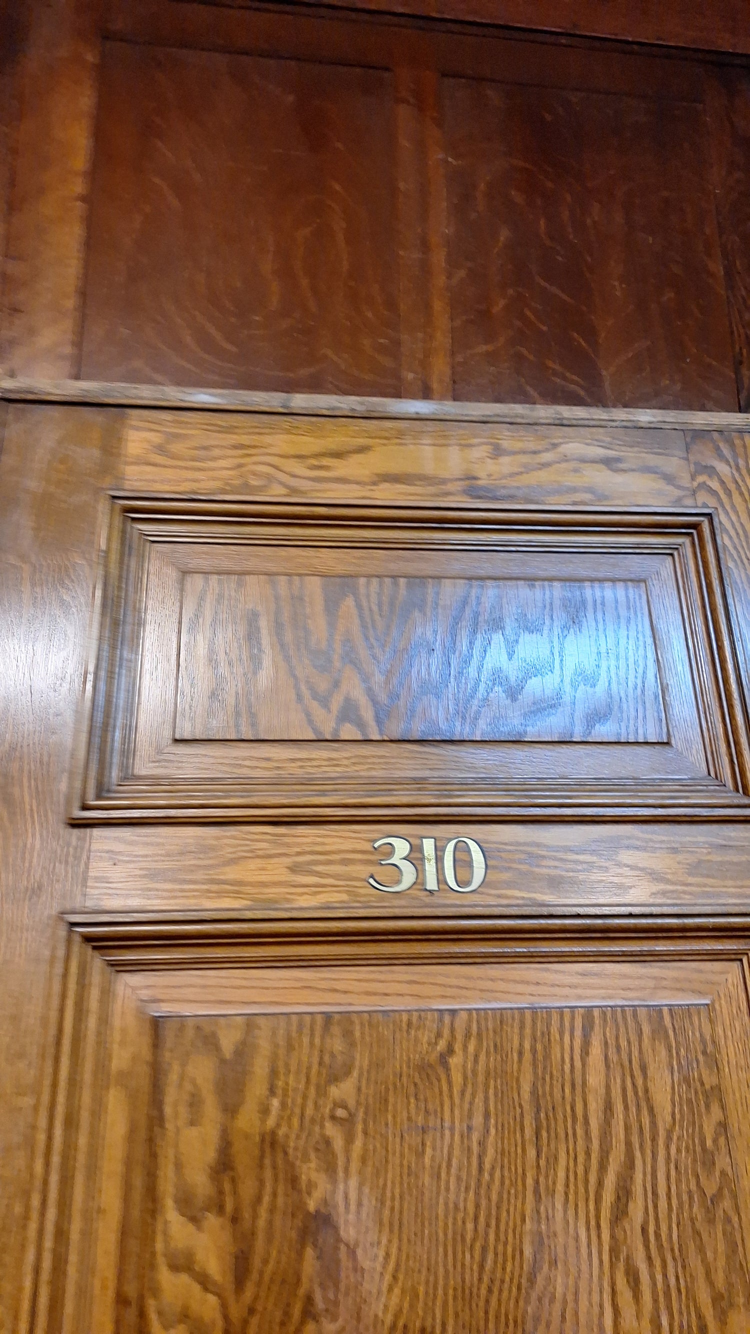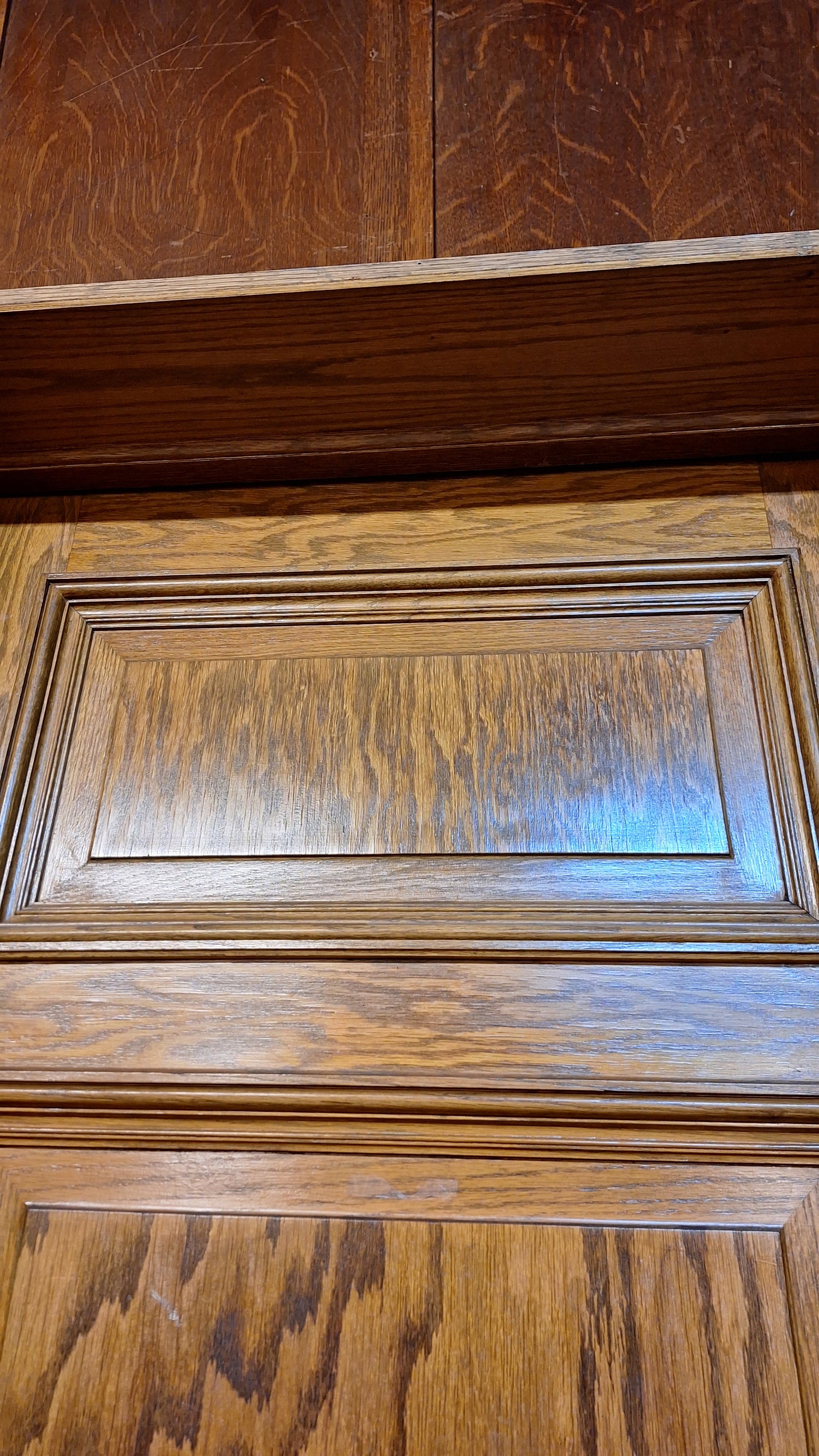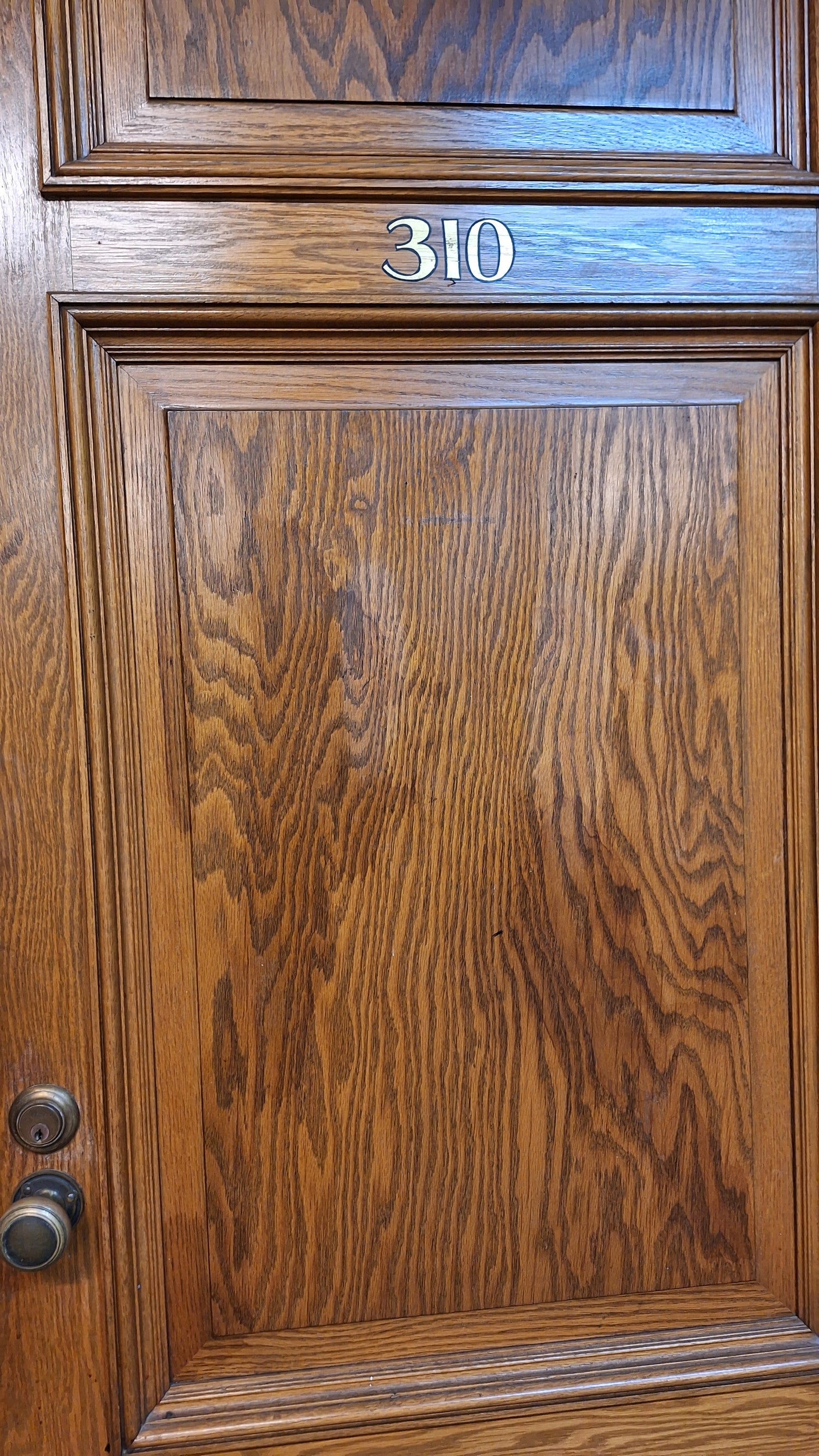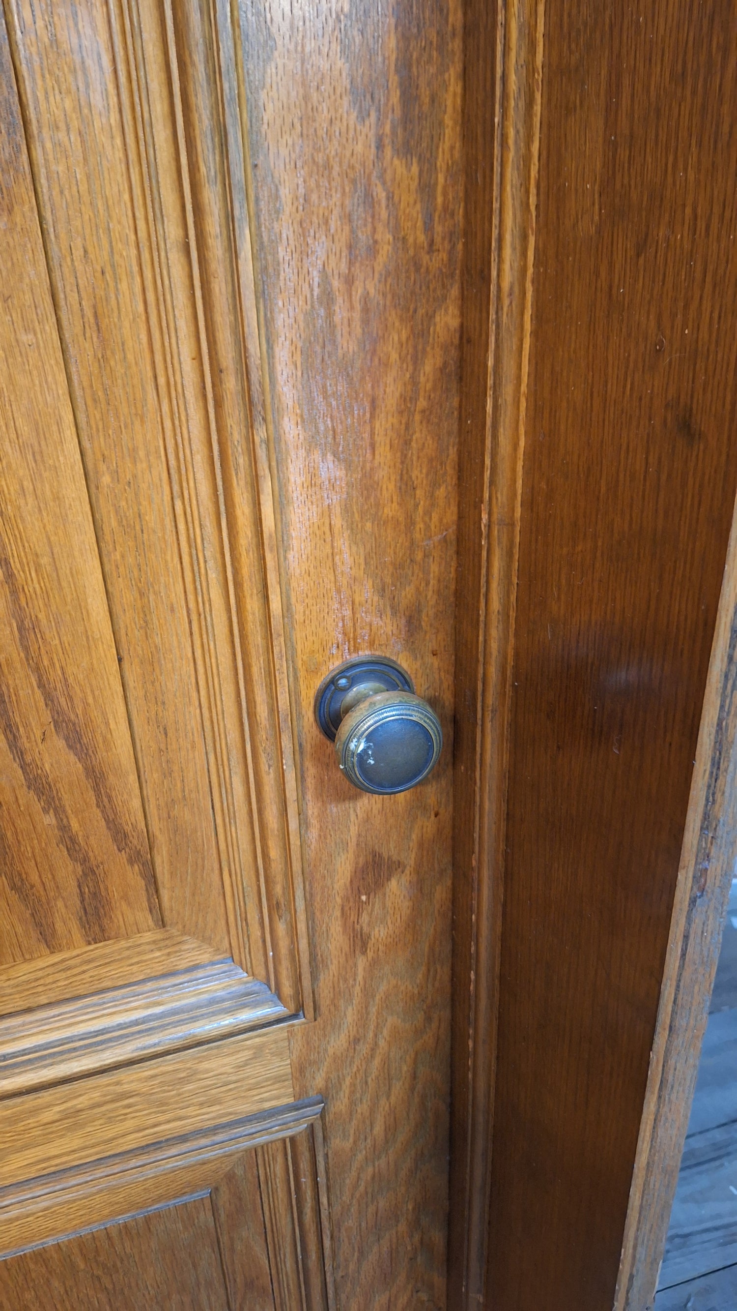 A solid wood, antique door with beautiful raised panels with molded trim borders. This door has stenciled gold numbers at the top on one side. It comes with a heavy, extra thick jamb and hardware including hinges, mortise lock, rosettes and knobs. There are some dark areas in the wood as shown. Please see all of our pictures for details. We have additional doors in this style. Please see our shop section Antique Doors or message us for links.