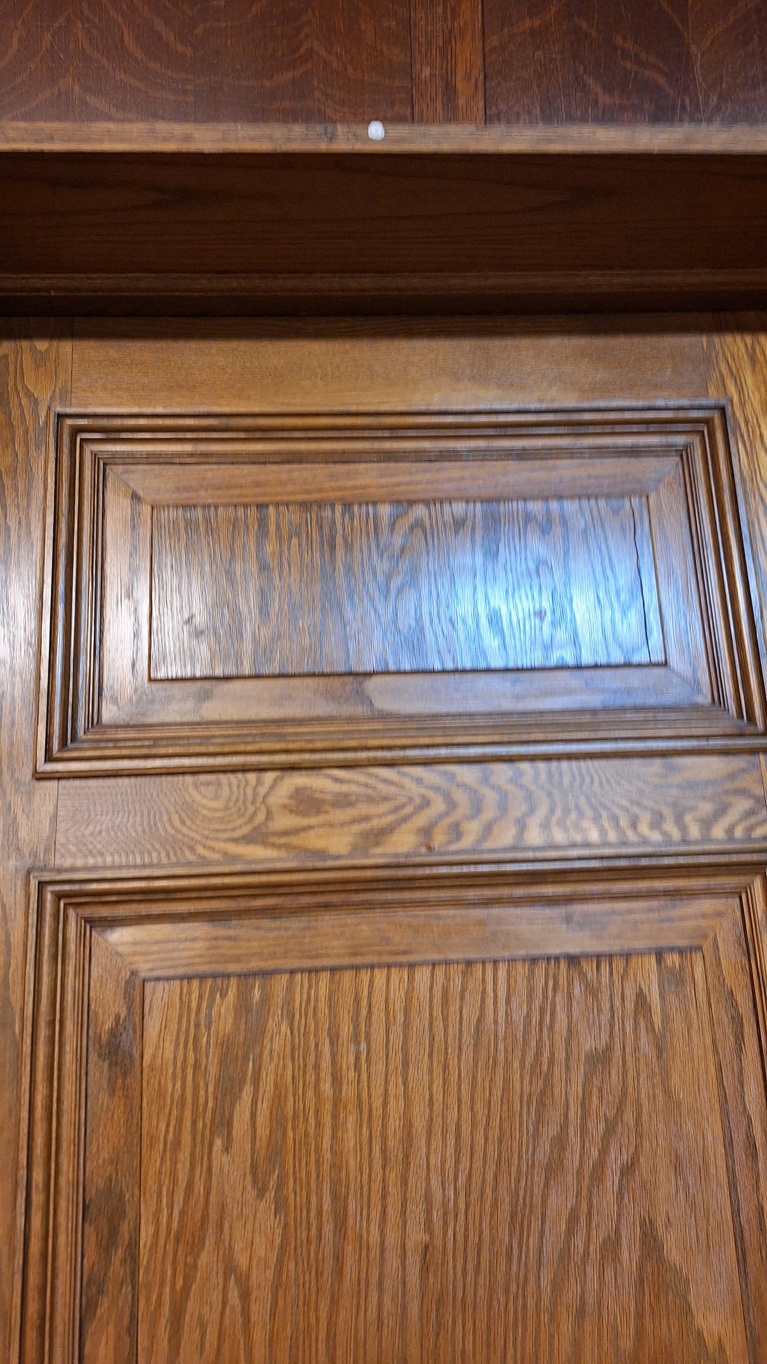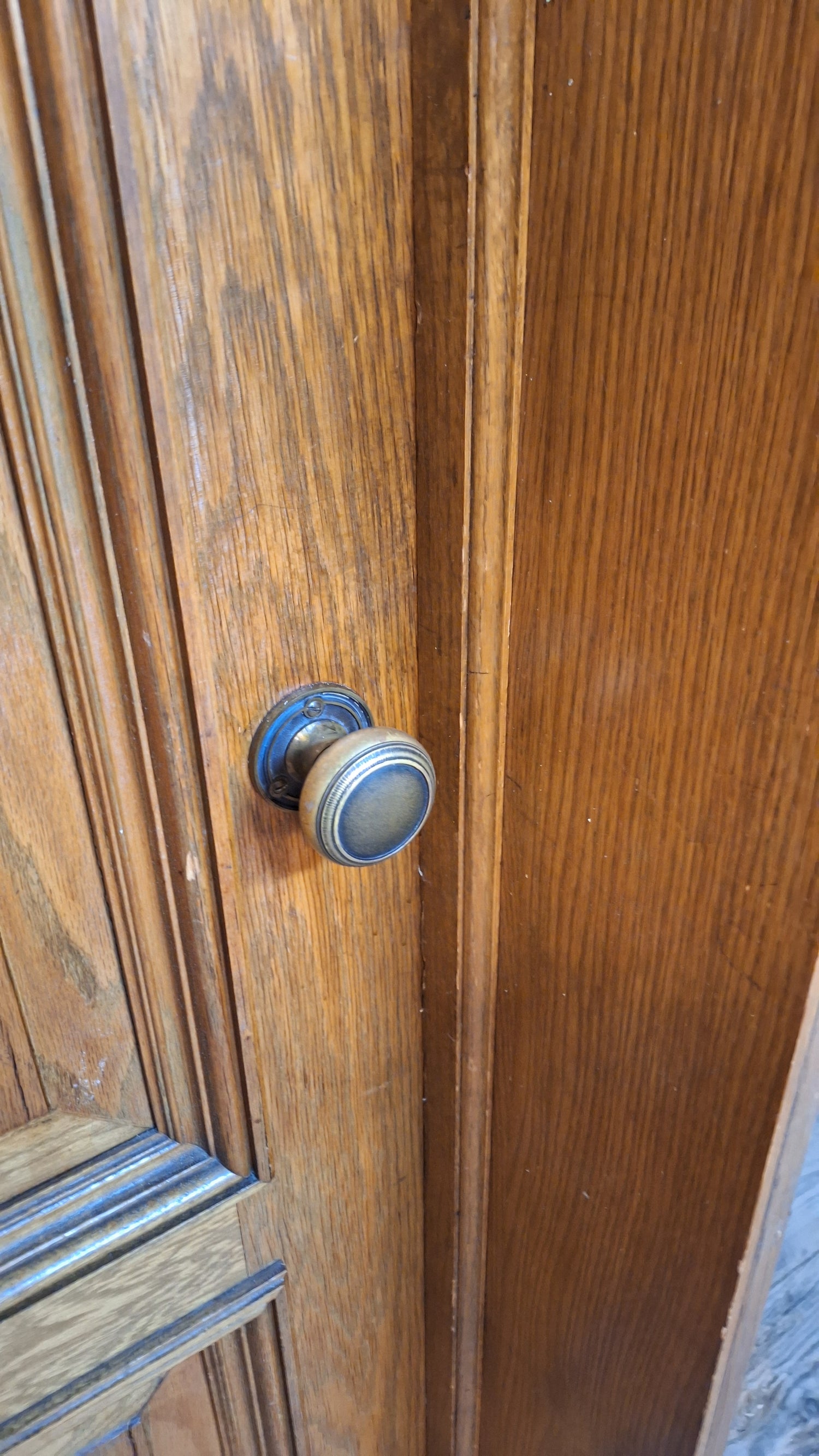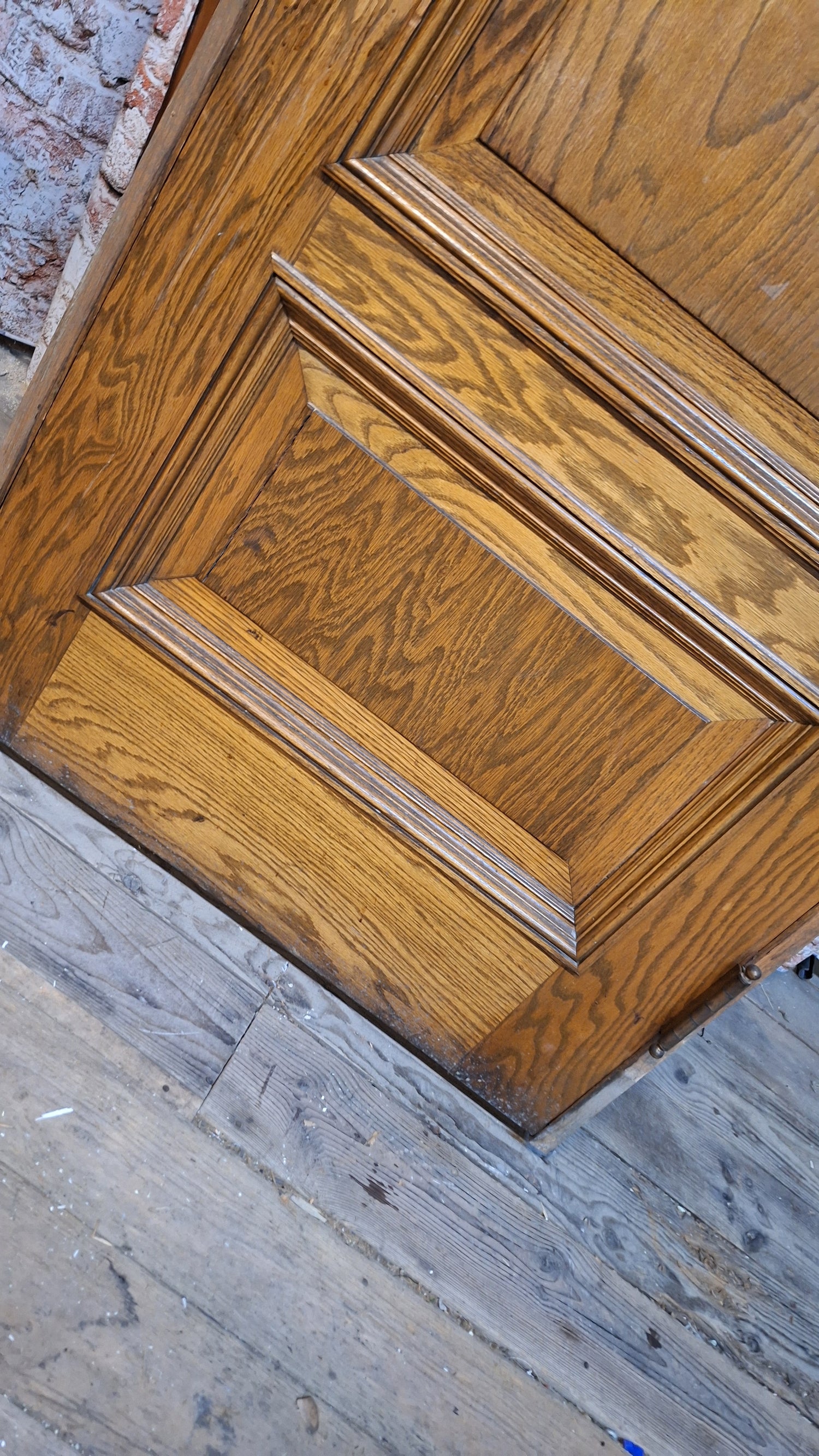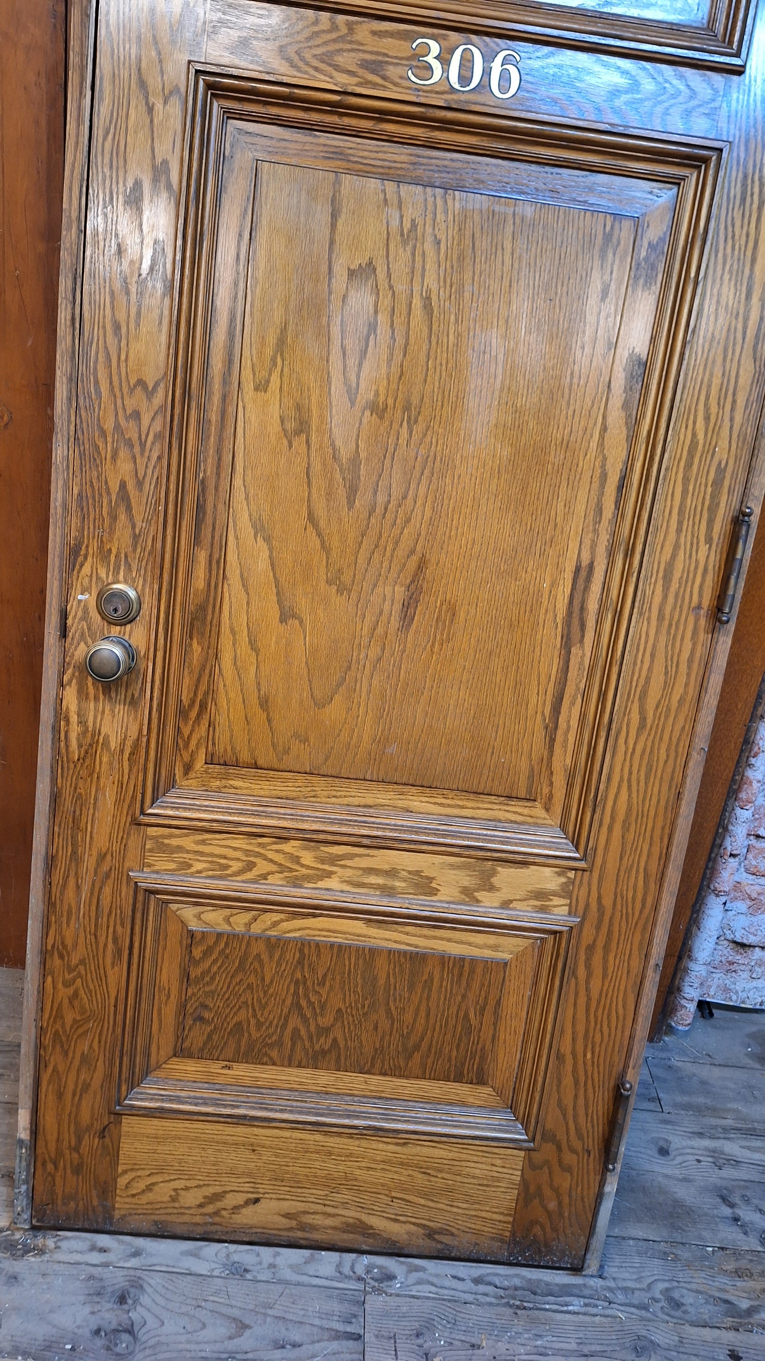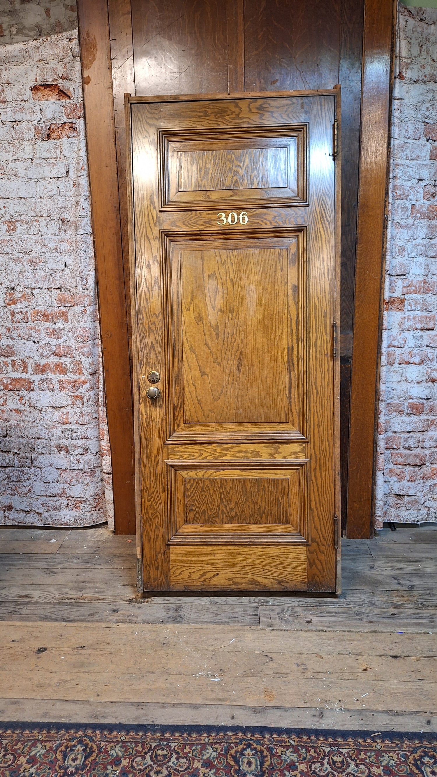 A solid wood, antique door with beautiful raised panels with molded trim borders. This door has stencilded gold numbers at the top on one side and a peep hole. It comes with a heavy, extra thick jamb and hardware including hinges, mortise lock, rosettes and knobs. There are some dark areas in the wood as shown and splits in the surface of the raised wood panels as pictures along with wear at the bottom edge. Please see all of our pictures for details. We have additional doors in this style. Please see our shop section Antique Doors or message us for links.