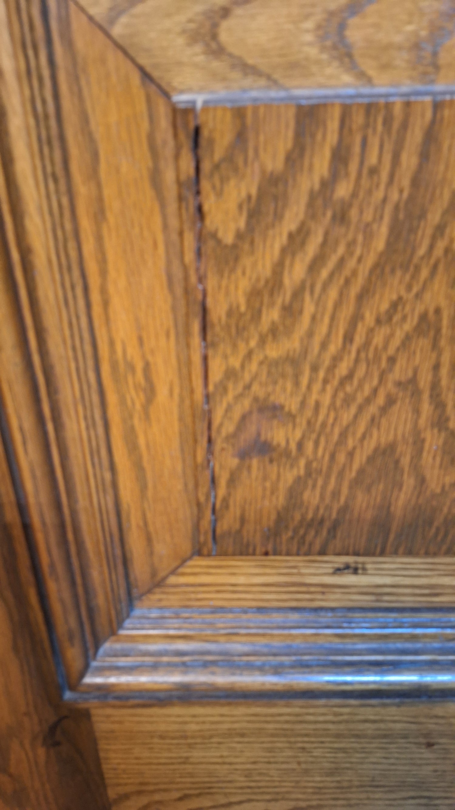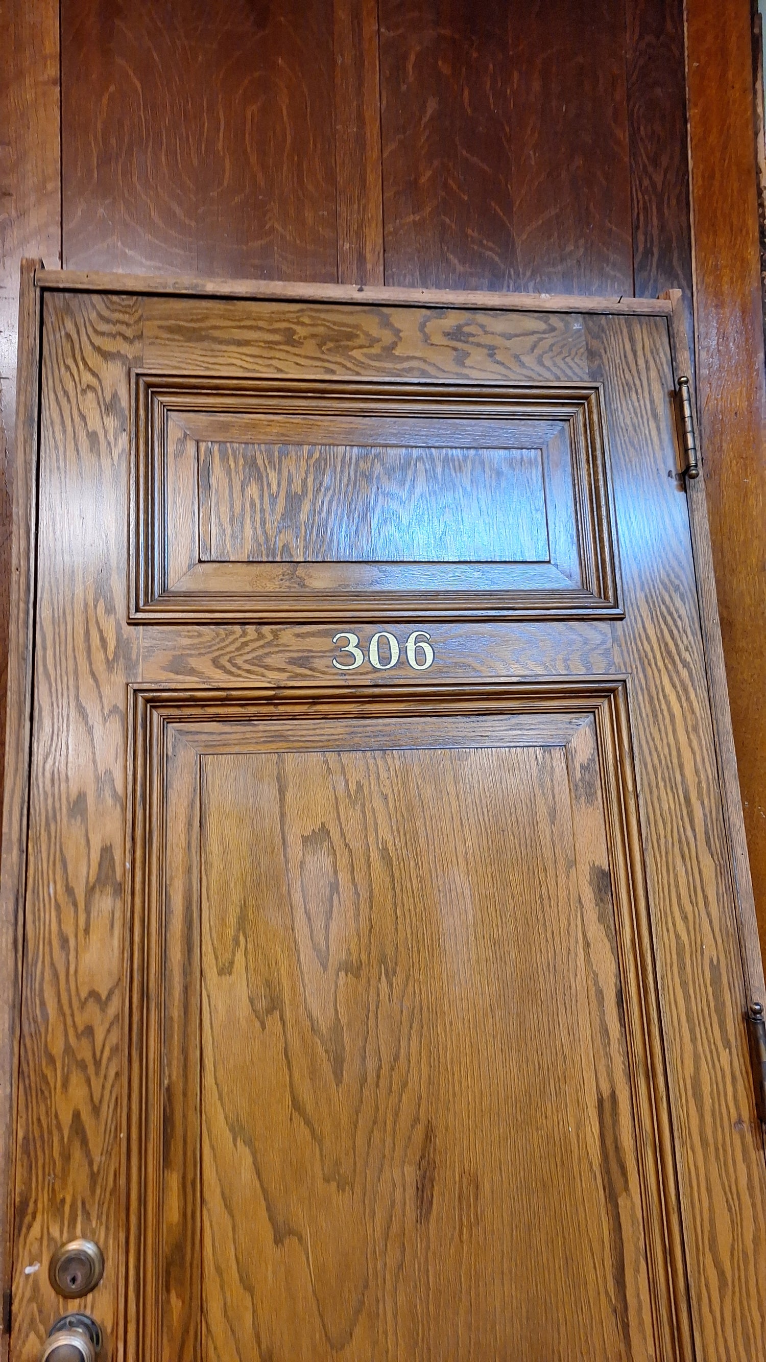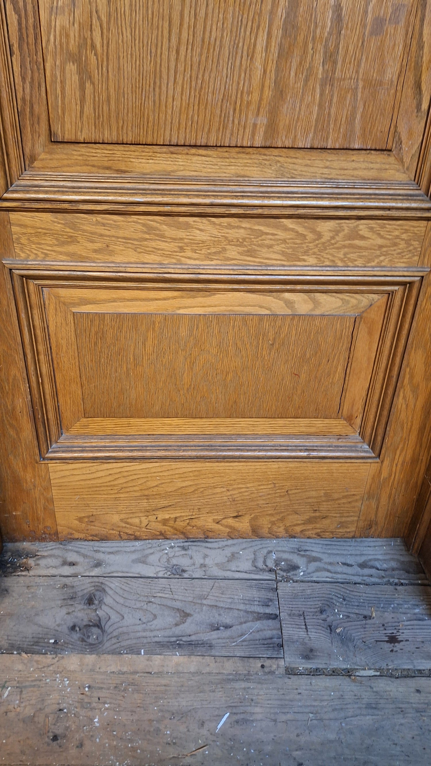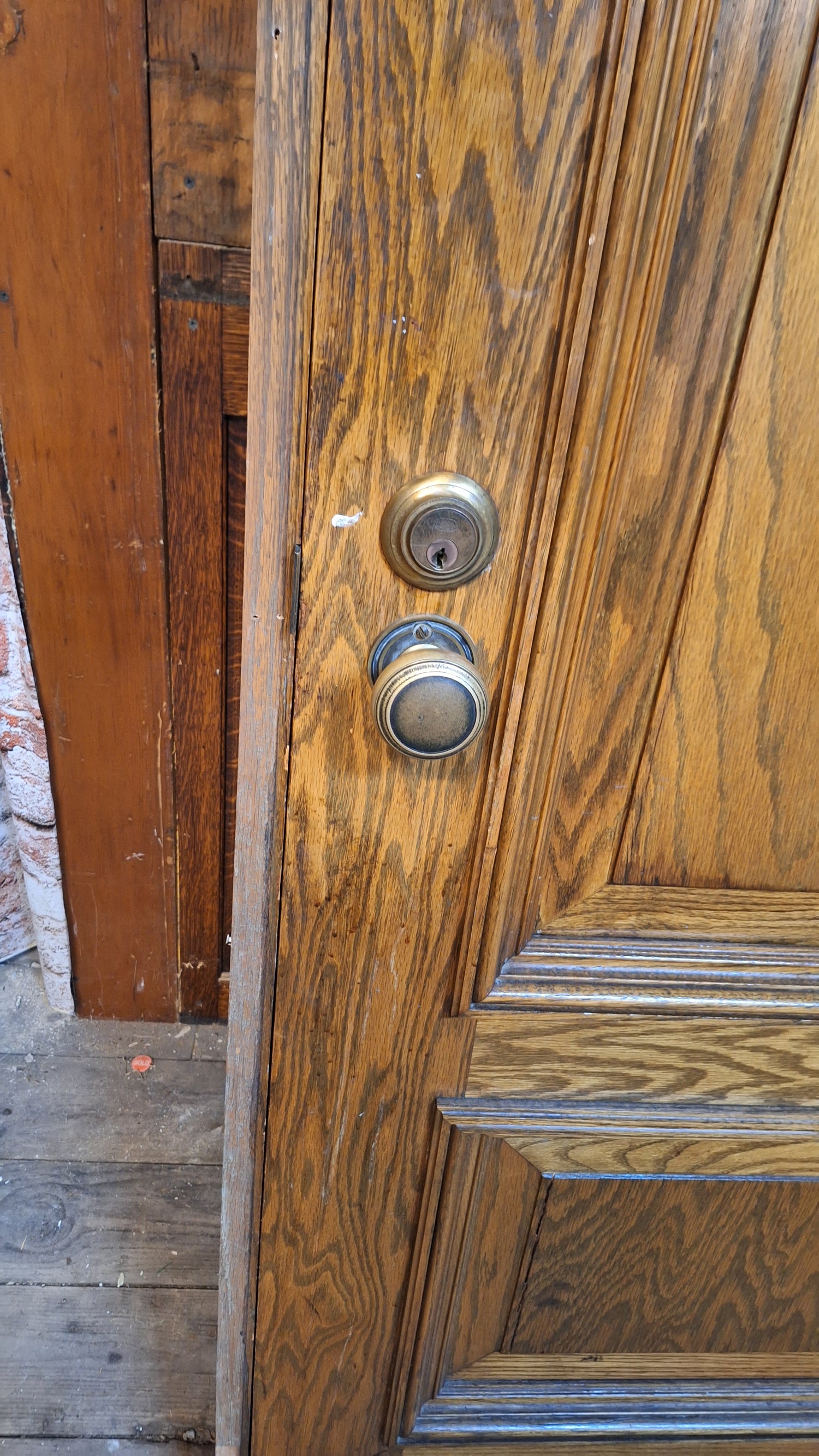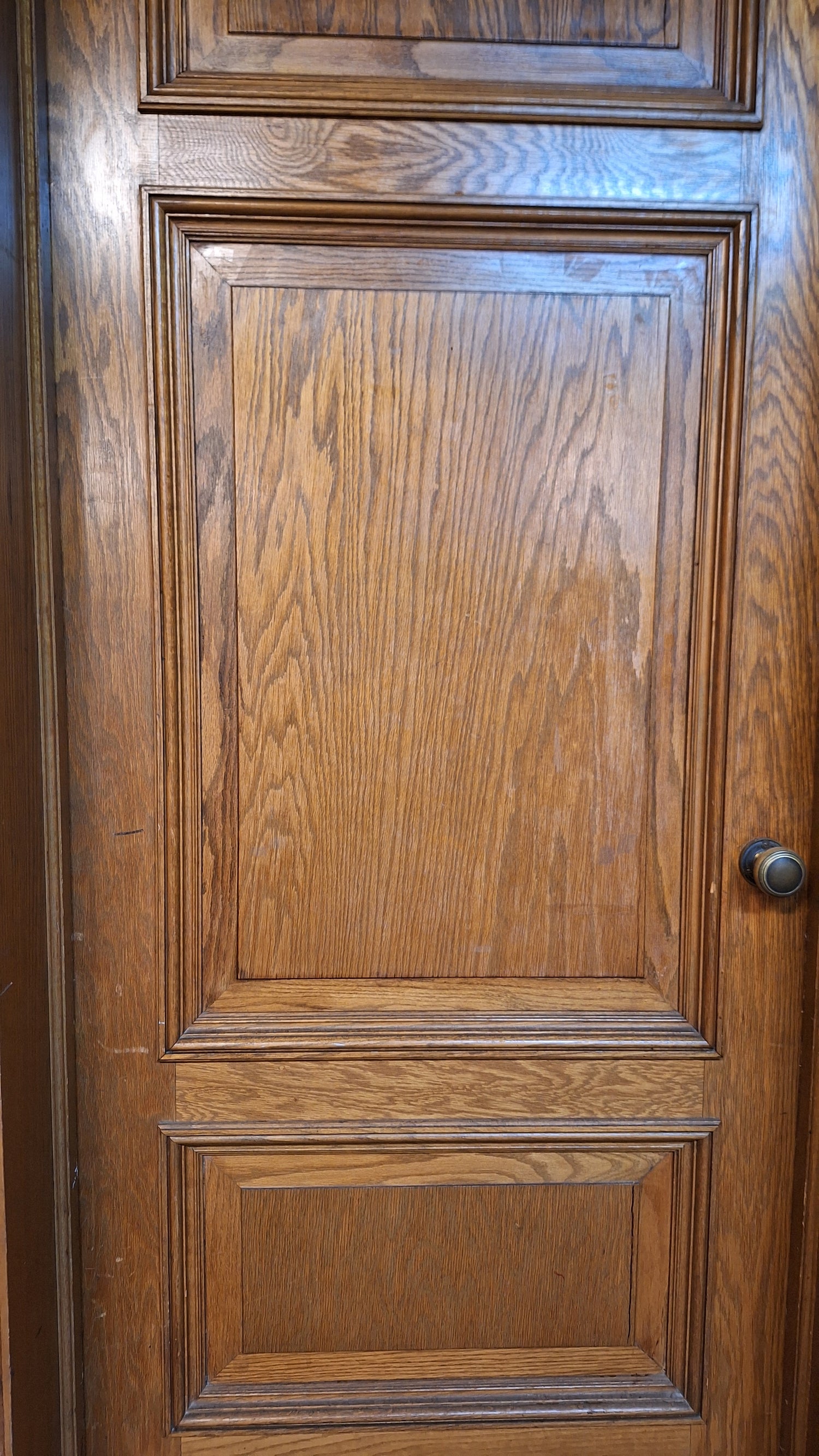 A solid wood, antique door with beautiful raised panels with molded trim borders. This door has stencilded gold numbers at the top on one side and a peep hole. It comes with a heavy, extra thick jamb and hardware including hinges, mortise lock, rosettes and knobs. There are some dark areas in the wood as shown and splits in the surface of the raised wood panels as pictures along with wear at the bottom edge. Please see all of our pictures for details. We have additional doors in this style. Please see our shop section Antique Doors or message us for links.
