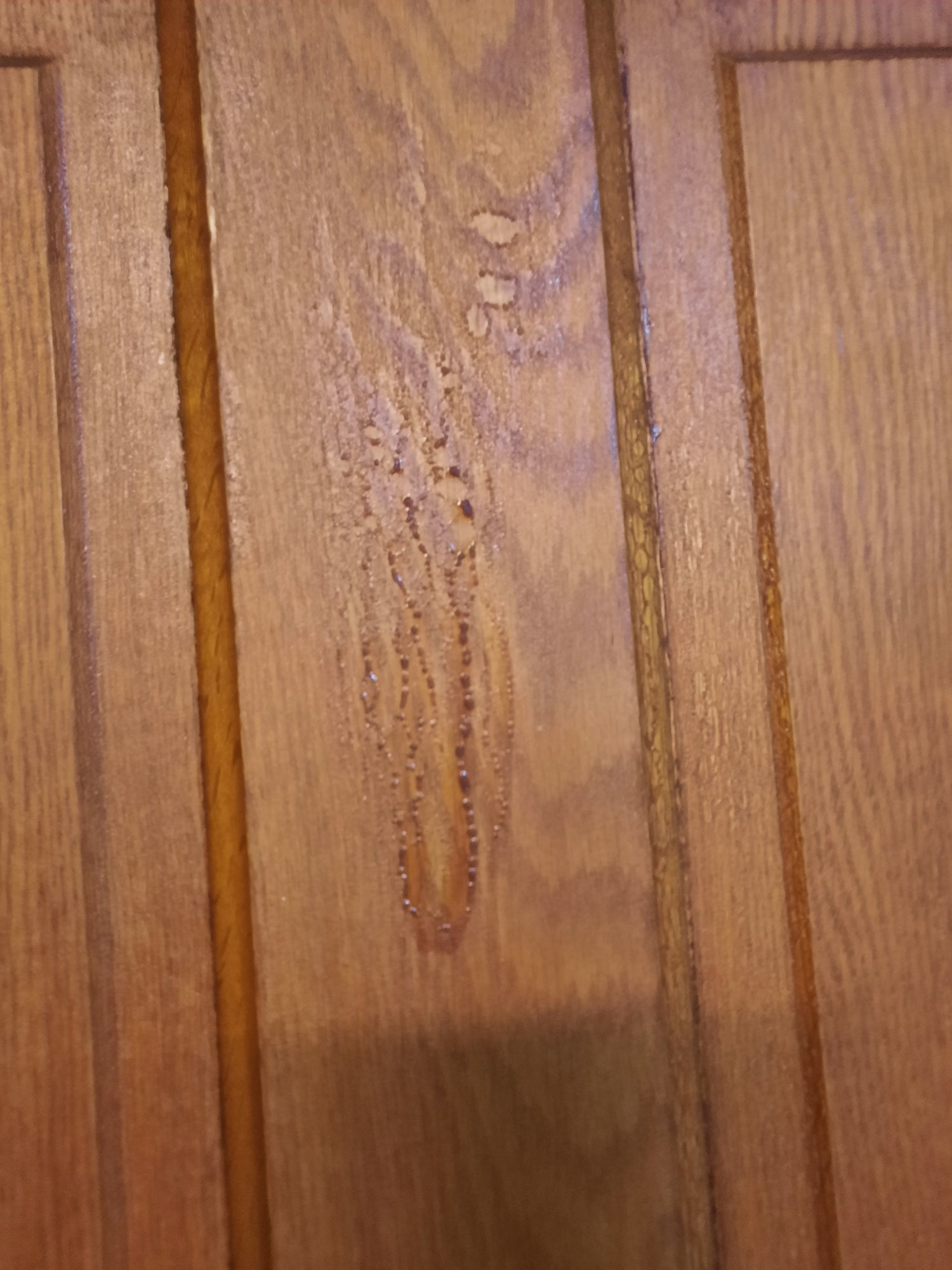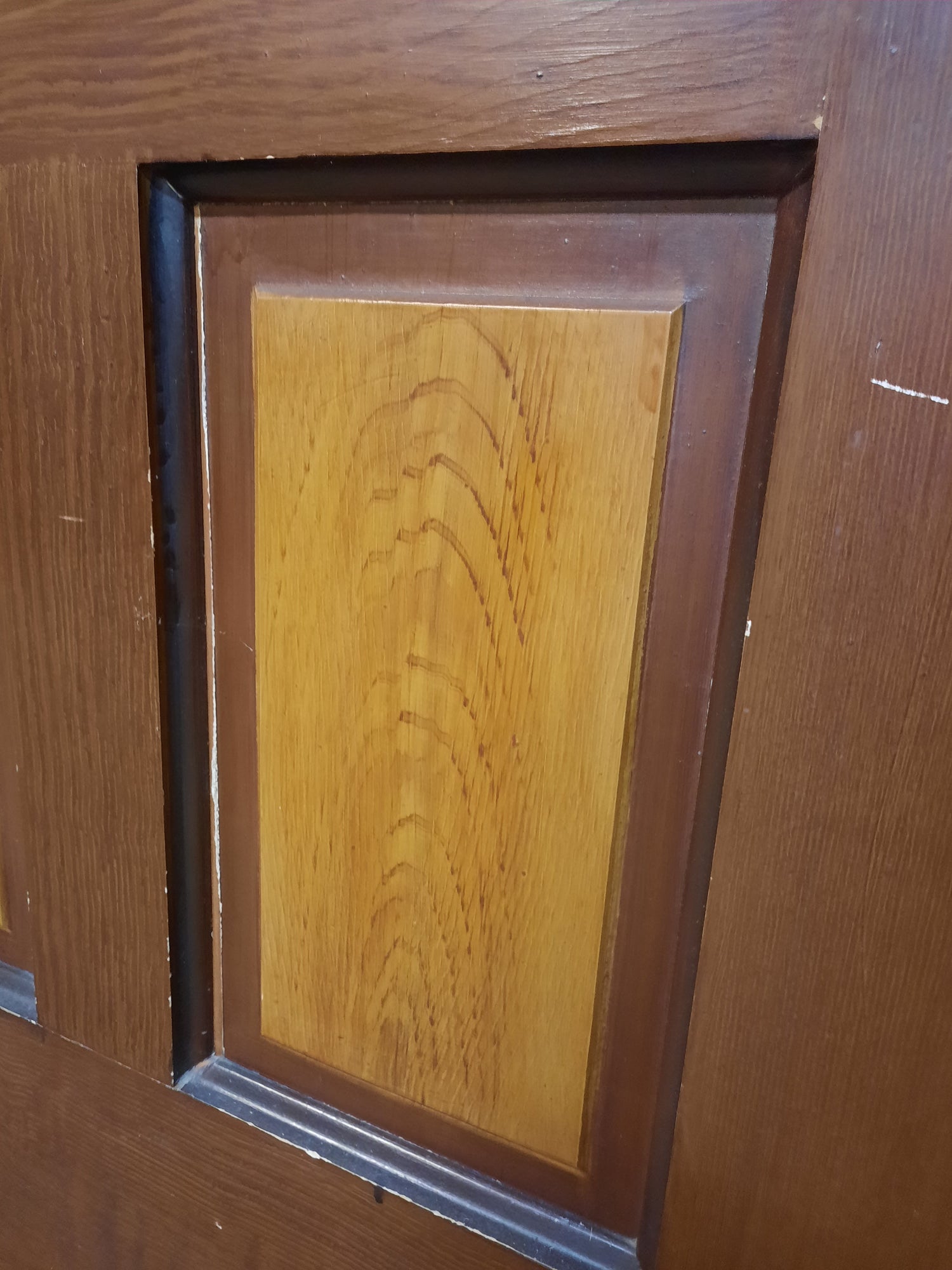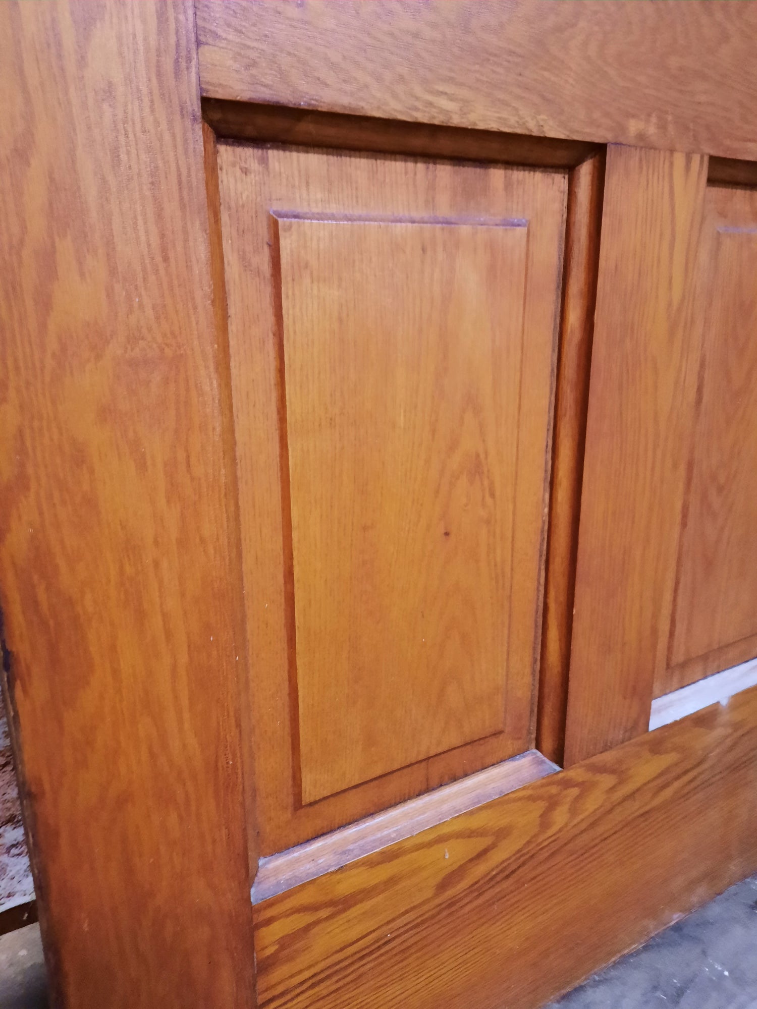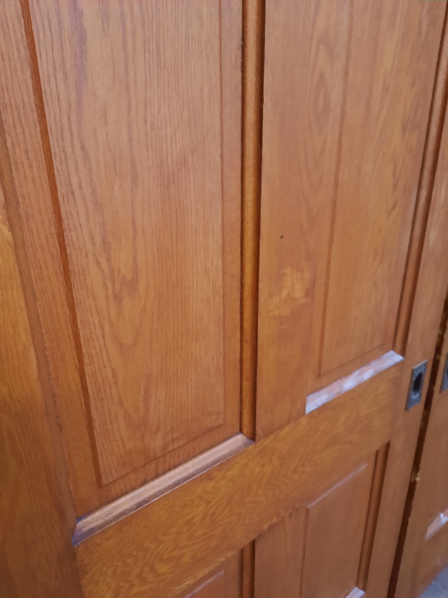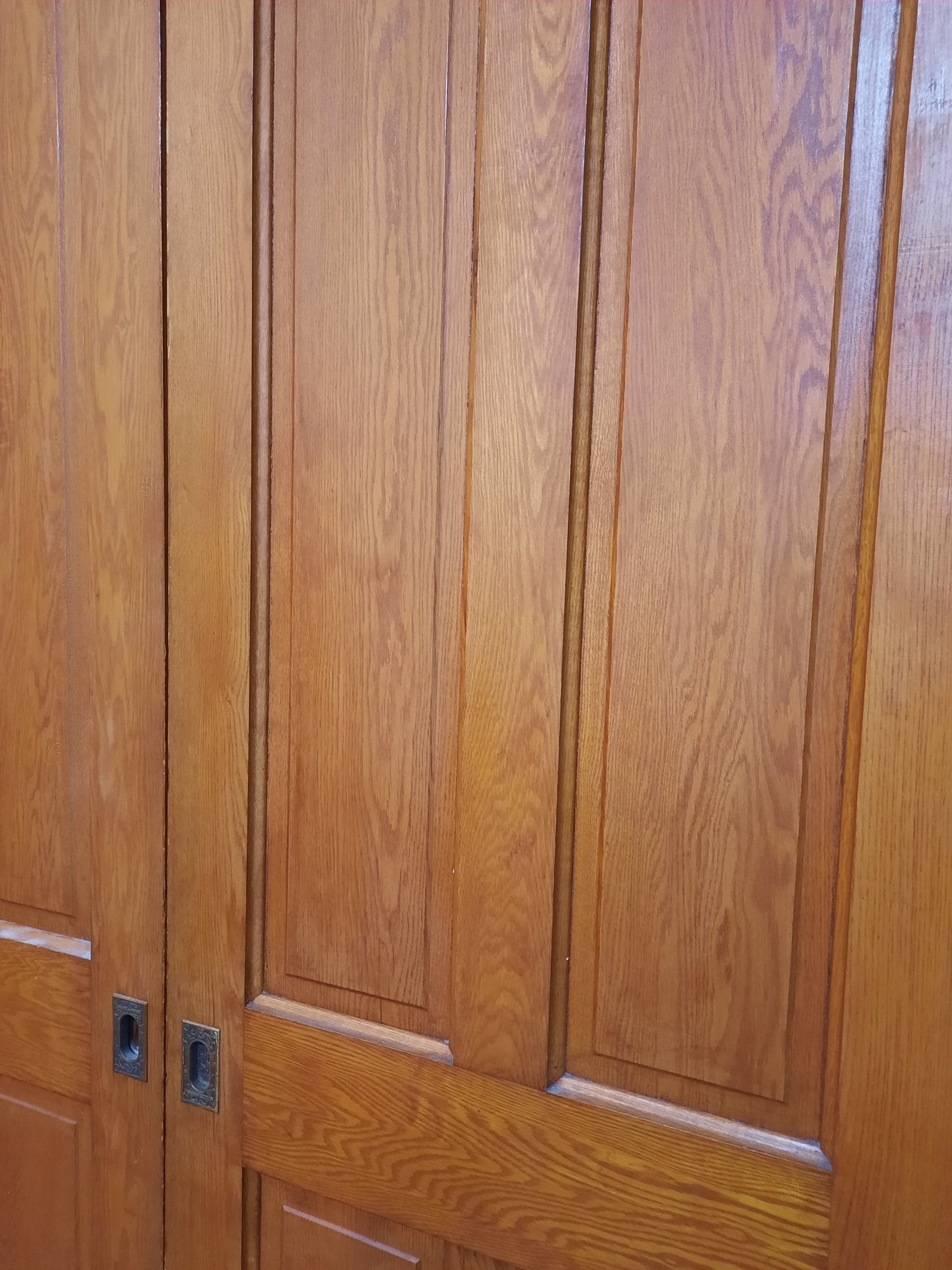 A gorgeous pair of Victorian era pocket doors salvaged from a home in central Illinois prior to demolition. One side is finished with a shellac and the other is a faux bois (painted grain) finish. There are some nicks and scuffs in the finish as shown and an imperfection as pictured in the shellac finish. The doors comes with the original locks and pulls. Please see all of our pictures for details.