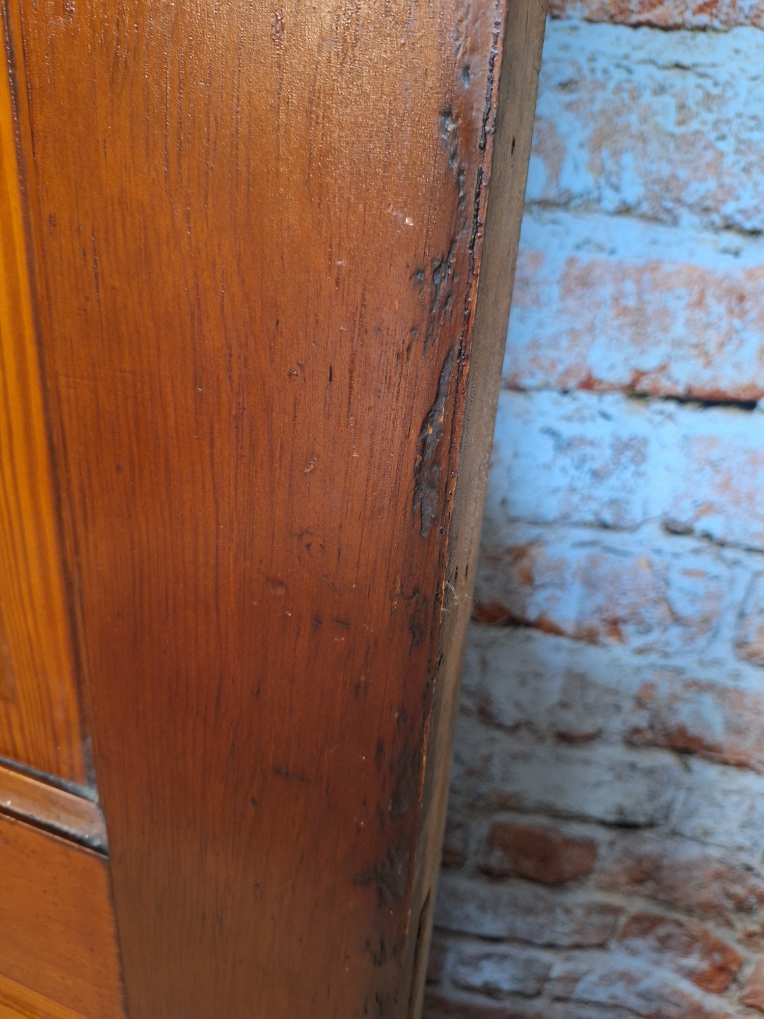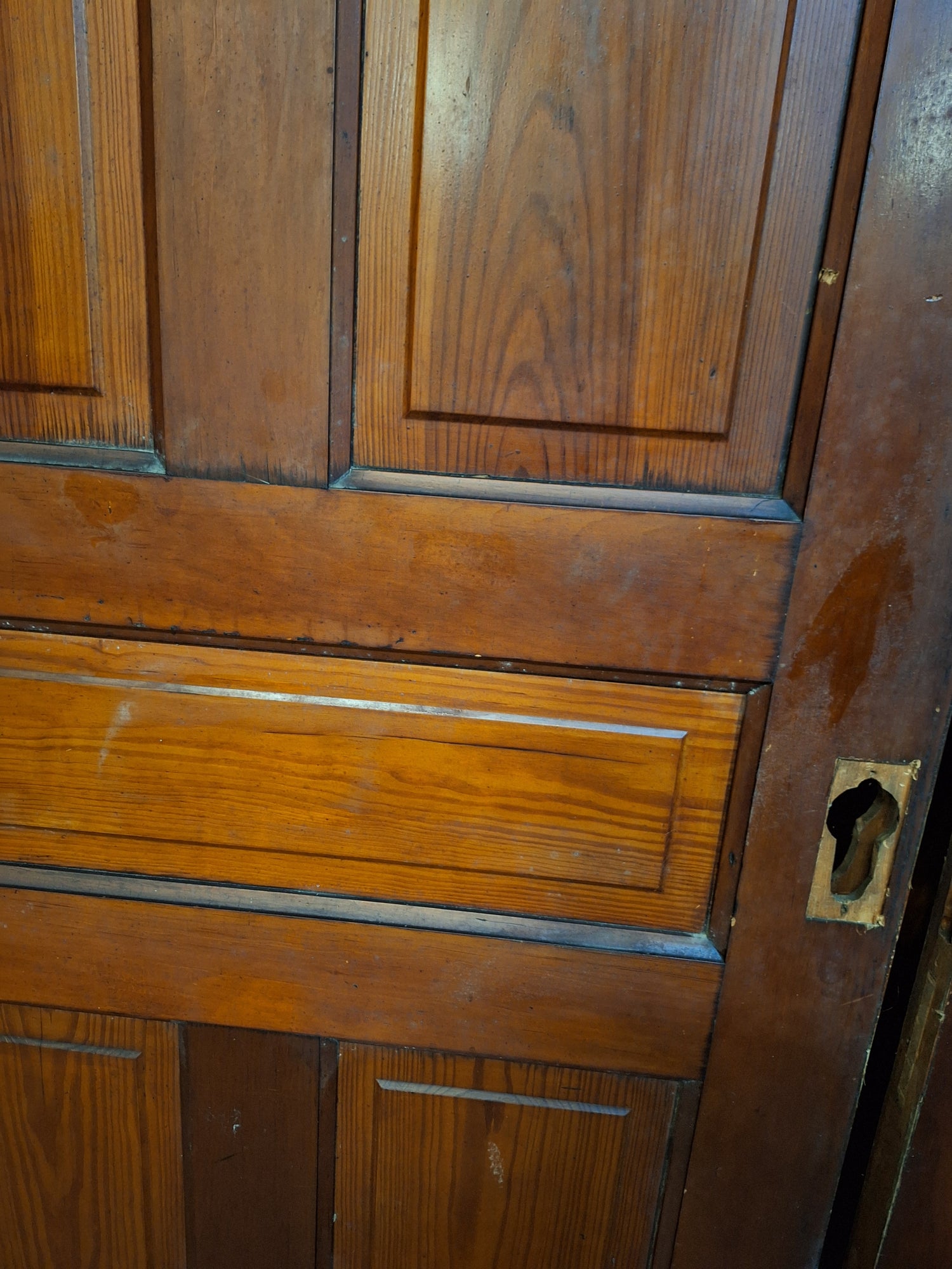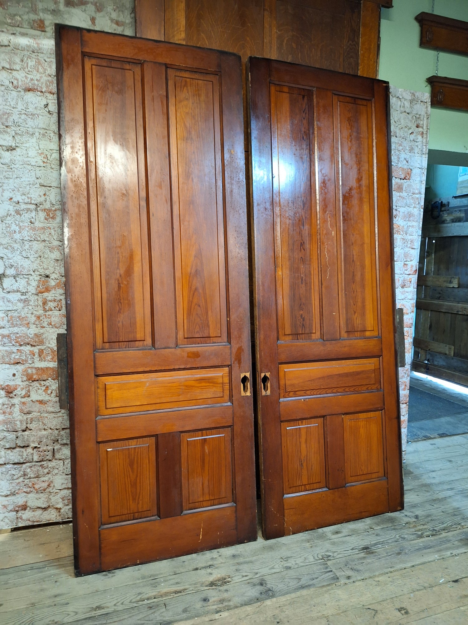 A beautiful, solid wood pair of antique pocket doors from a central Illinois home. This set has the original finish. This pair of pocket doors or sliding doors is in good condition; sign of wear include nicks in the finish and several divots in the wood as pictured. The inside edges where the doors meet in the center appear to have been cut and are unfinished. Please see all of our pictures for details.