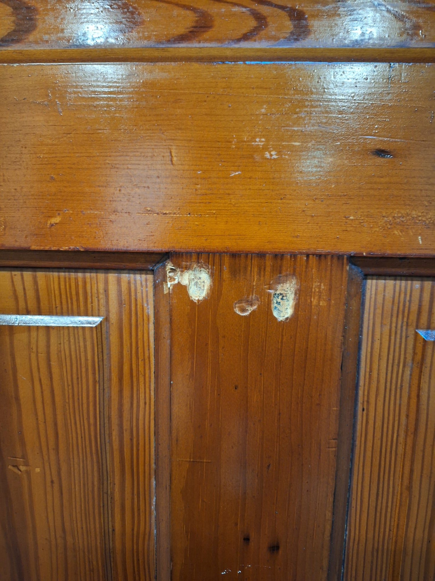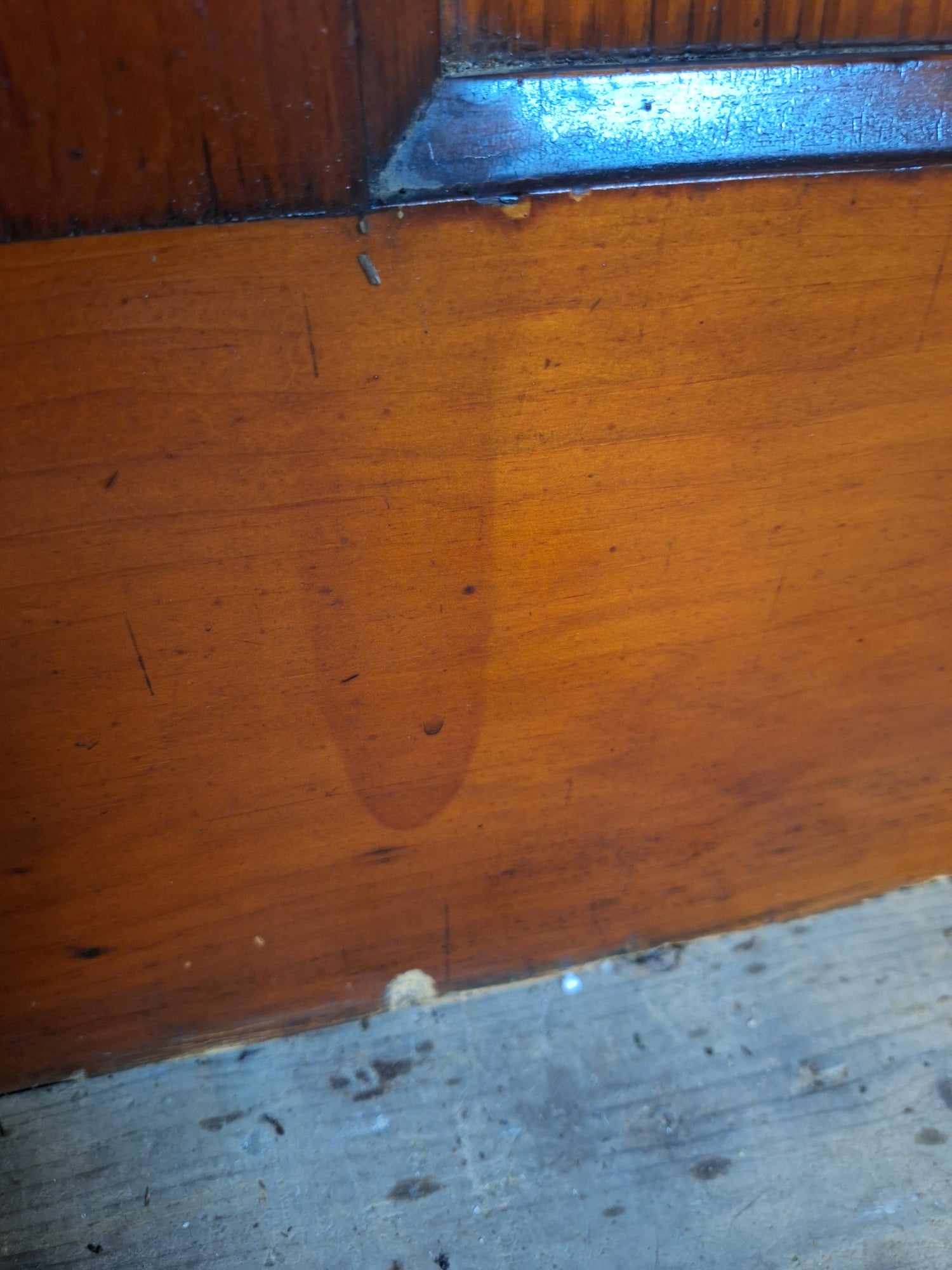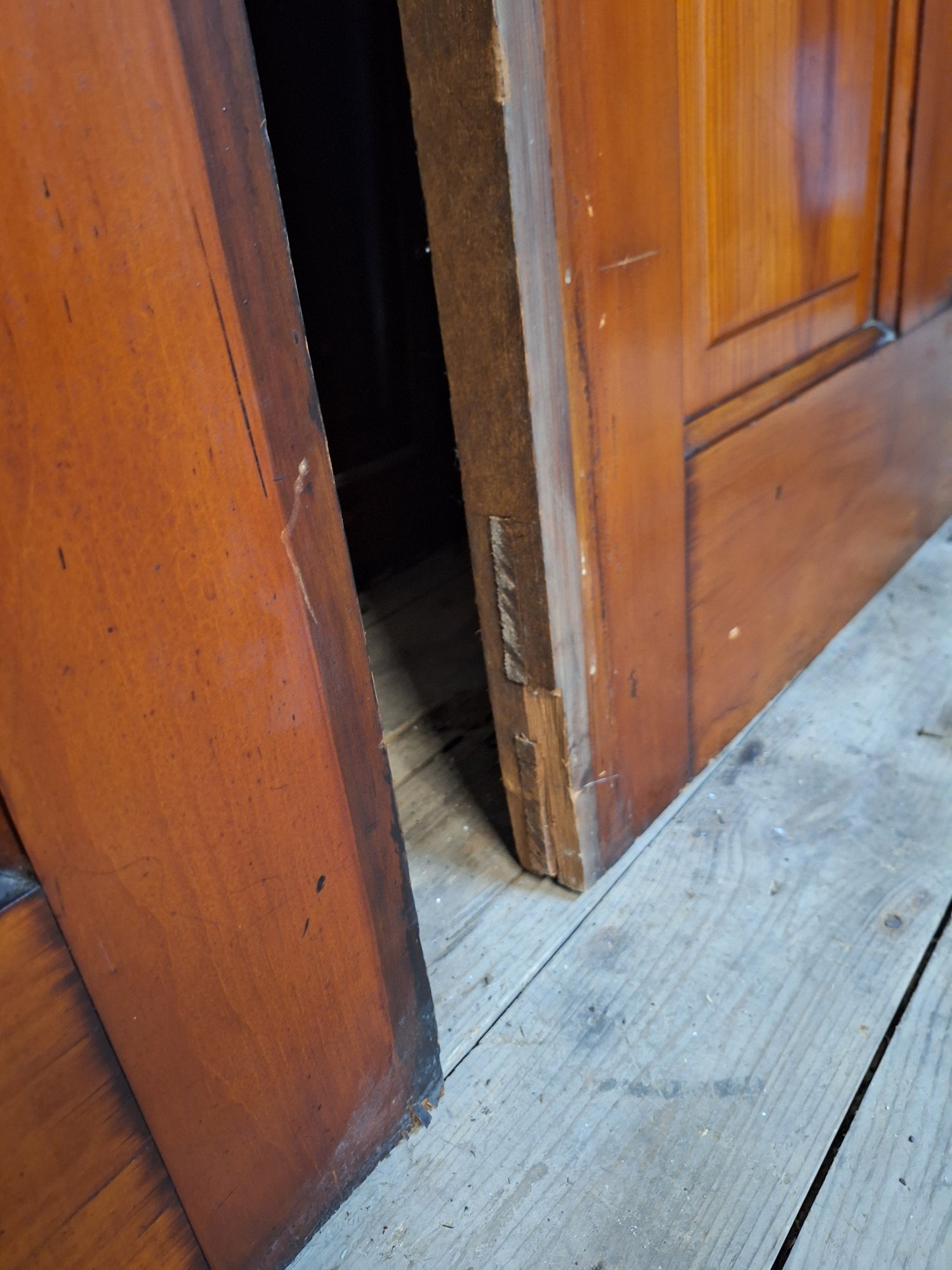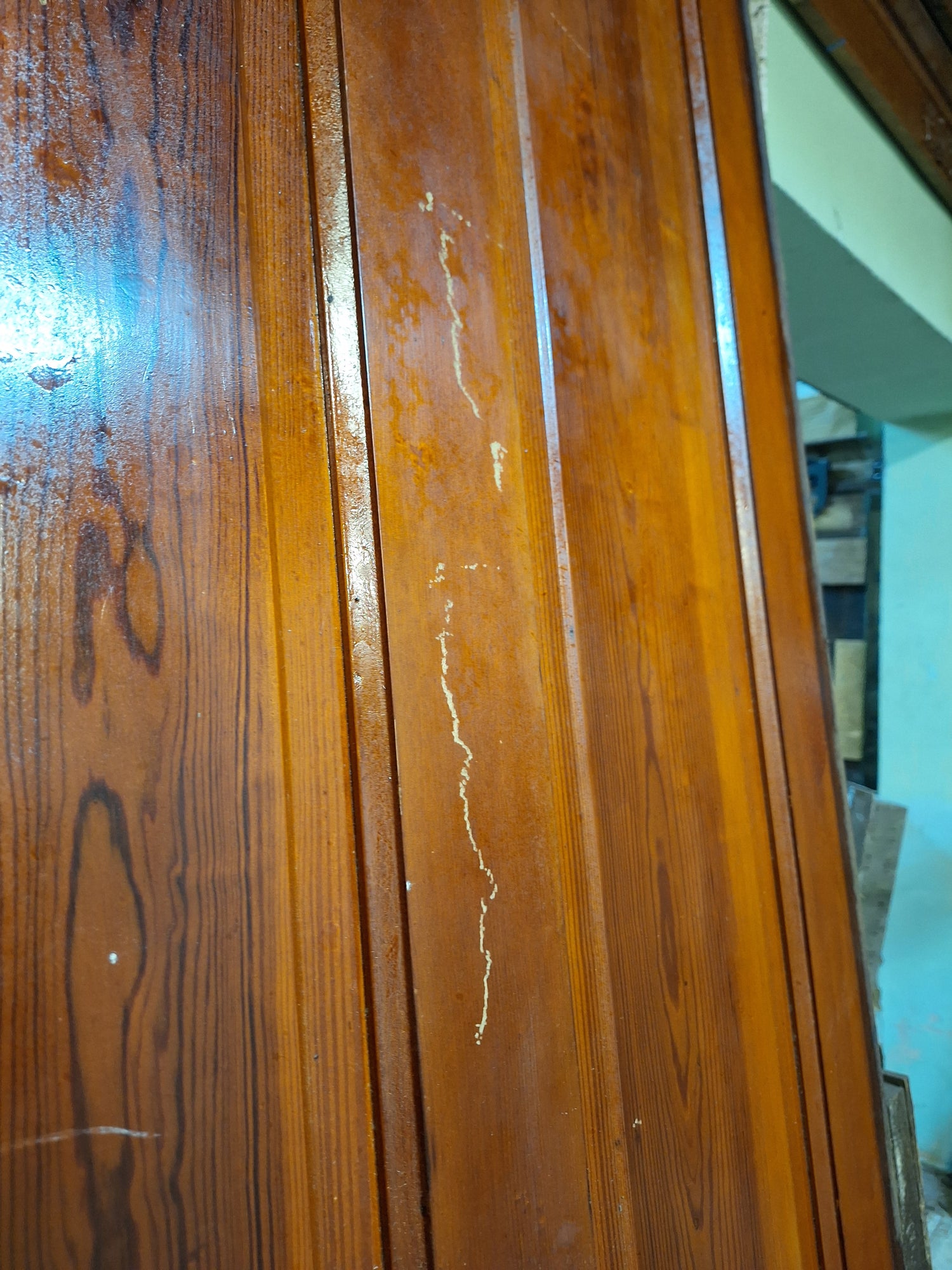 A beautiful, solid wood pair of antique pocket doors from a central Illinois home. This set has the original finish. This pair of pocket doors or sliding doors is in good condition; sign of wear include nicks in the finish and several divots in the wood as pictured. The inside edges where the doors meet in the center appear to have been cut and are unfinished. Please see all of our pictures for details.