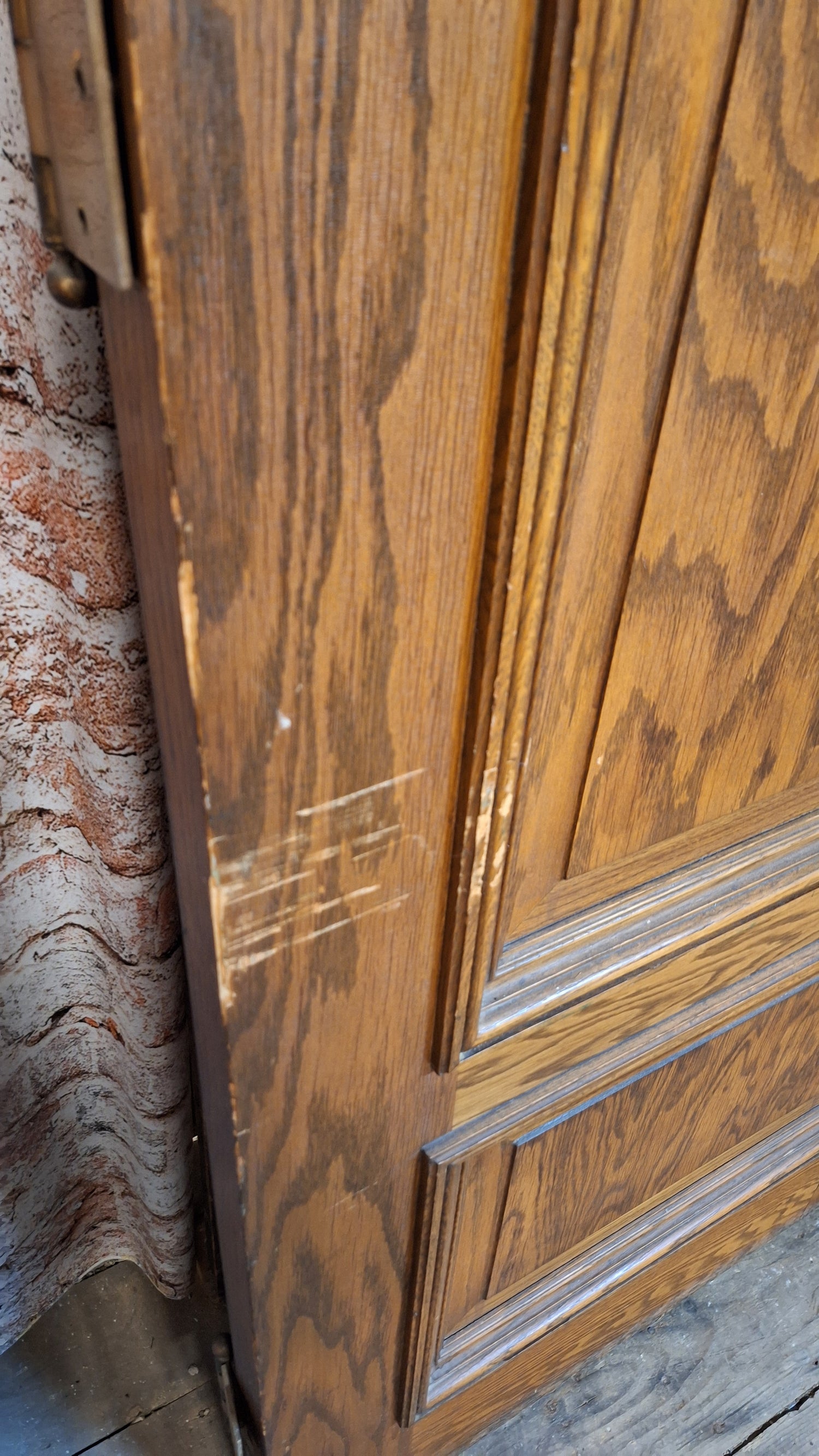 Each door in this set measures 29 7/8" wide by 1 3/4" thick by 83 1/4" tall. There is wear in the wood around the mortise lock (where the two doors would meet when closing). There are also some small chips in the wood around the edges as we’ve highlighted in the photos and darker areas of wood and piece of loose veneer as shown in the final picture. Please see all of our pictures for details on this set.