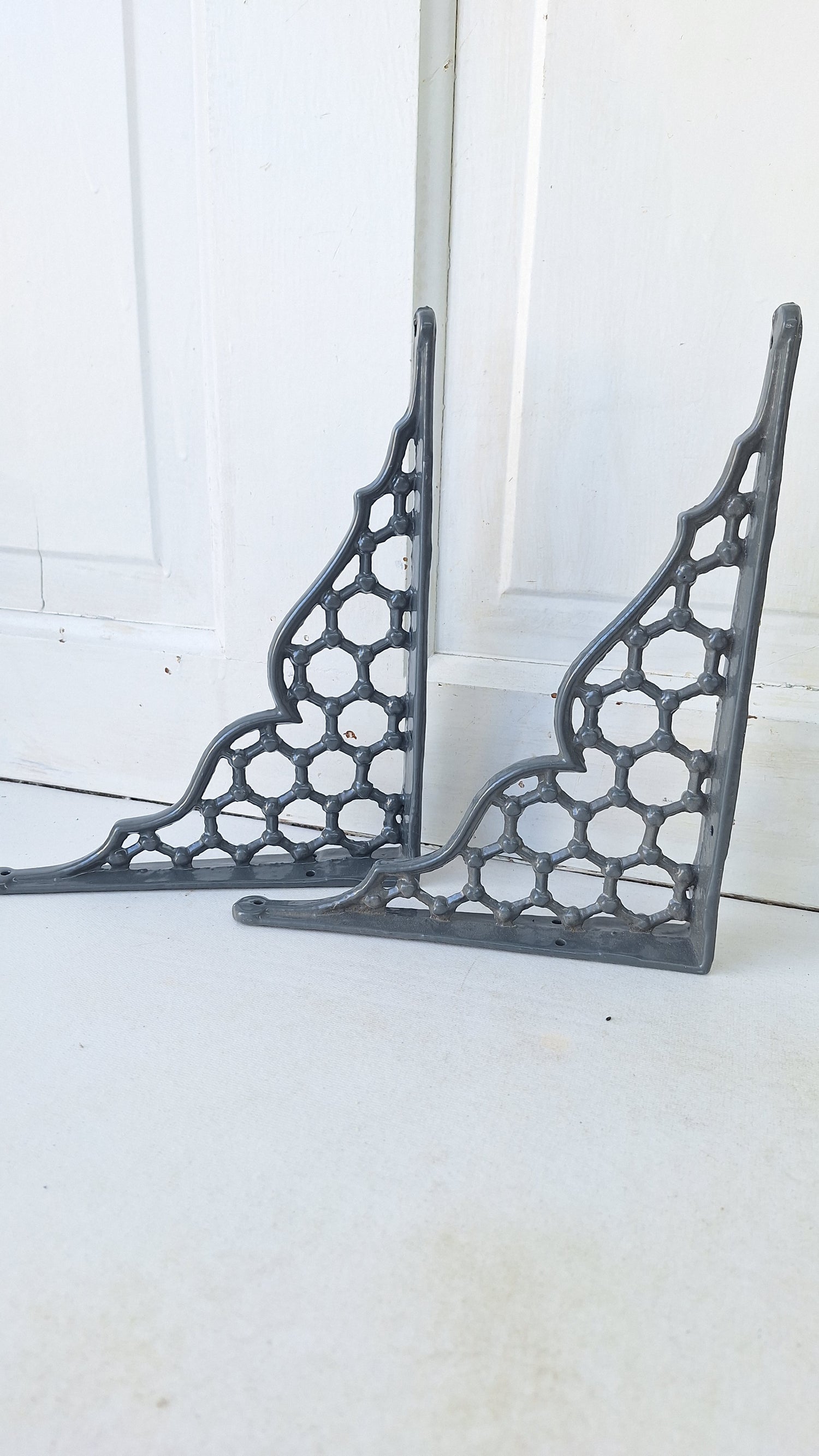 A lovely pair of antique cast iron brackets used for supporting a small shelf. These have a great, openwork design. They're small and perfect for a room with limited wall space. These cast iron pieces are hard to find and will make a perfect addition to your home in a bedroom, kitchen, or bathroom. Please see all of our pictures for details and dimensions. This pair ships free within the US.
