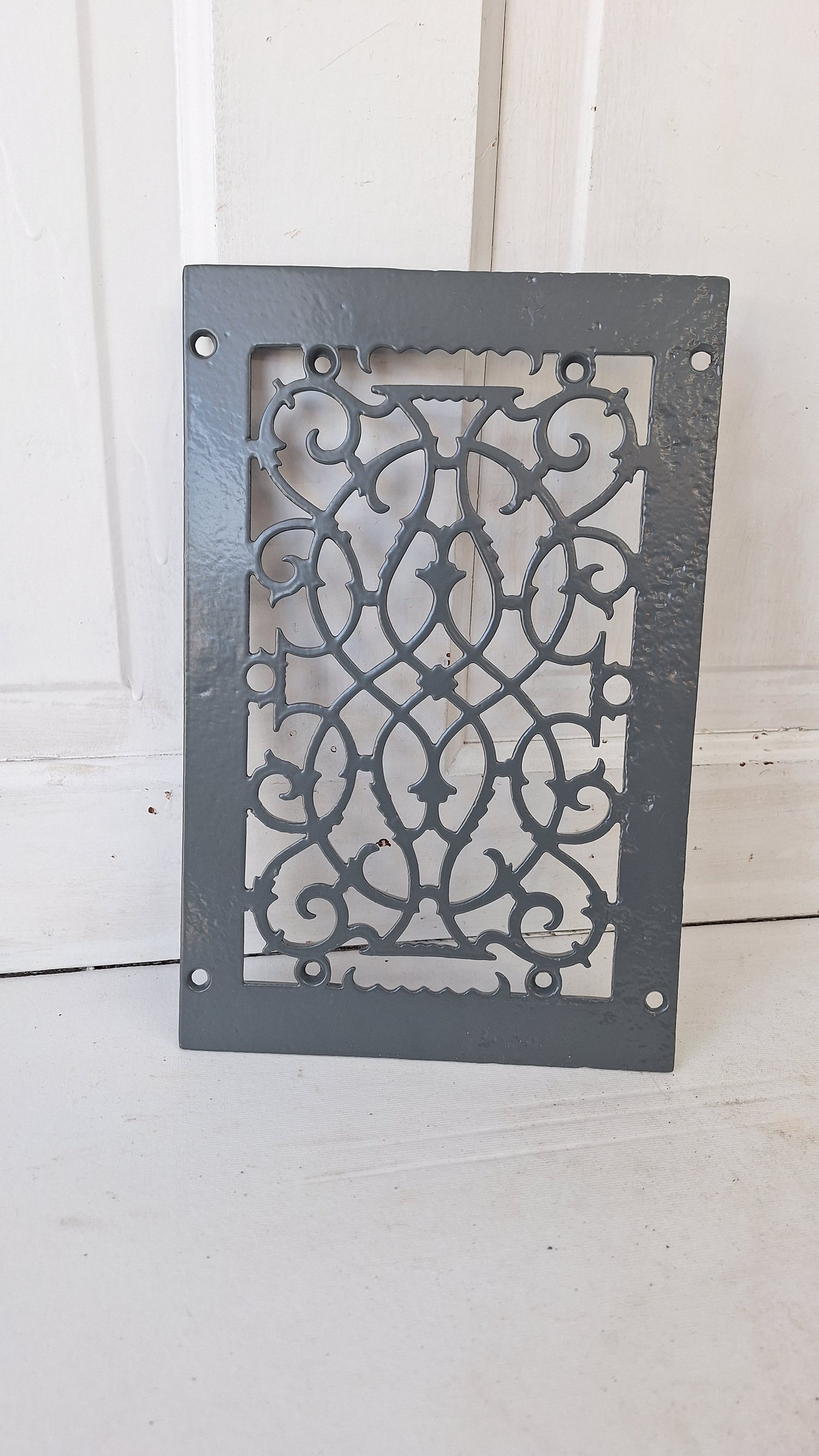 An elegant scroll design vent cover from the turn of the century. It has been repainted as shown although there is some pitting in the iron underneath the paint.