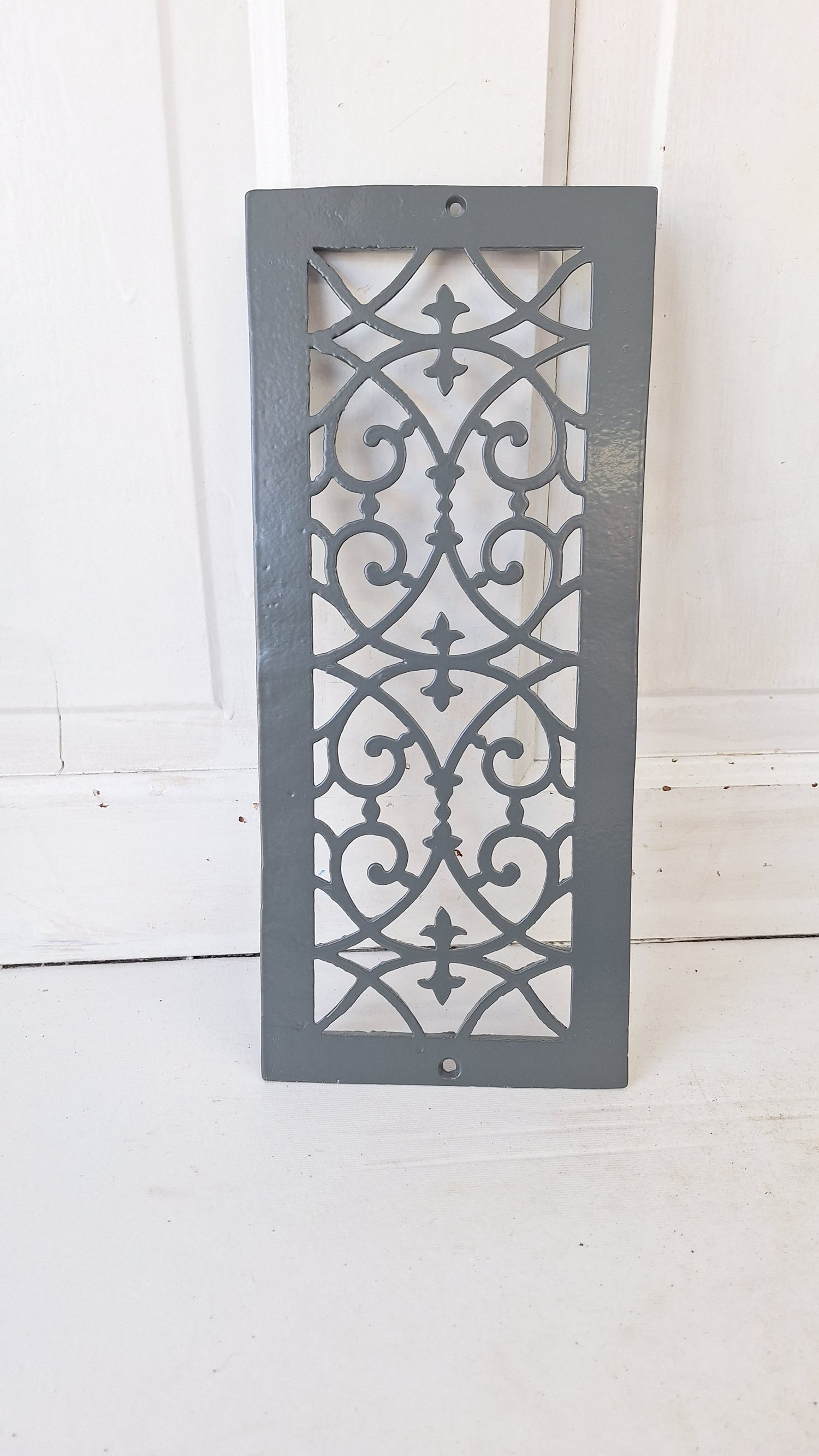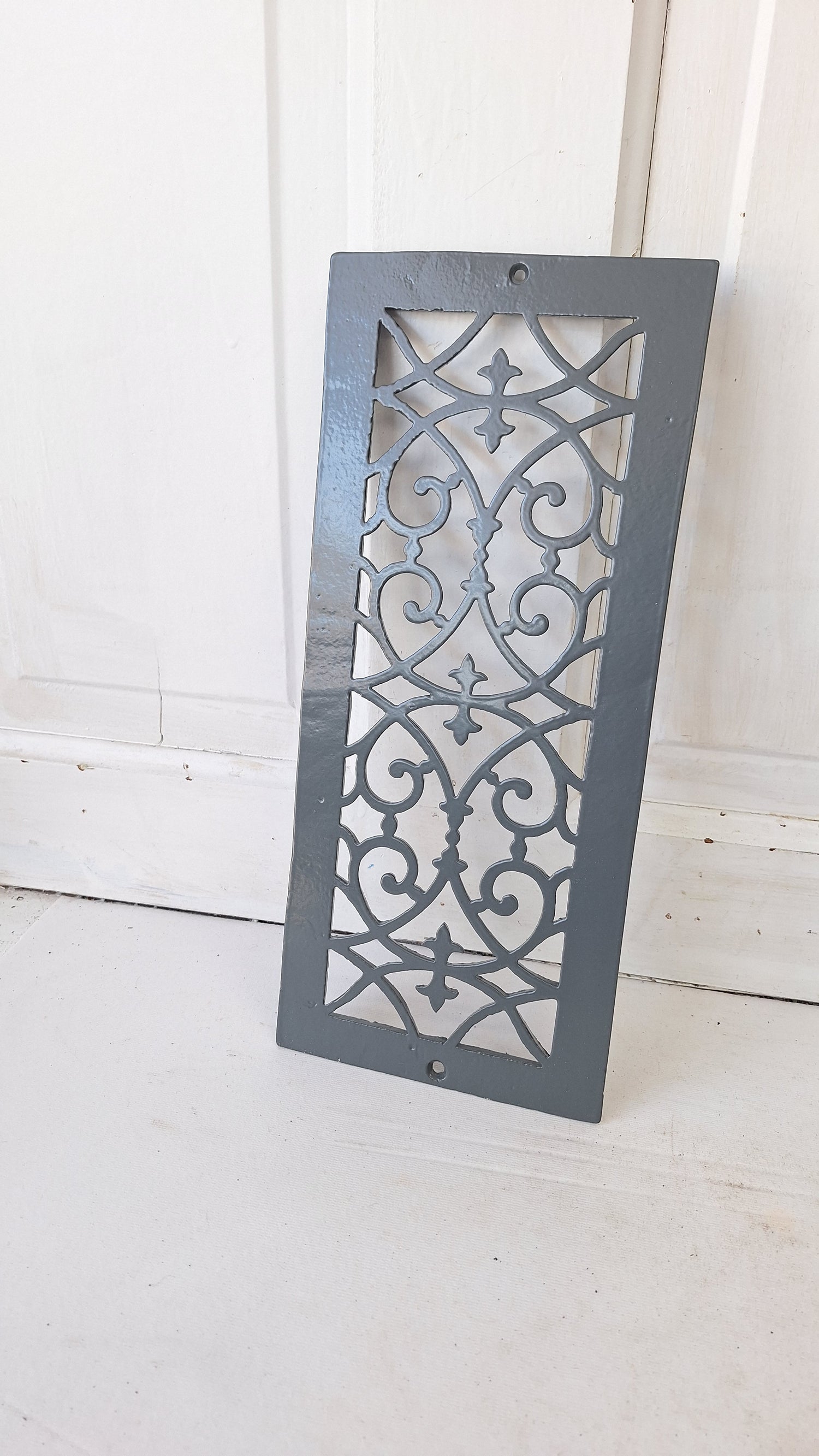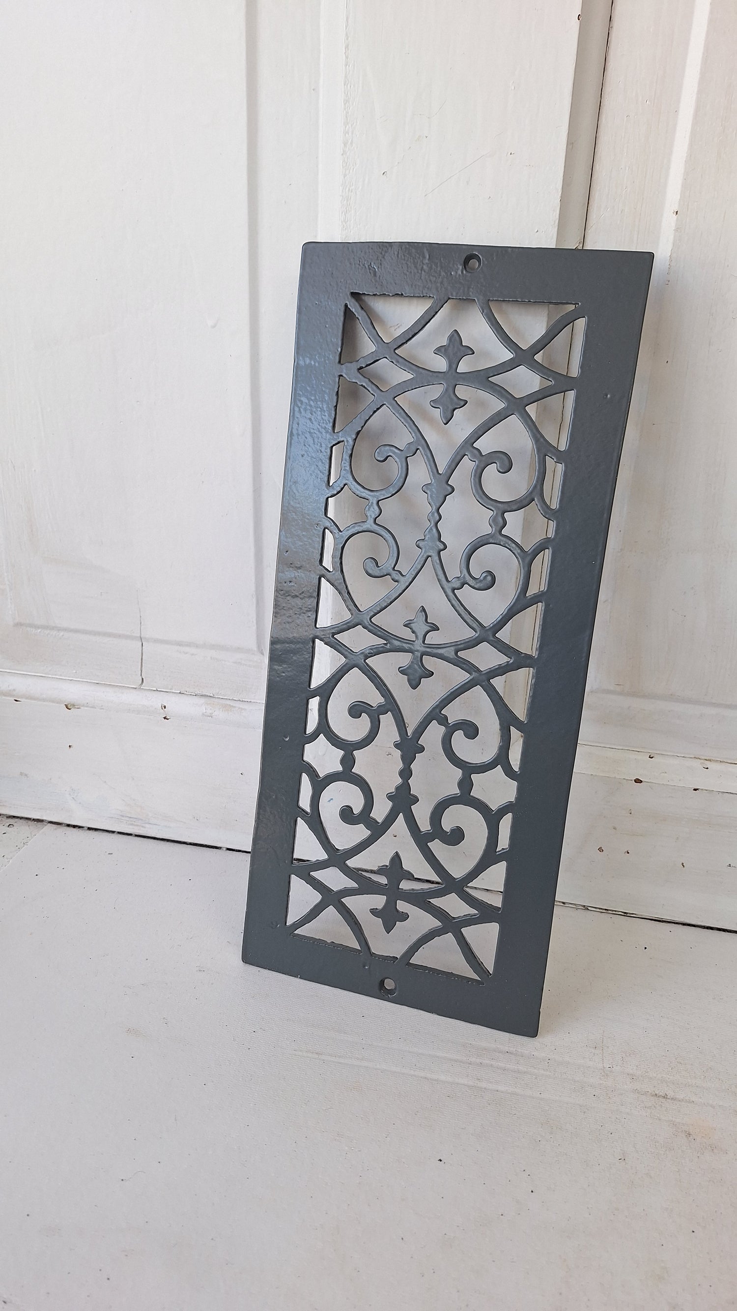 This unusually slim, cast iron grate was salvaged from a turn of the century home before demolition. They were installed horizontally, but can be used in whatever manner you like. This grate has been painted a dark gray and is in excellent condition.