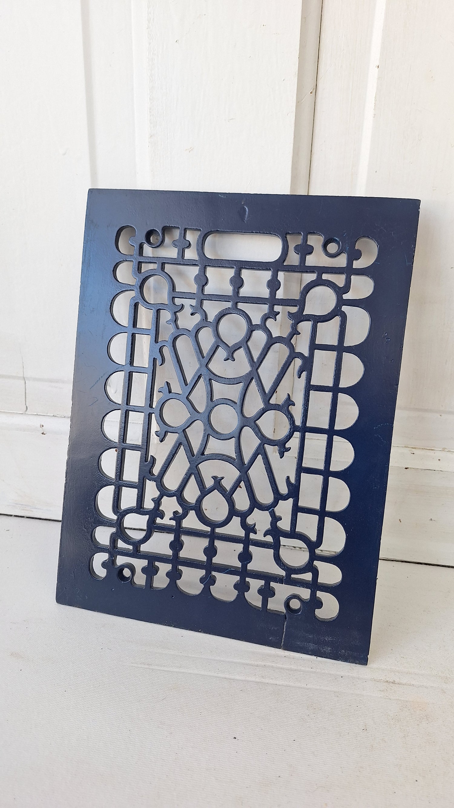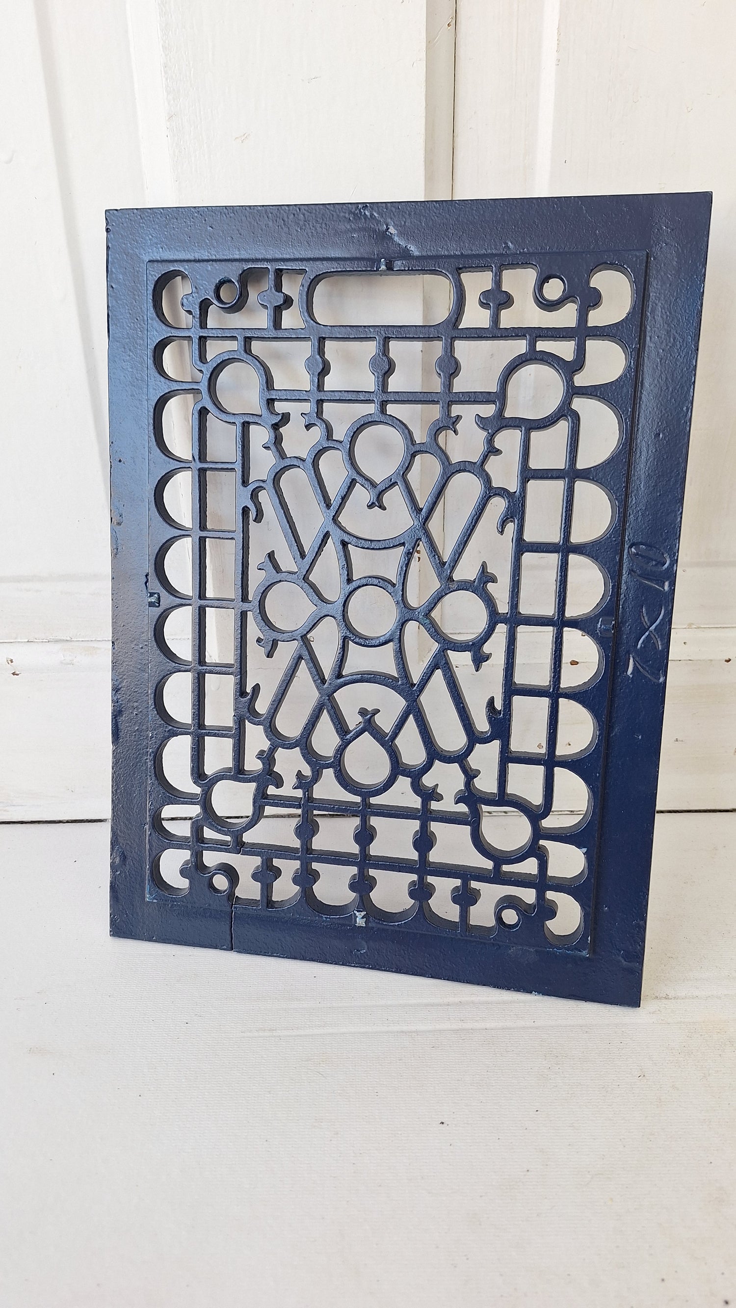 A small antique iron grate from the turn of the century with a stylized geometric pattern. These grates are perfect for covering up register covers on floors or wall, but can also be hung as wall decor, used as trivets, and more. It has been painted a dark blue and does have a crack that runs through the bottom corner as shown.