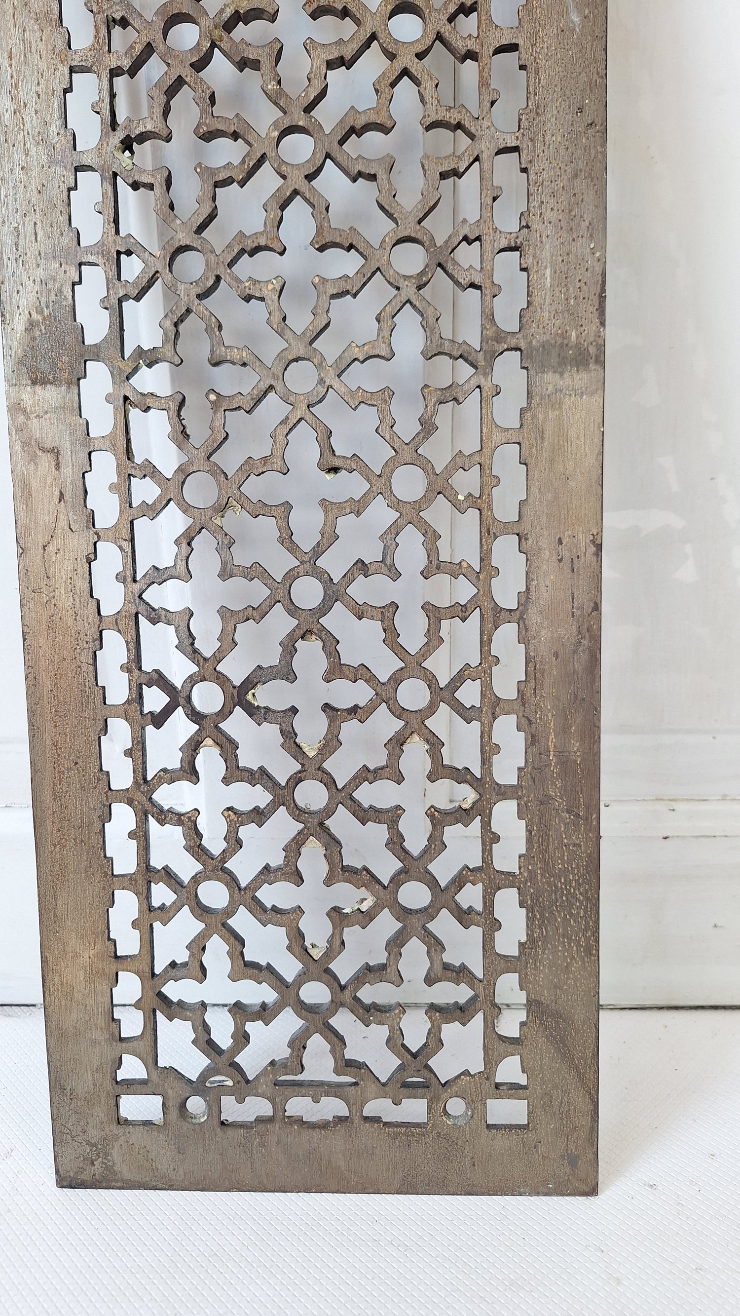This unusually slim, cast iron grate was salvaged from a turn of the century home before demolition. They were installed horizontally, but can be used in whatever manner you like. These are wonderful wall decor, trivets, pot racks, and more. It can be stripped and repainted, sandblasted, or left as is and coated with a sealer.
