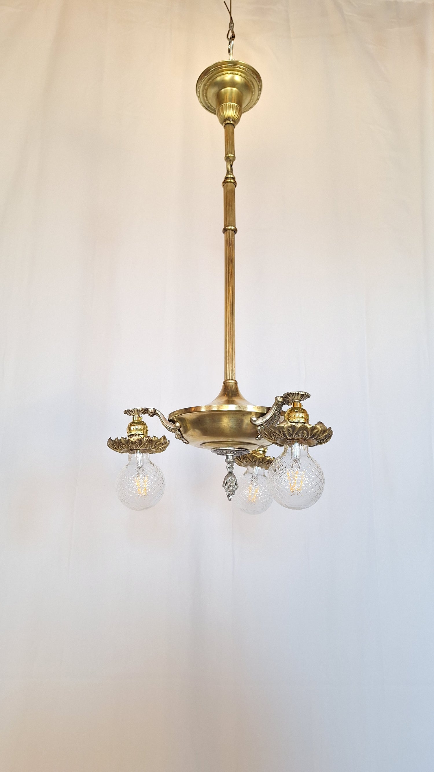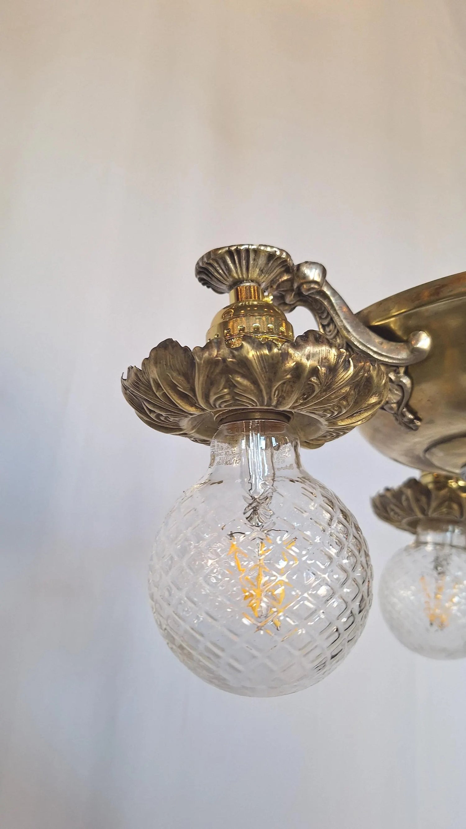 A beautiful brass pan light with ornate silver plated arms and finial. This antique chandelier features delicate stamped floral cuffs around edge bulb and an elegant, satiny finish on the metal. This piece has been rewired and is ready to install. Please see all of our pictures for details. There are some darker areas on the brass body. Bulbs are not included with purchase.