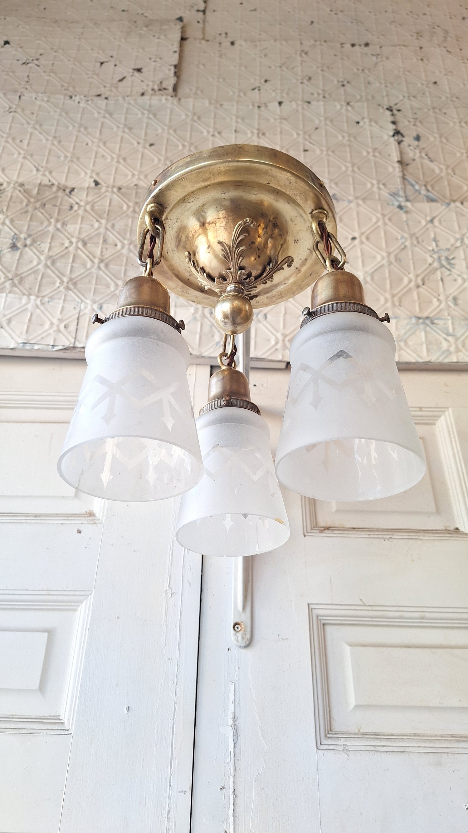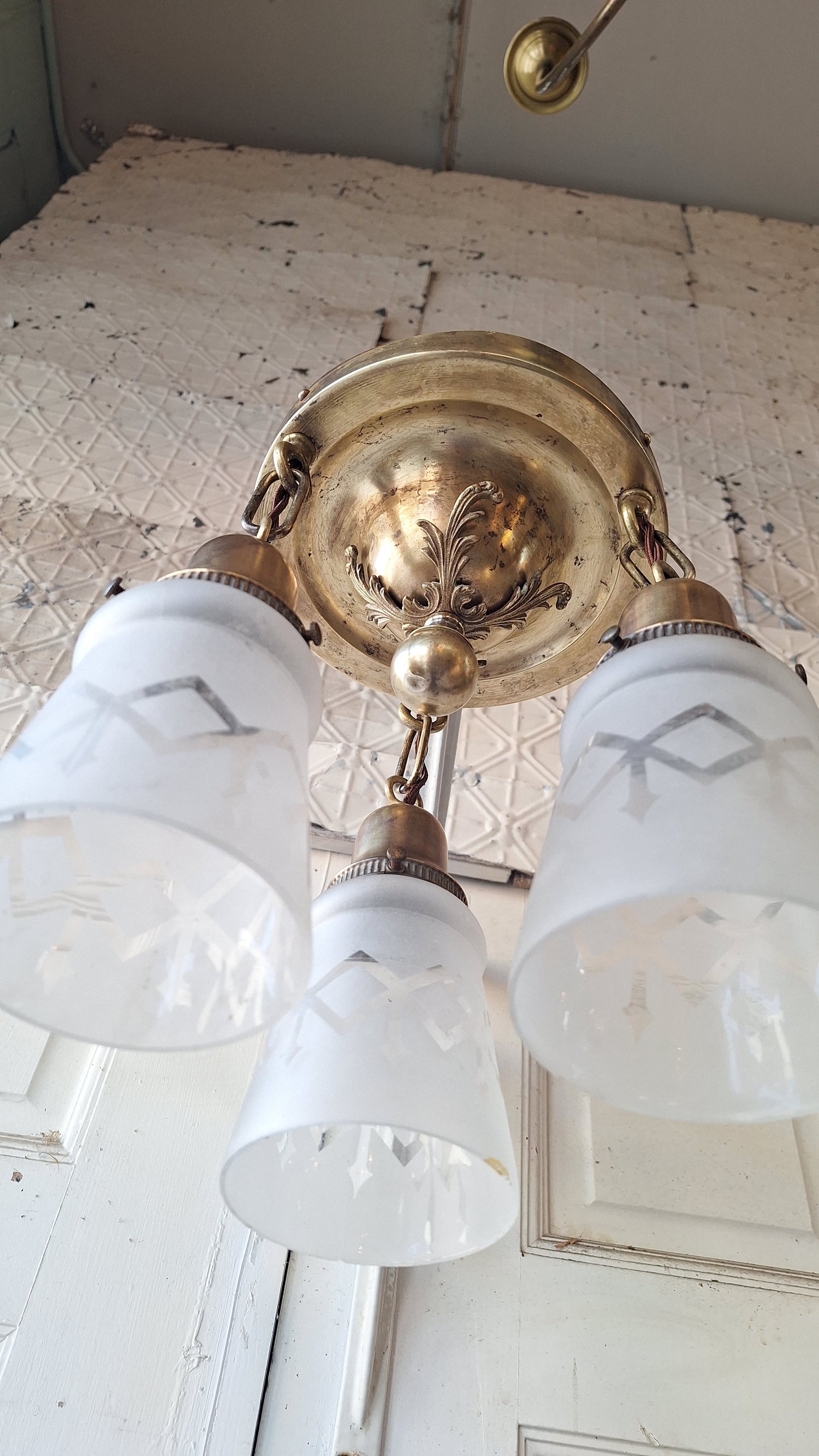 A beautiful, fully refurbished antique light with three hanging arms and etched glass shades. This would be a lovely addition to a dining room, living room, or bedroom. It has been completely disassembled, paint removed, cleaned, polished, and rewired. Please see all of our pictures for details. The finish of the brass has some dark spots as shown and faint cracking in the metal (does not affect functiong or stability). The etched glass shades have some minor imperfections in the etching as shown.