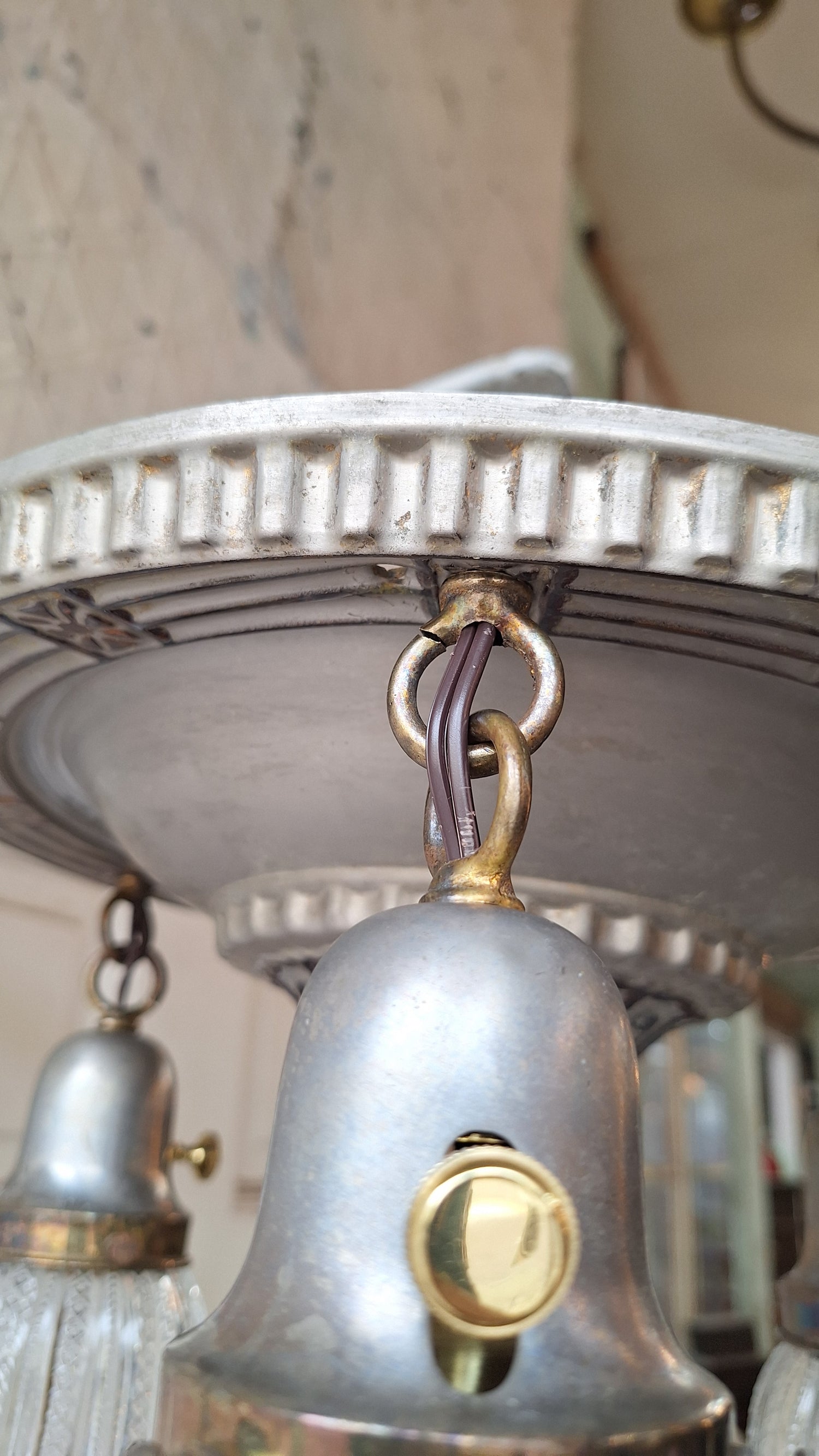 A beautiful, fully refurbished antique light with three hanging arms and sparkling, faceted glass shades. It has been completely disassembled, cleaned, and rewired. The finish shown is an original finish is matte silver with dark bronze accents. The shade fitters have some splits in the metal, but still hold the glass shades as intended. One glass shade has a small imperfection in the casting from manufacture; this is a mark in the glass and not damage to the glass. This light is intended to sit with the top edge of the 'pan' flush against the ceiling.
