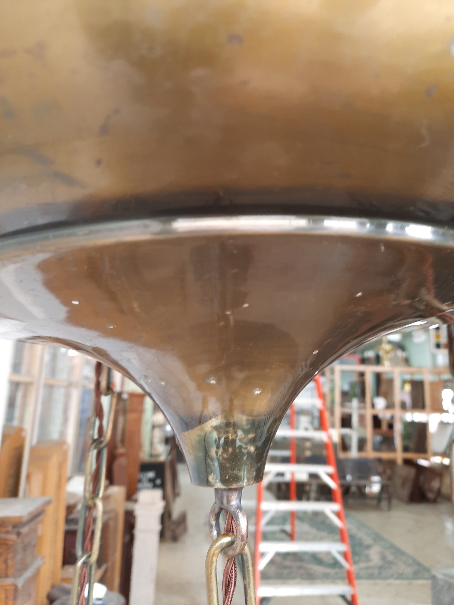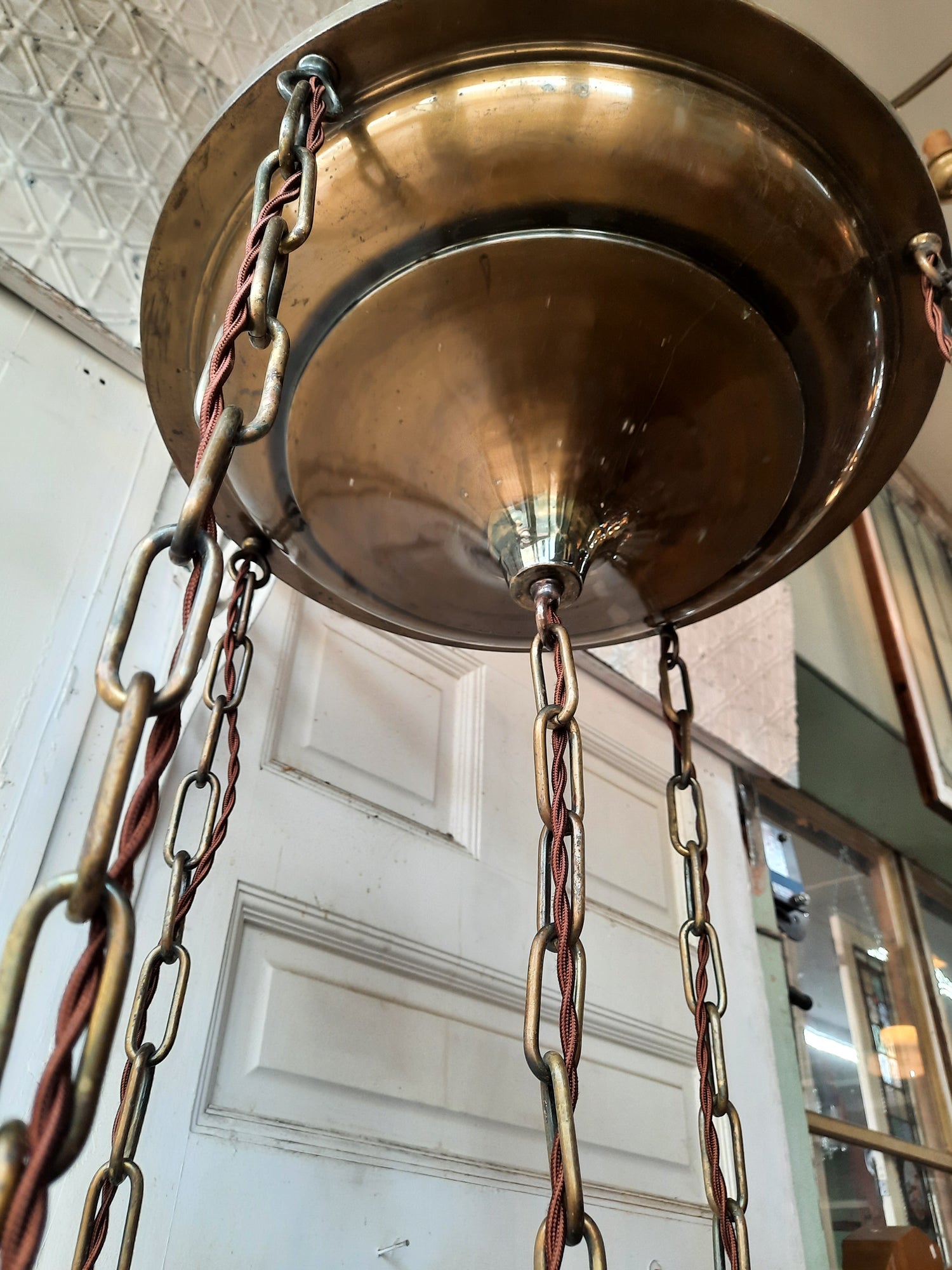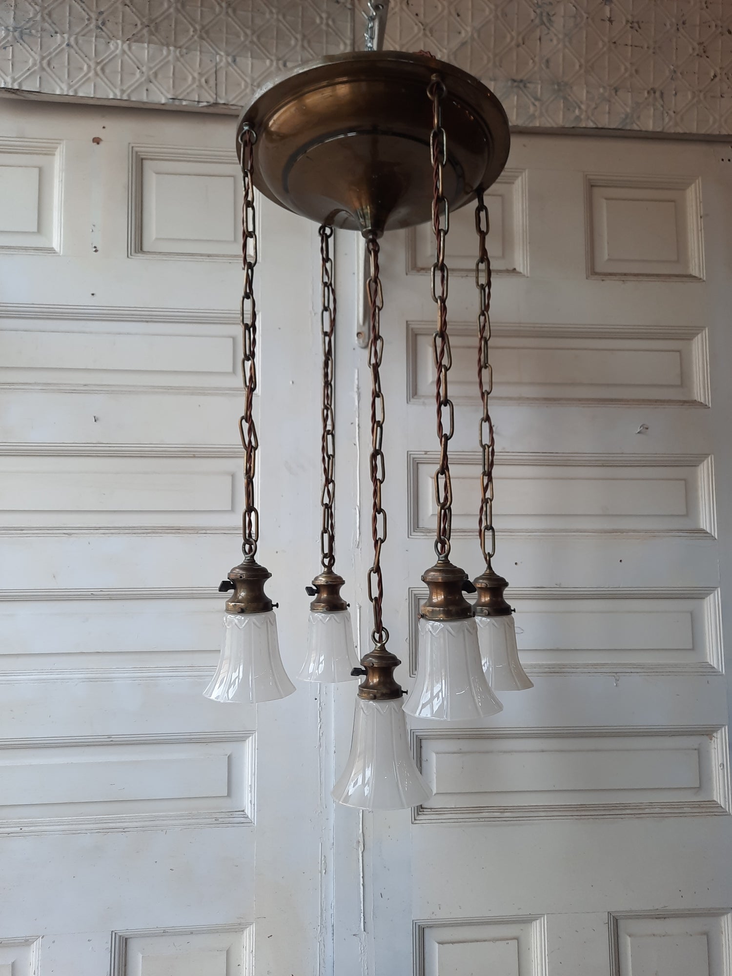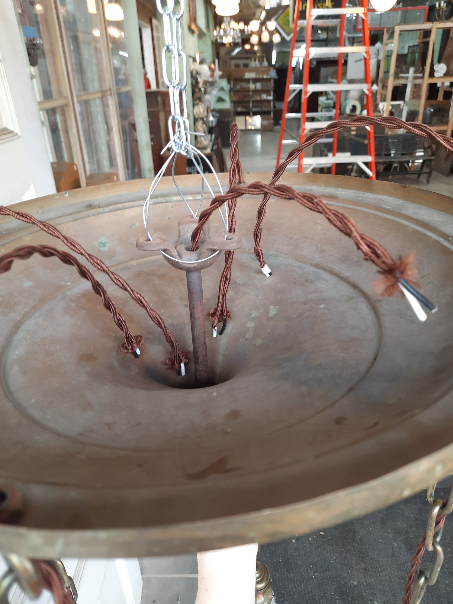 A beautiful Sheffield style brass pan light with five beautiful hanging sockets. There are five coordinating shades with the largest, trumpet-shaped shade in the center which hangs slightly lower than the rest. This piece is brass with a lacquer type (original) finish which does have some darker areas as shown in the photos (specifically the center of the canopy) and some small indentations in the metal in a few spots.
