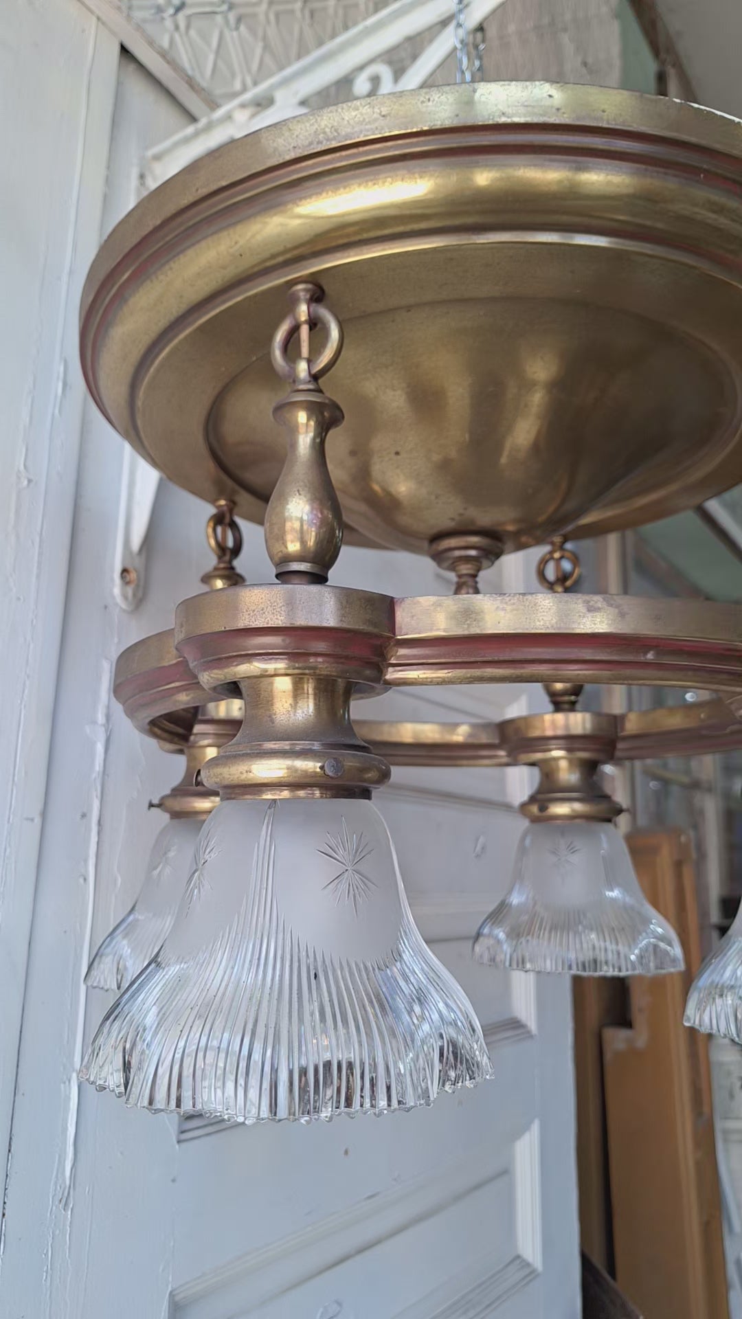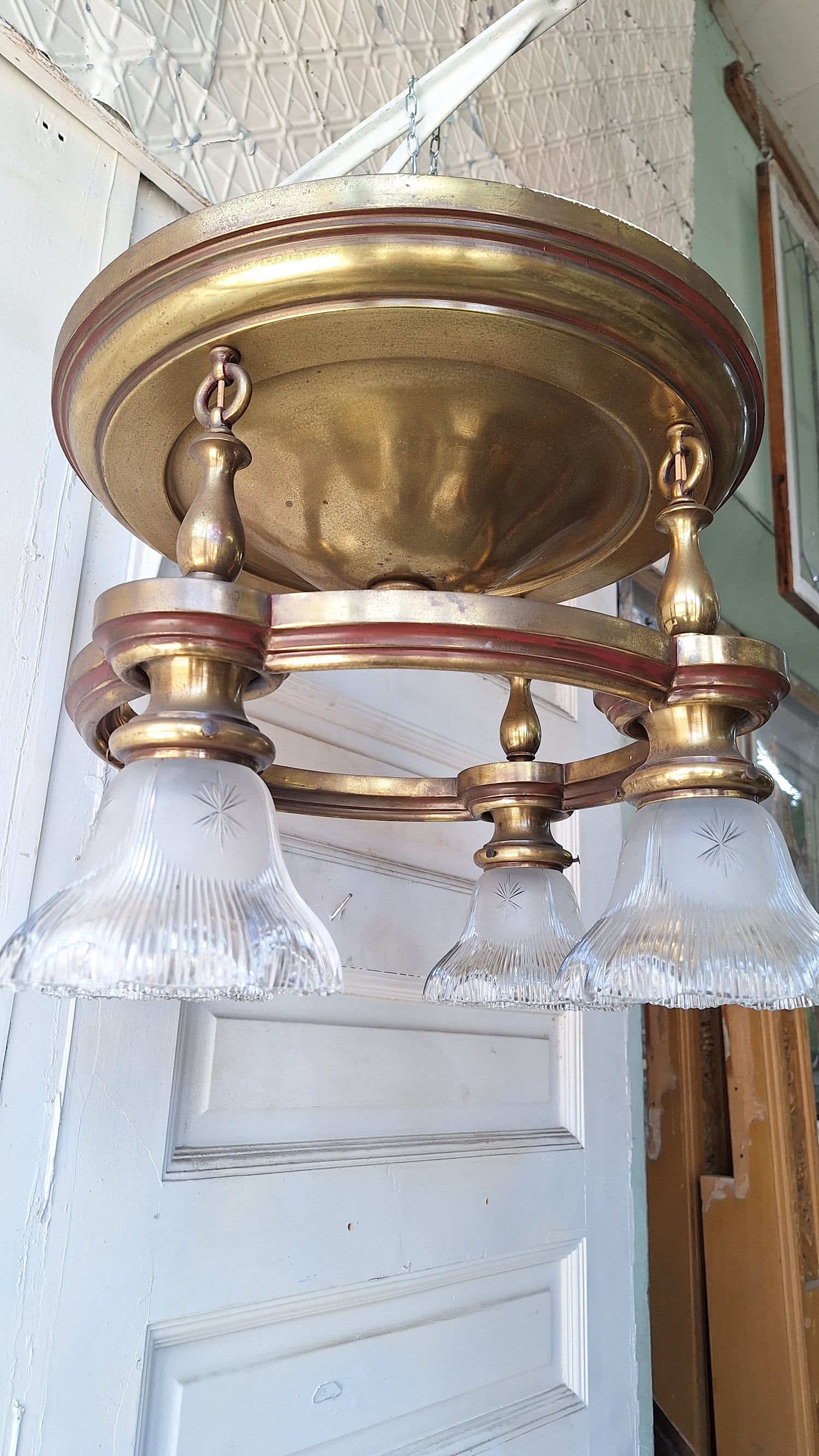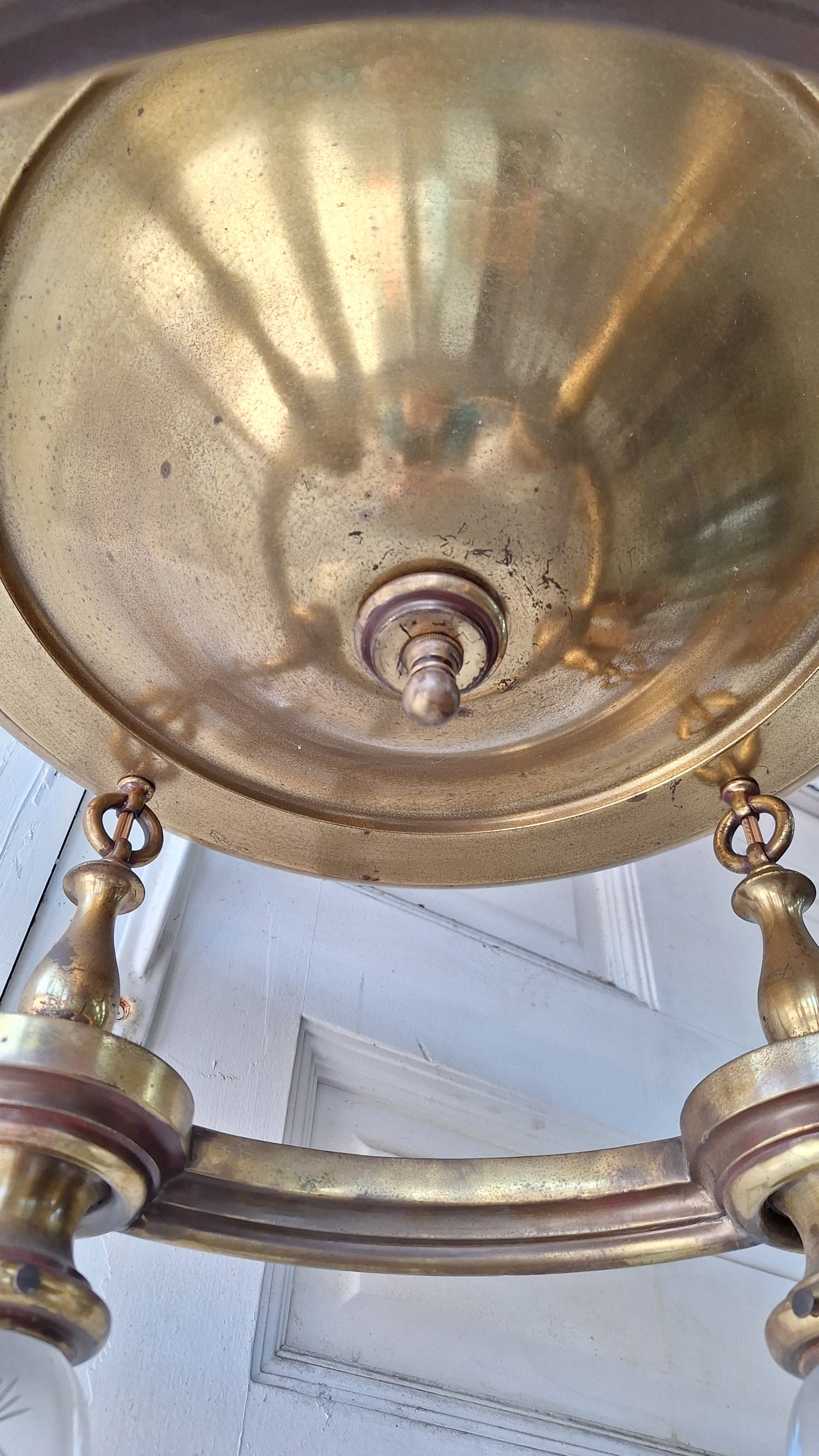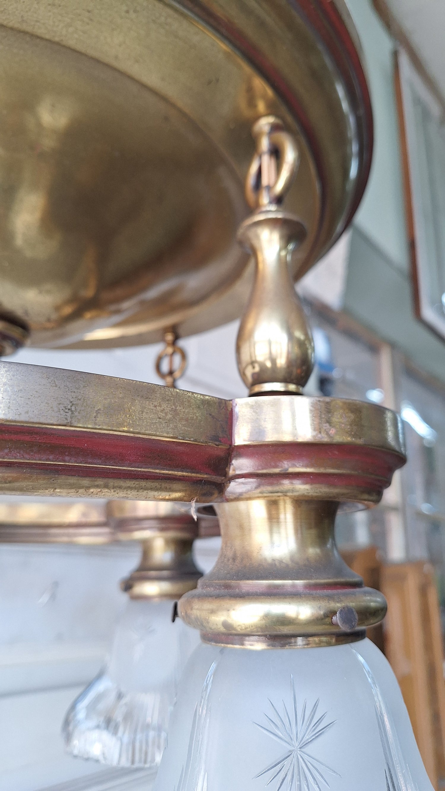 A beautiful, fully refurbished antique light with a pan style base and brass 'hoop' that holds four sparkling, cut glass shades. The brass body has areas that have been highlighted with a red brown glaze; the rest is a gorgeous brass color. Please see all of our pictures for details.