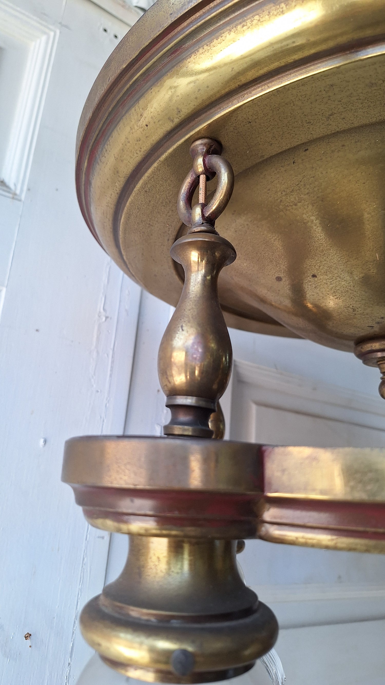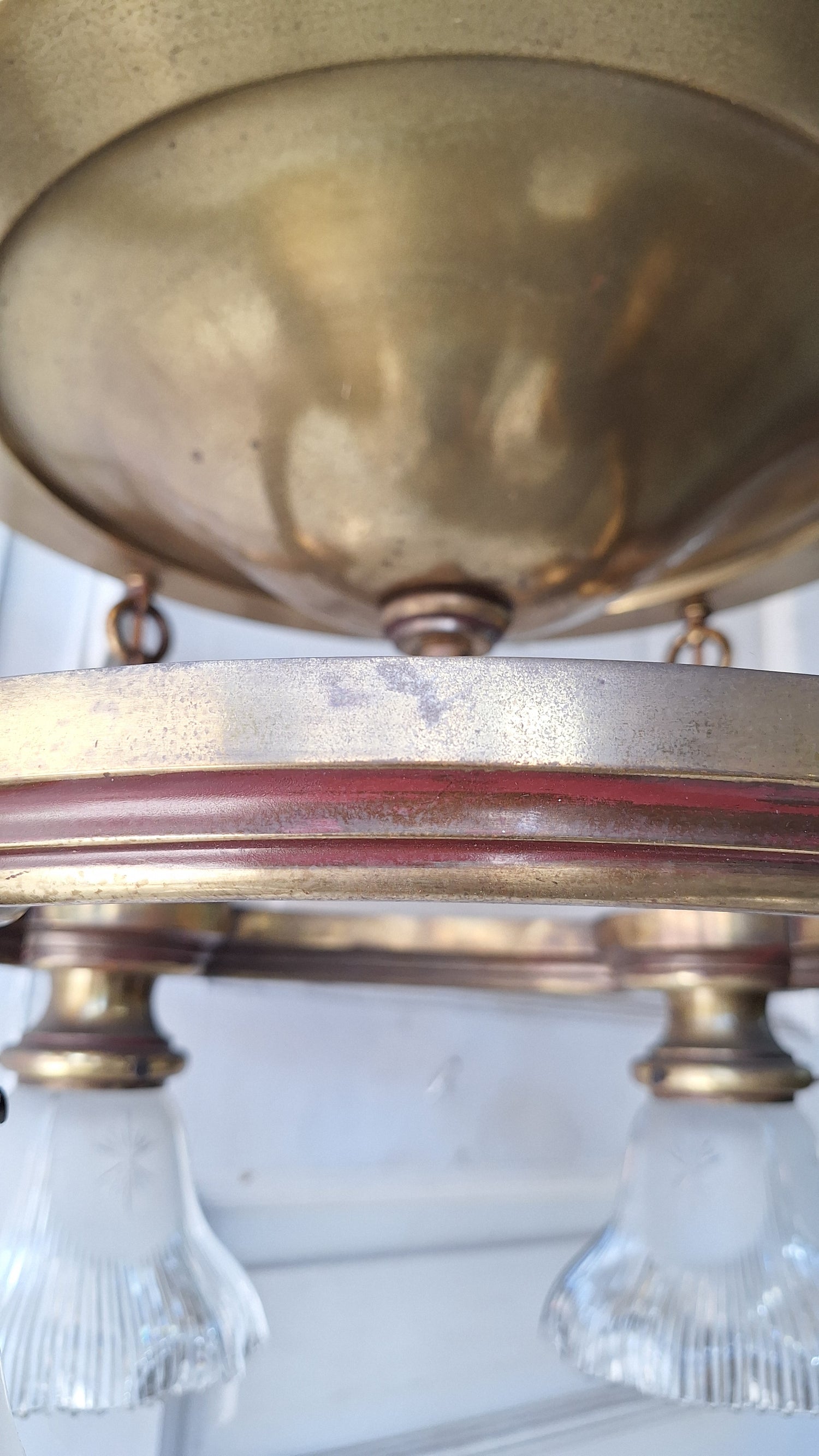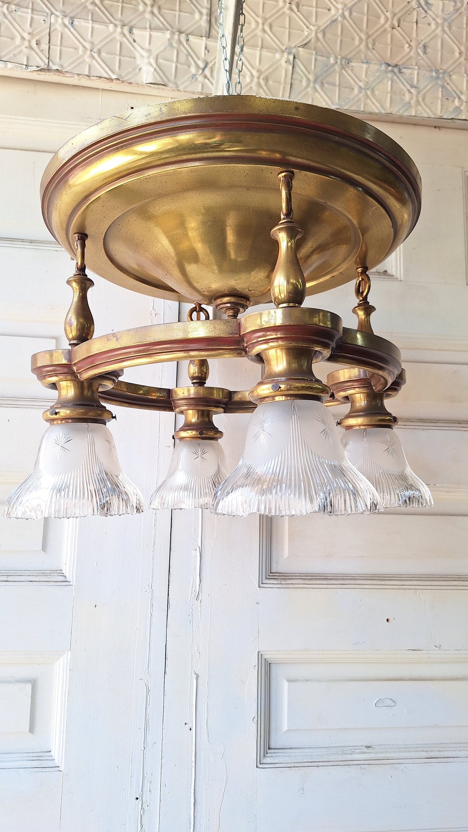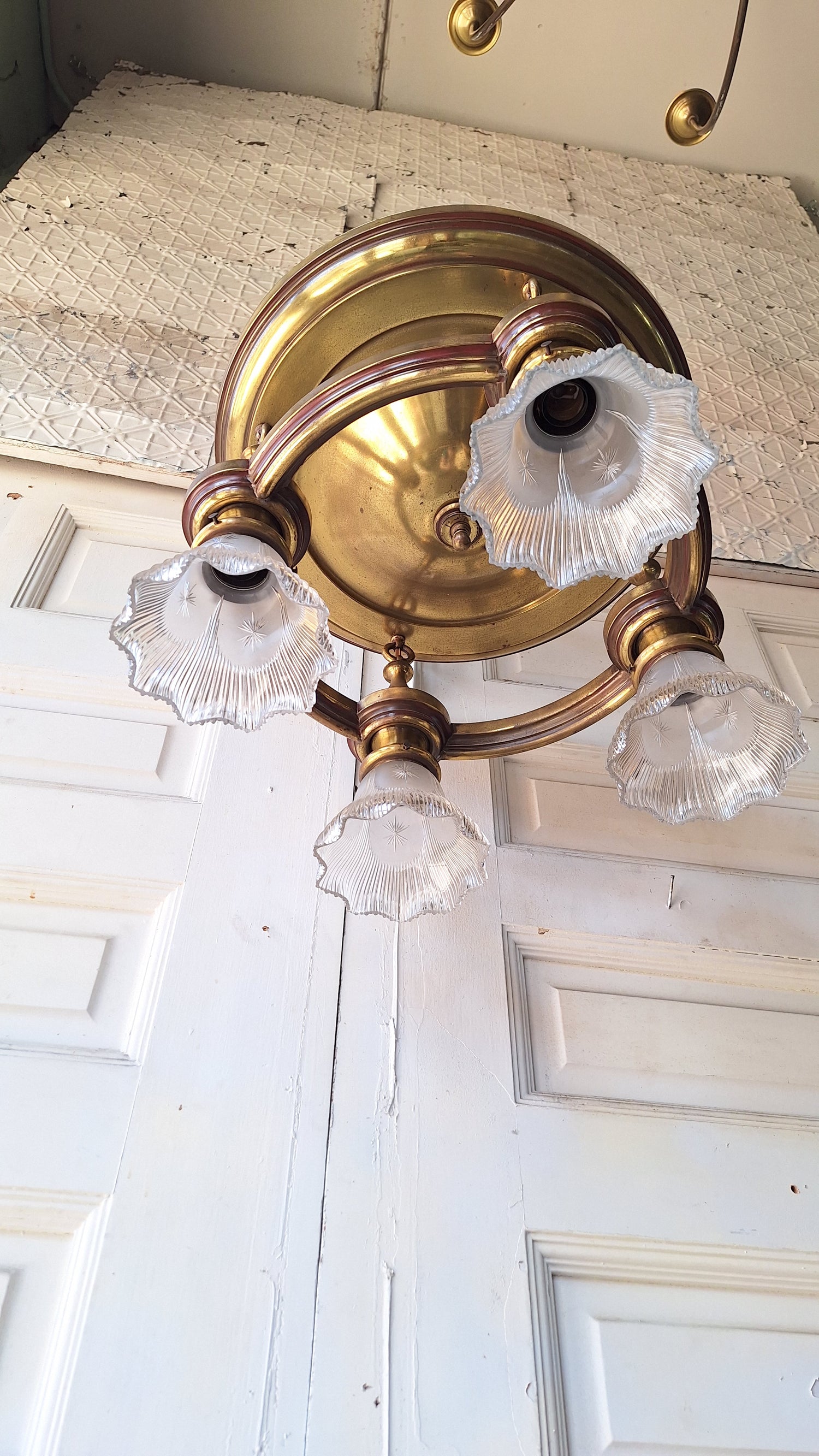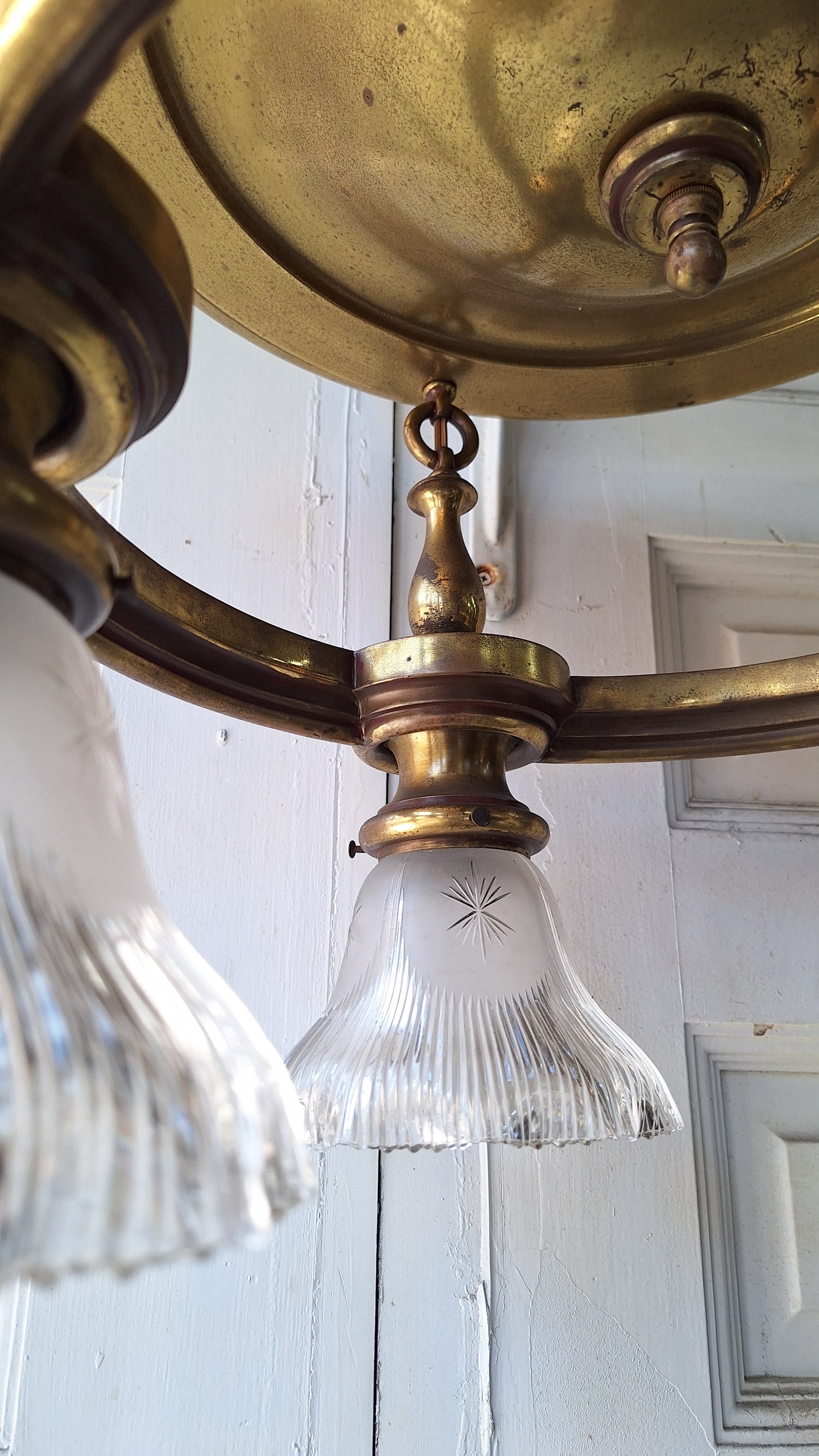 A beautiful, fully refurbished antique light with a pan style base and brass 'hoop' that holds four sparkling, cut glass shades. The brass body has areas that have been highlighted with a red brown glaze; the rest is a gorgeous brass color. Please see all of our pictures for details.