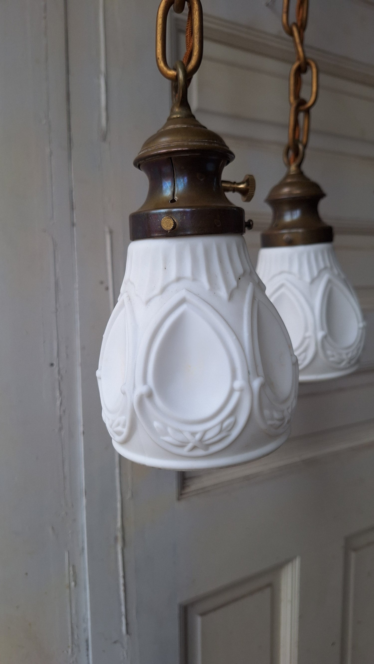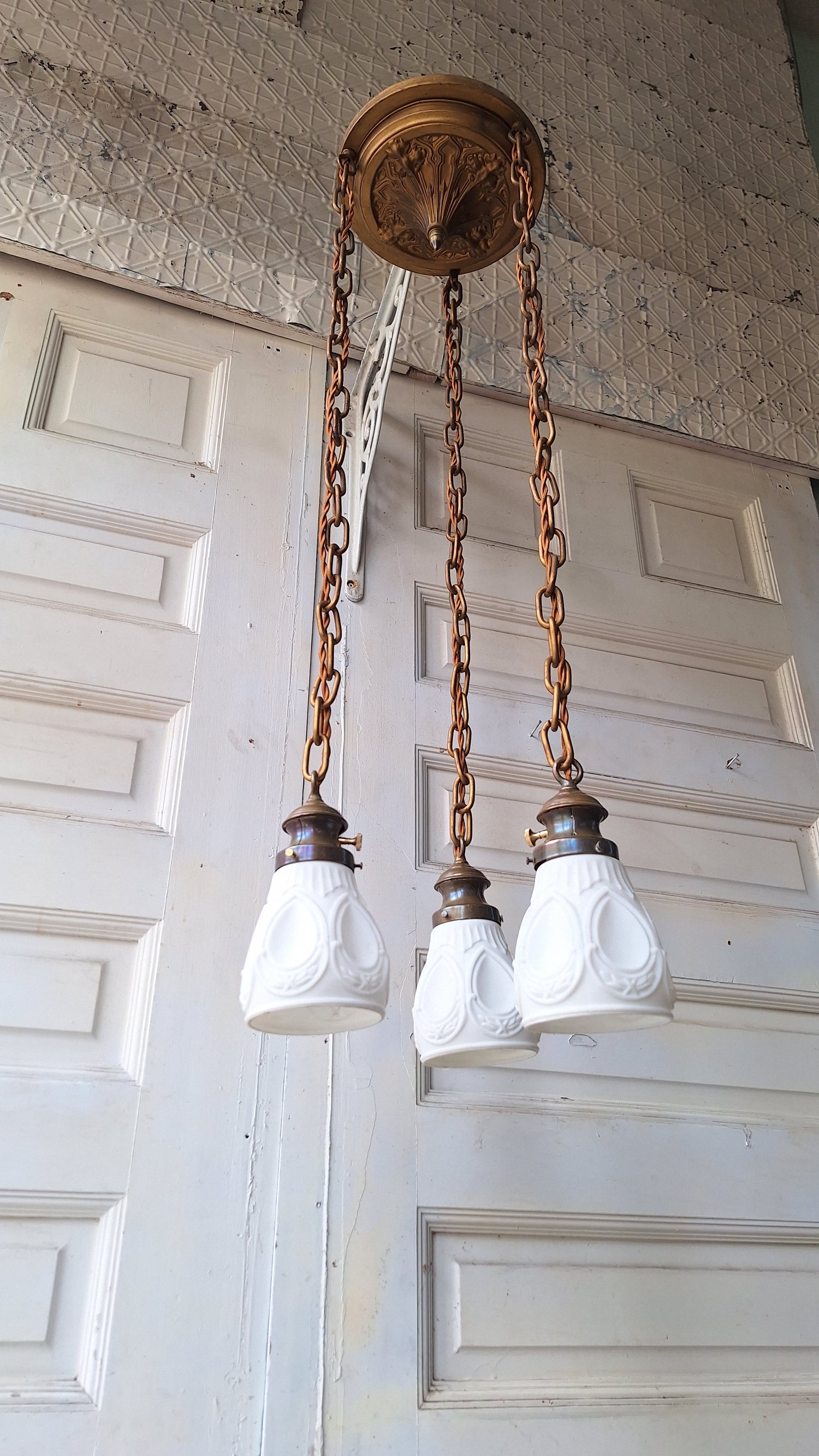 A beautiful Sheffield style brass pan light with three beautiful hanging sockets. There are three coordinating shades in white frosted glass in a molded, teardrop design. The glass shades are in very good condition with minimal signs of wear.