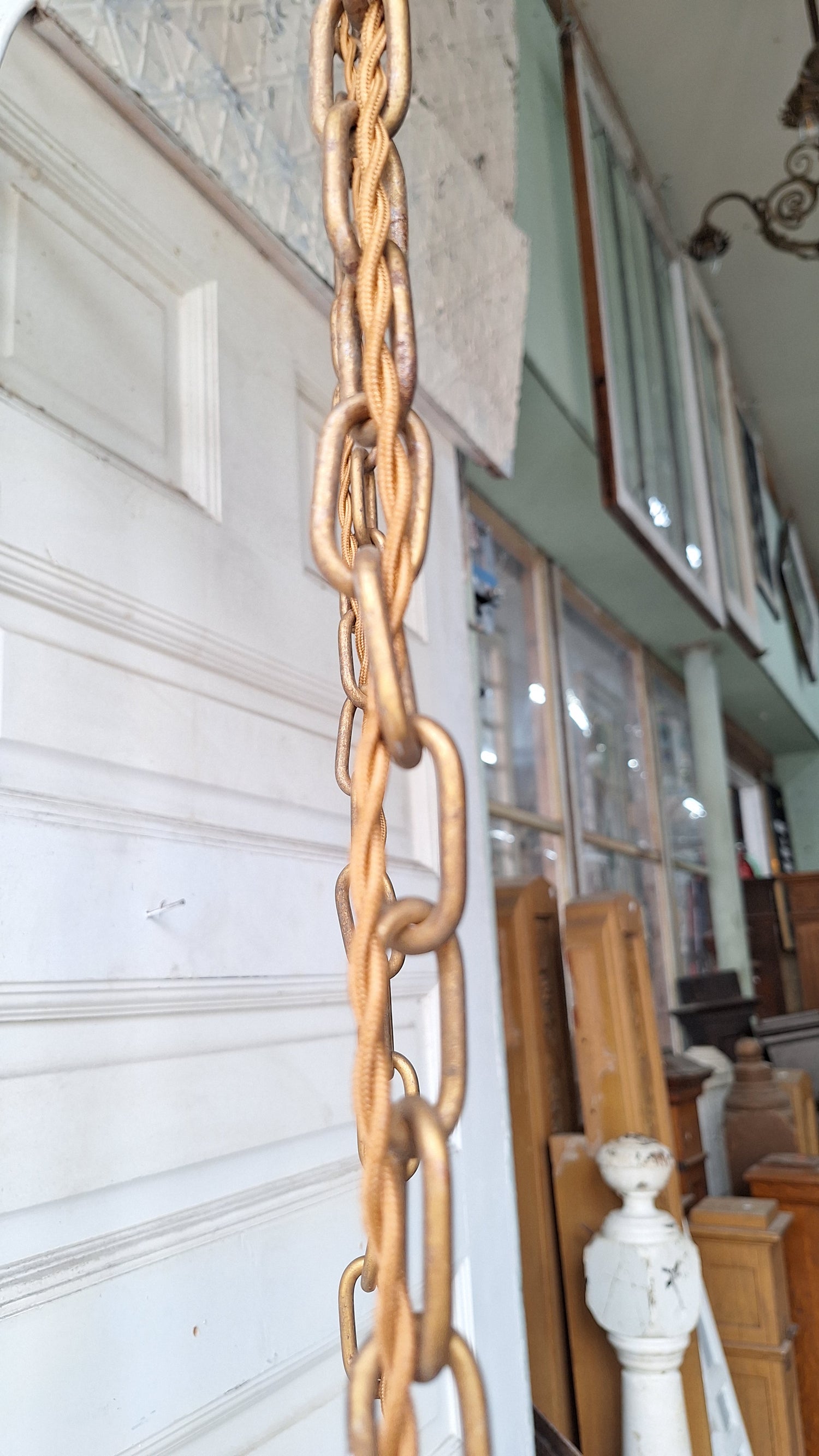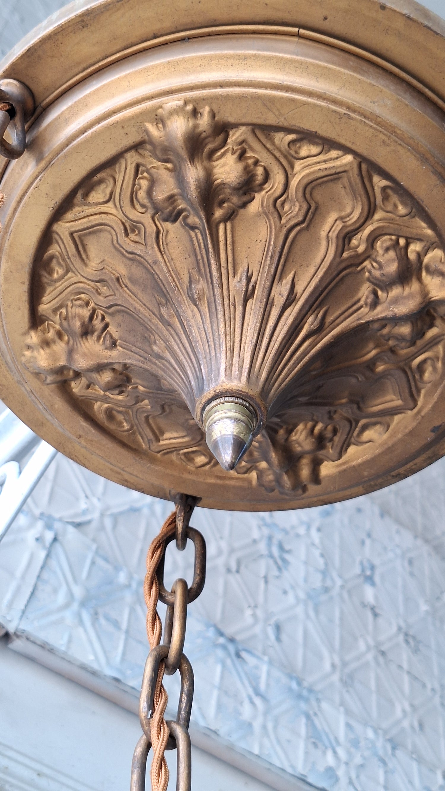 This antique hanging chain pan light measures 40" tall overall by 9" wide at the canopy. It can be shortened before shipment (chains are 29" long); message us for details. This item ships free within the continental US. No PO boxes please.