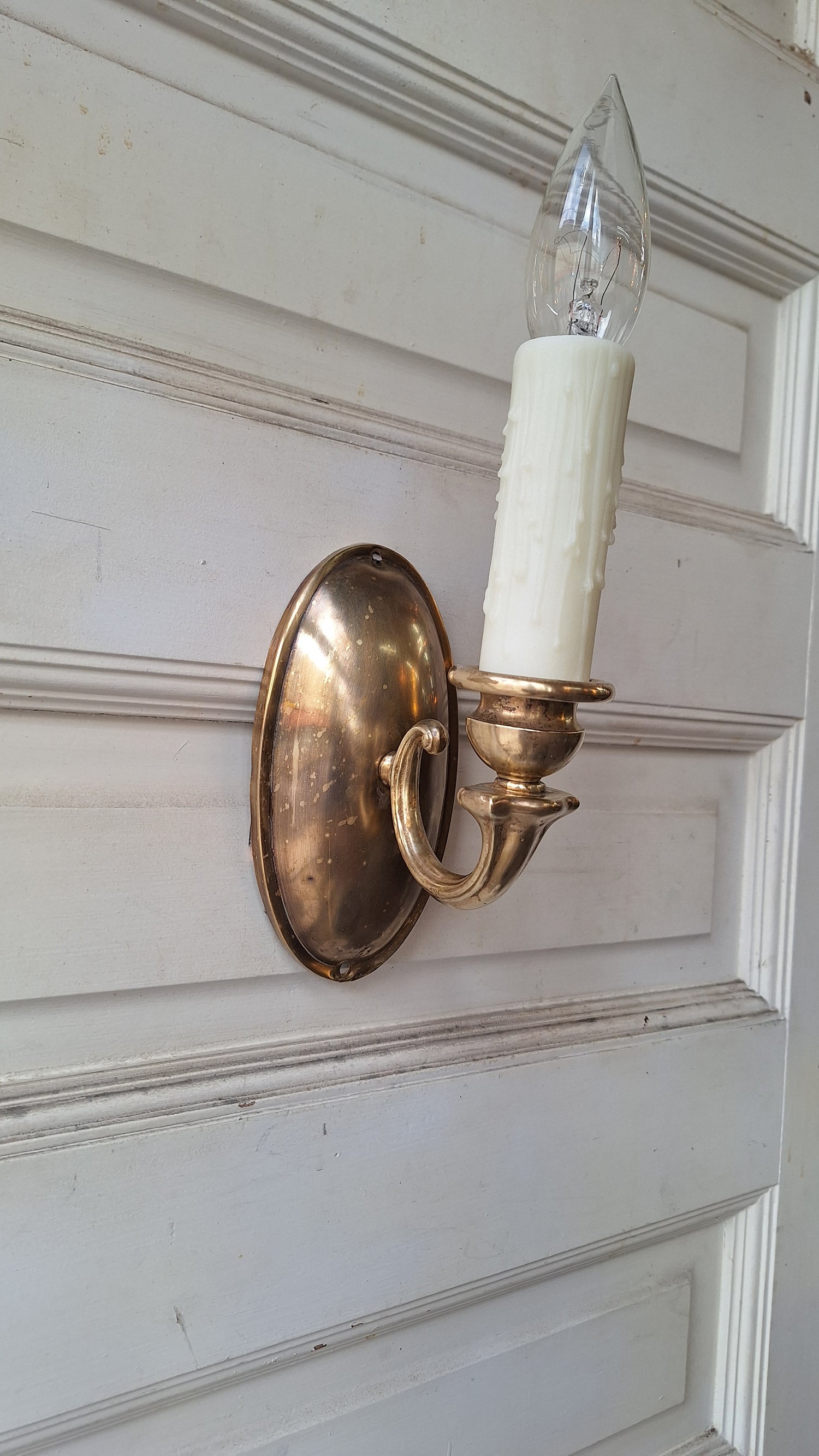 A single, antique brass wall sconce made from stamped brass with a cast brass arm. The light has been rewired with a new socket and wax-like candle cover.