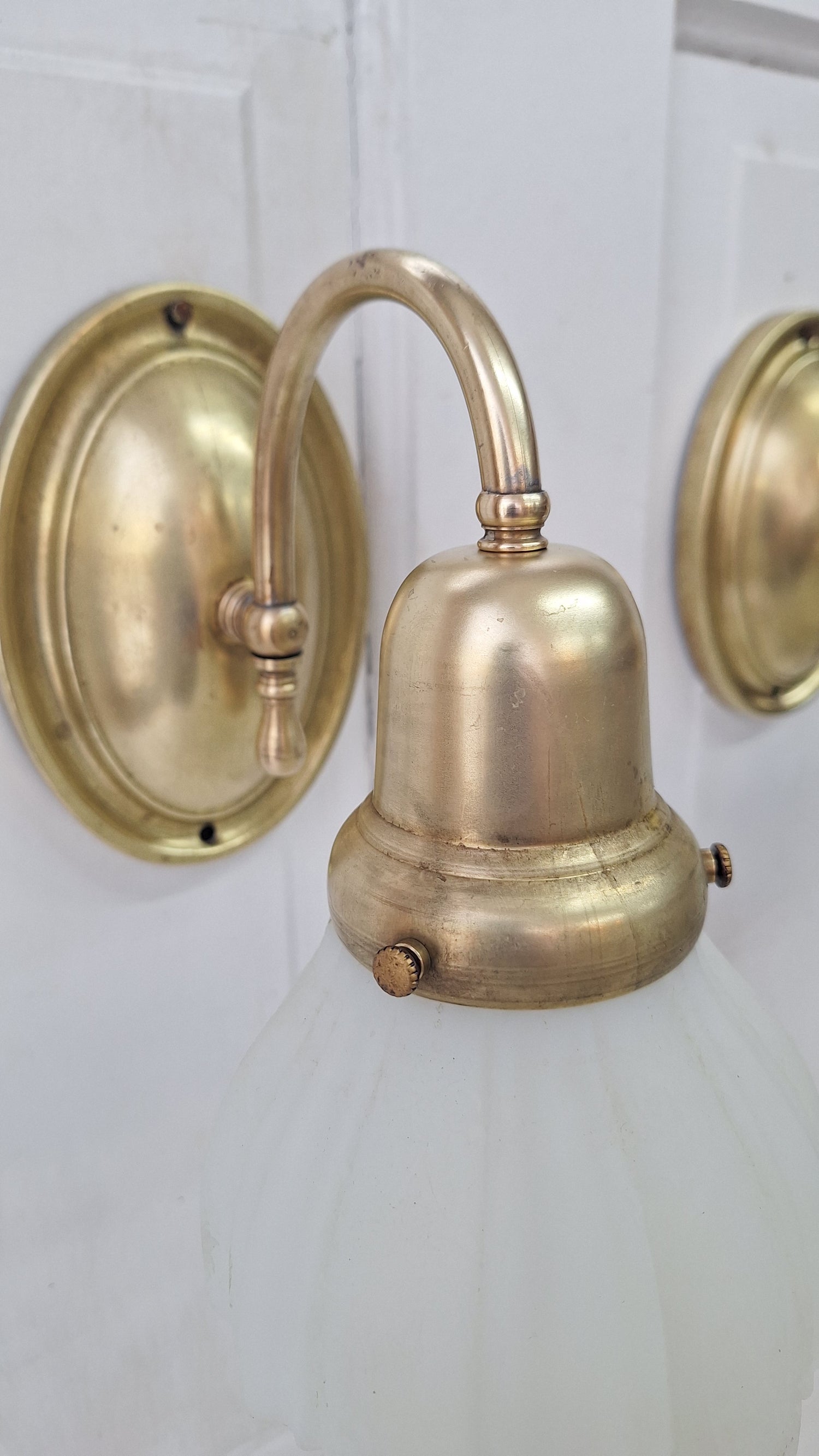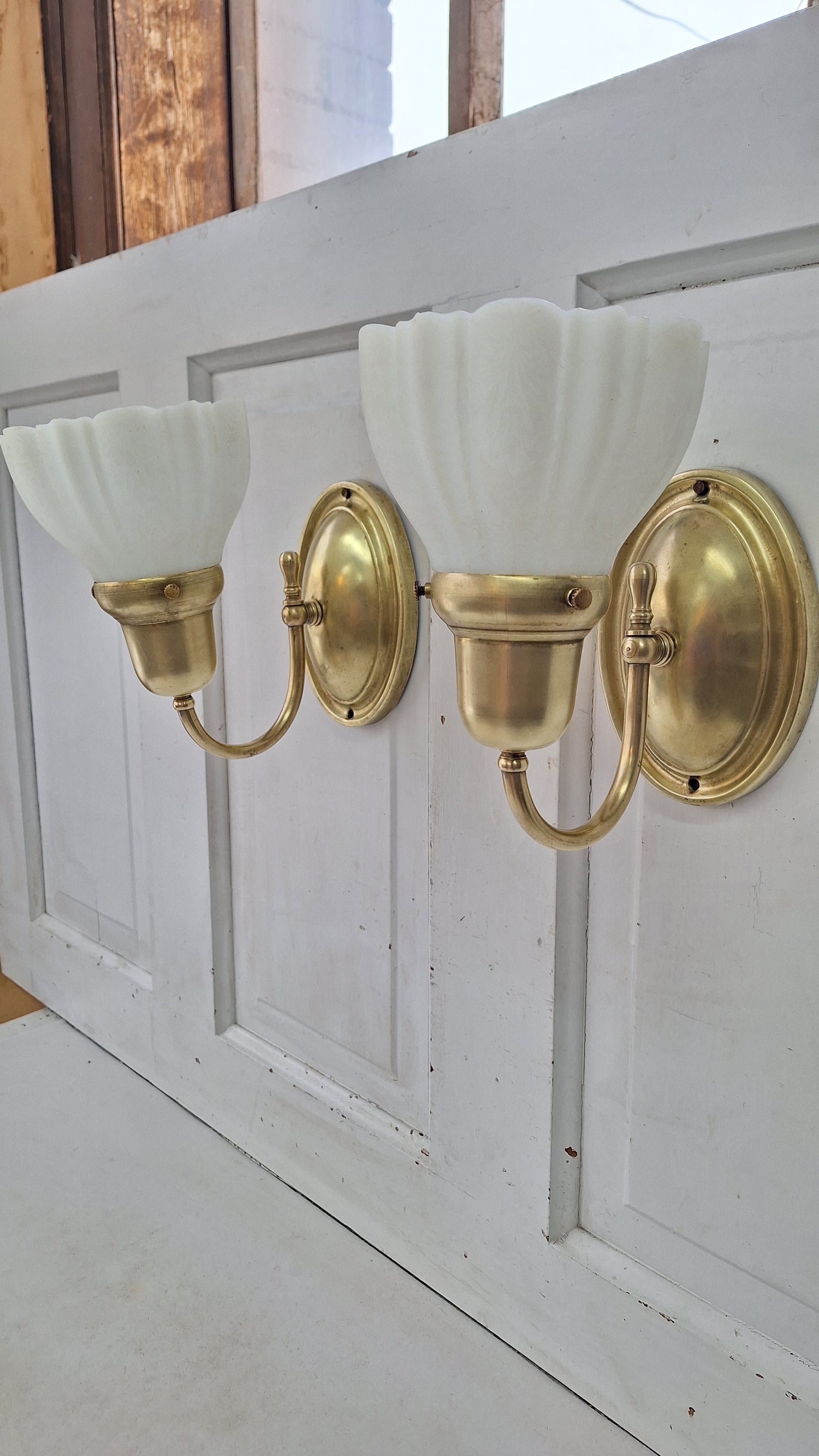 A pair of antique brass sconces with scalloped edge shades with a sublte etched floral pattern. The wiring has been redone and this pair is ready to be installed. This pair would be a beautiful addition on either side of a bathroom mirror or the perfect way to light up a hallway with historic charm. They can be installed angled up or down as shown in the photos. There are a few minor dark spots in the brass as shown.
