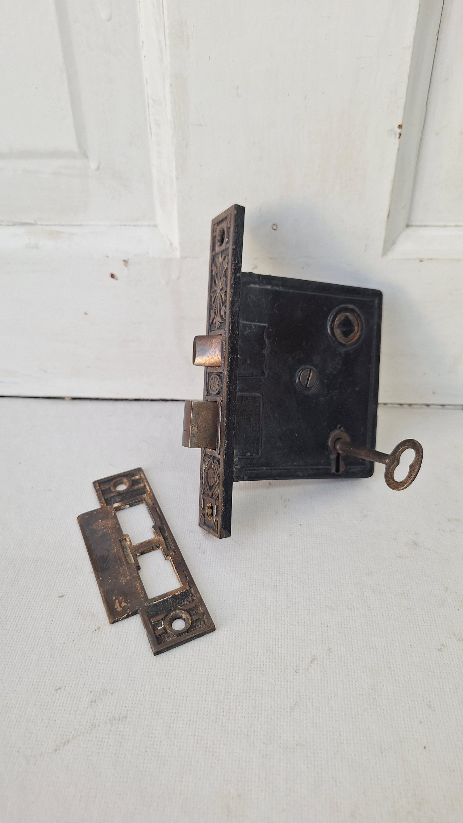 Antique Fancy Bronze Mortise Lock with Skeleton Key: Working Door Lock