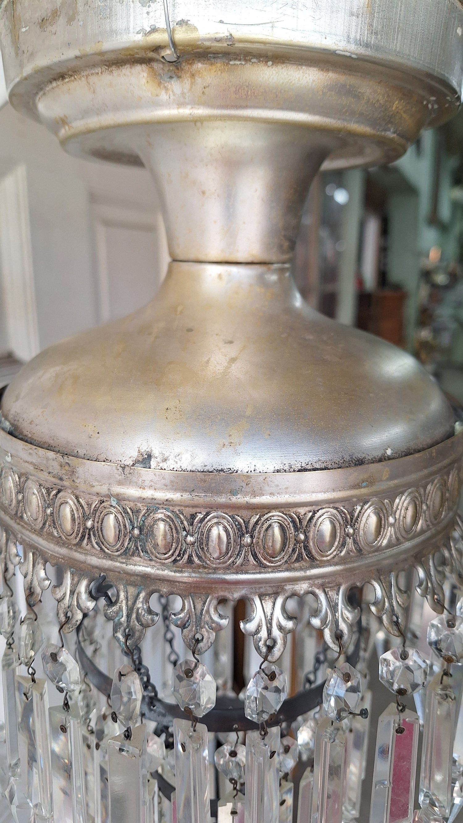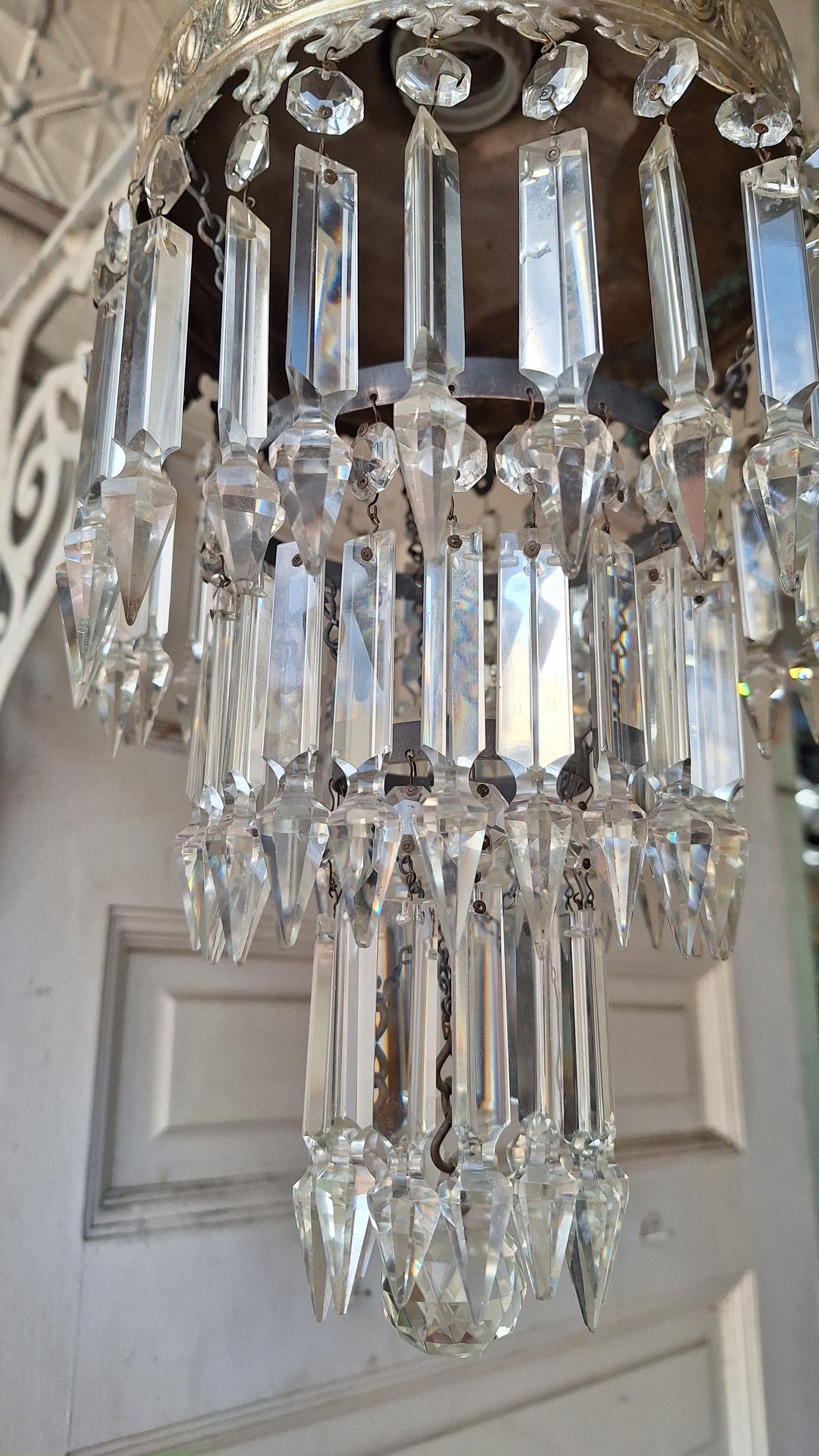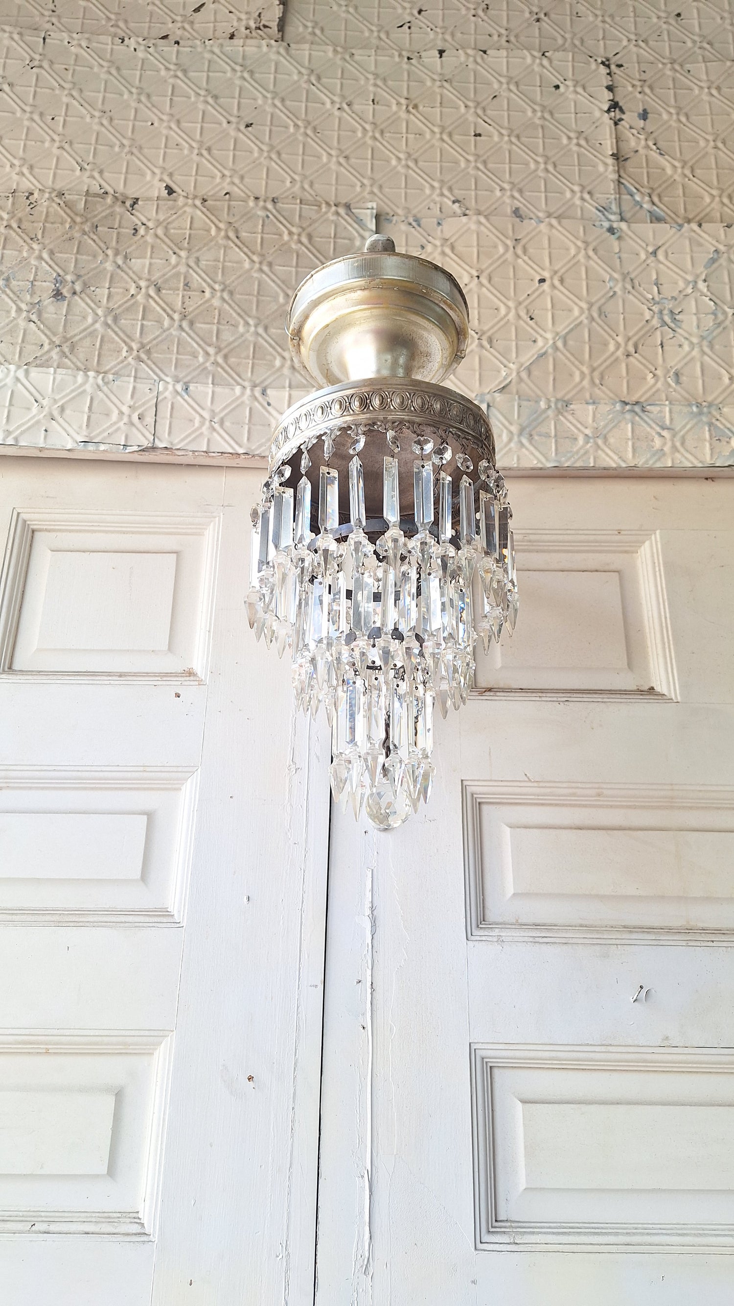 A sparkling crystal chandelier with cut prisms and decorative stamped brass top with a silver finish. This would be the perfect small light for a bedroom, bathroom, or hallway. There is a small amount of paint around the top edge, but otherwise this piece is in good, working condition and the crystals are all intact and in good condition as well. The silver finish does show darker signs from age and wear as shown.