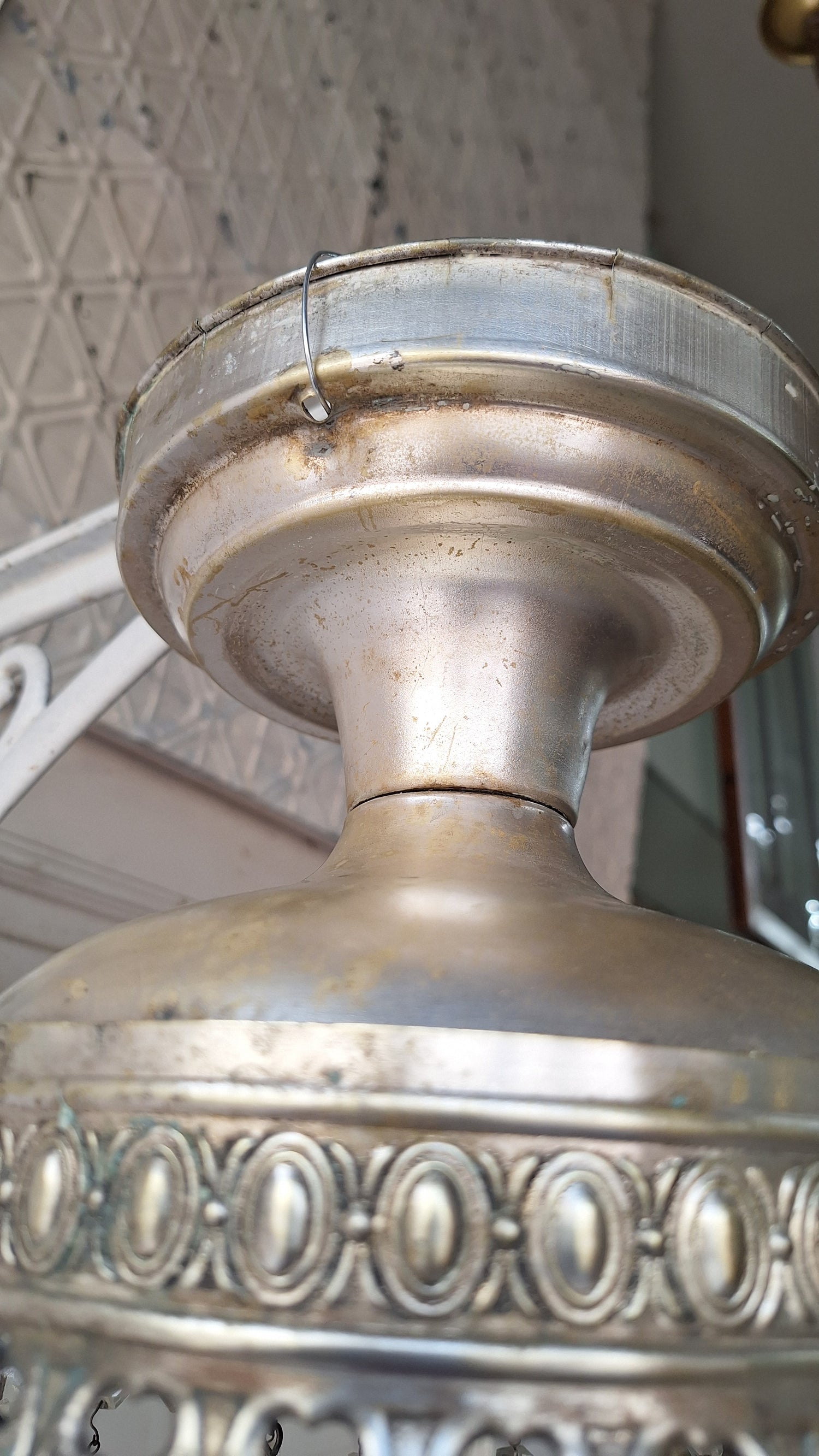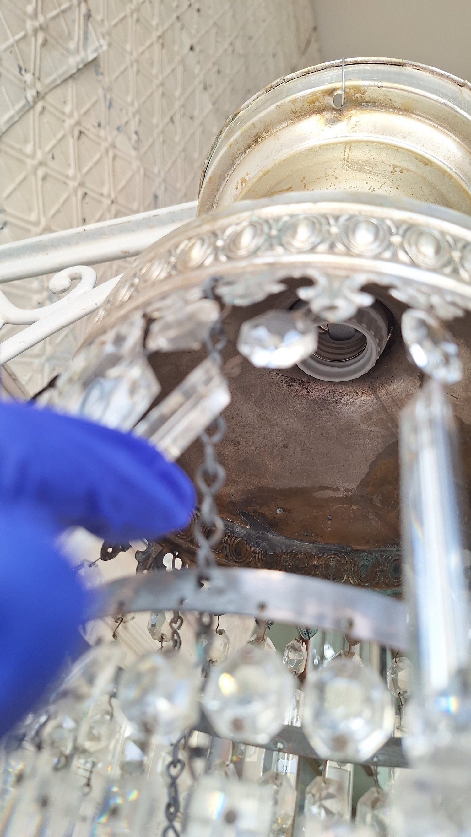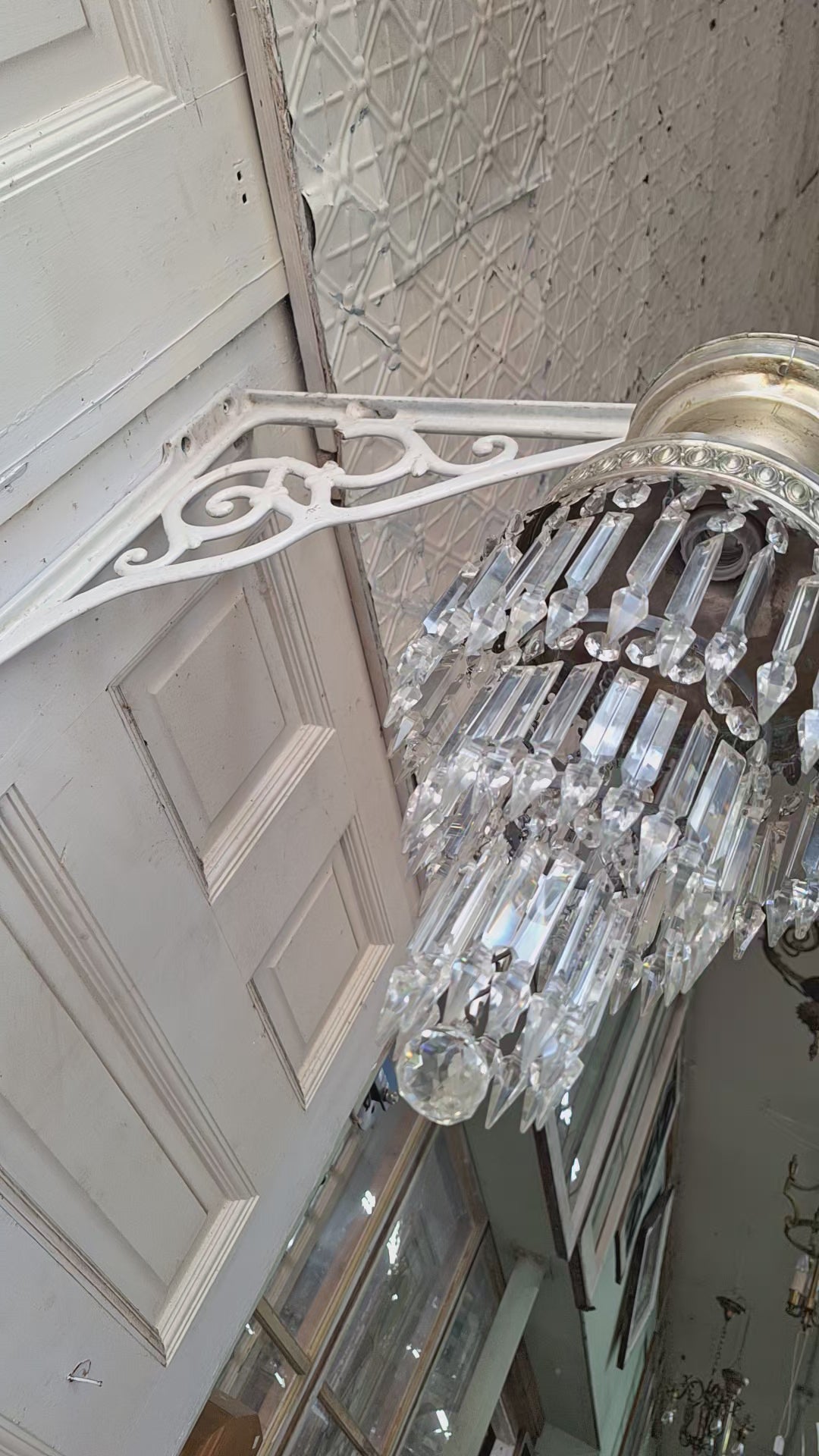 A sparkling crystal chandelier with cut prisms and decorative stamped brass top with a silver finish. This would be the perfect small light for a bedroom, bathroom, or hallway. There is a small amount of paint around the top edge, but otherwise this piece is in good, working condition and the crystals are all intact and in good condition as well. The silver finish does show darker signs from age and wear as shown.