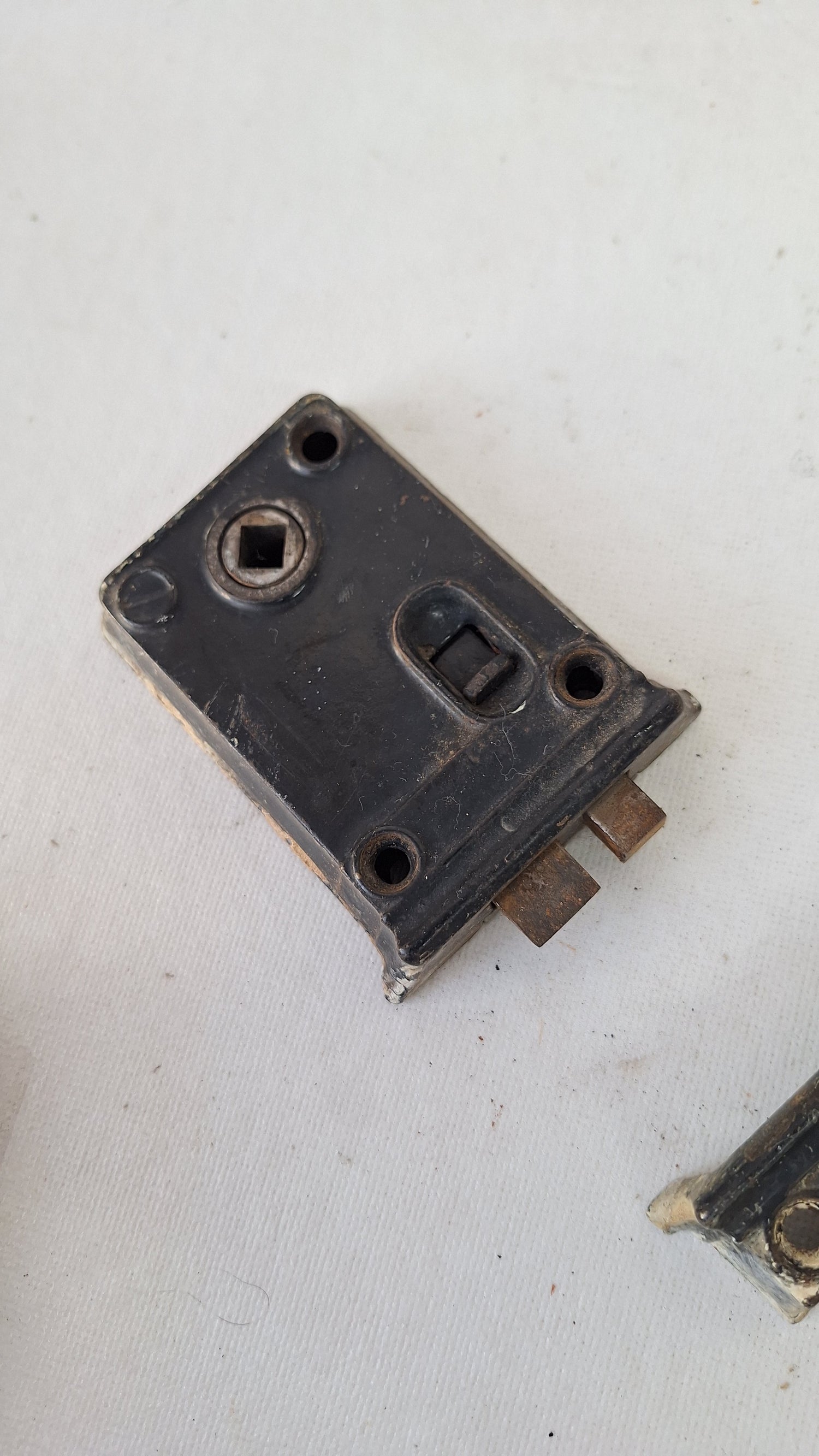 A working antique rim lock for use on interior doors with the matching strike or latch keeper. These are older style locks common during the late 1800s and earlier. All parts are in working order. There is some paint remaining around the outside edges as shown. Please see all of our pictures for details and dimensions. This item ships free within the US.