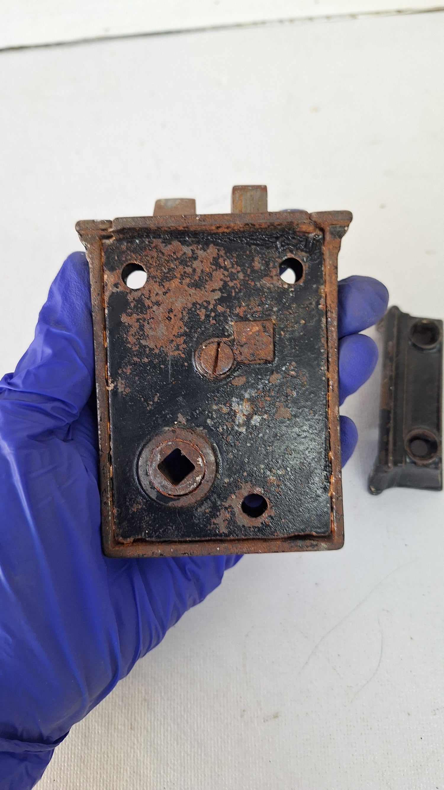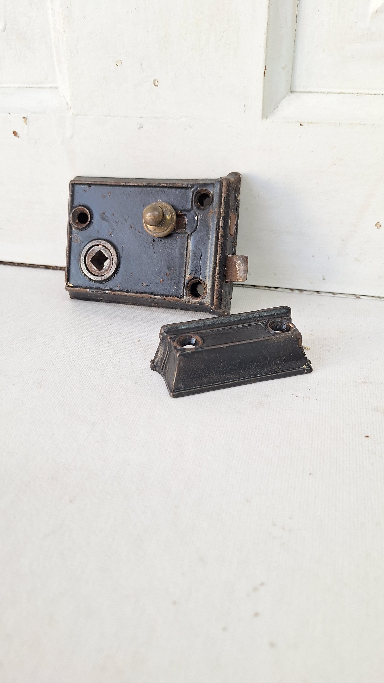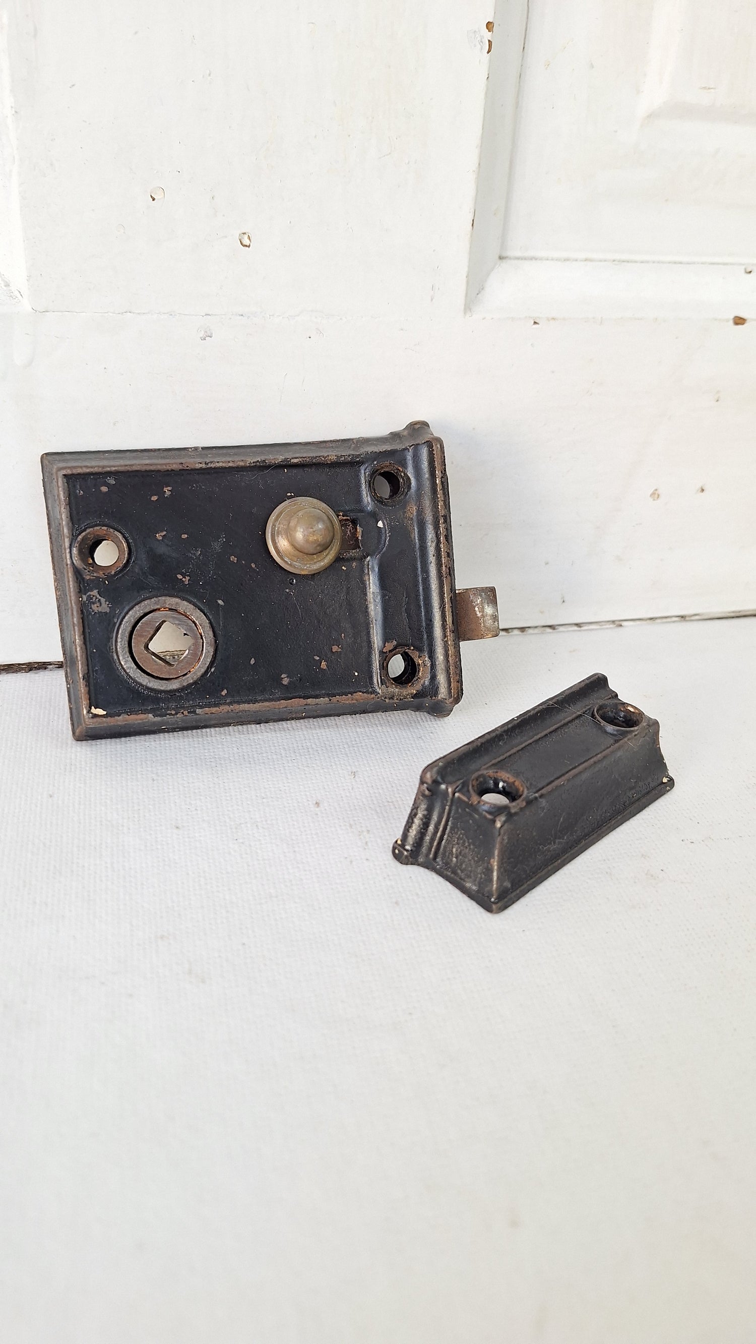 Antique Door Rim Lock and Keeper, Cast Iron Surface Mount Lock with Privacy Latch