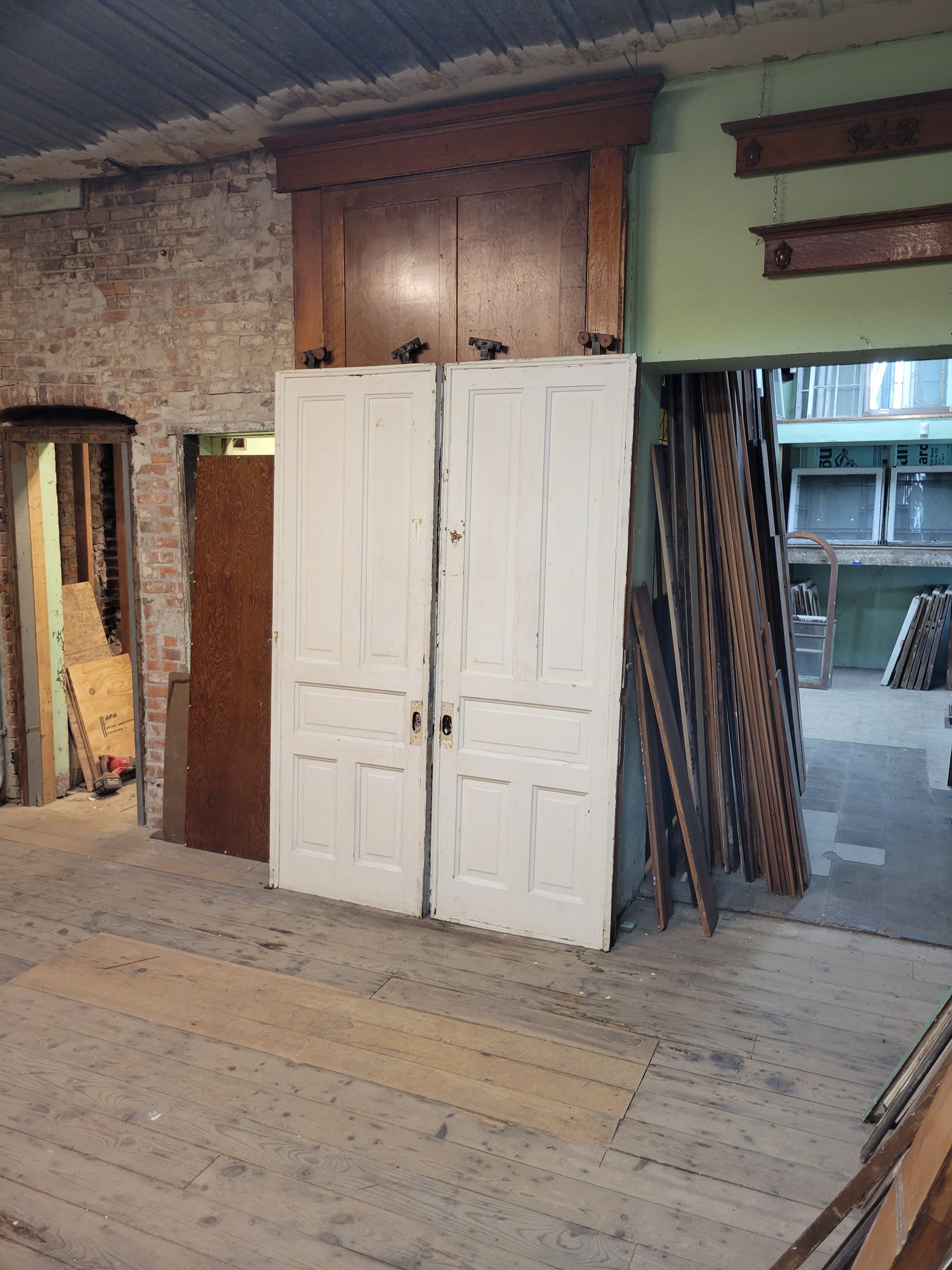 61x89 Antique Double Solid Wood Pocket Doors, Victorian Recessed Sliding Doors