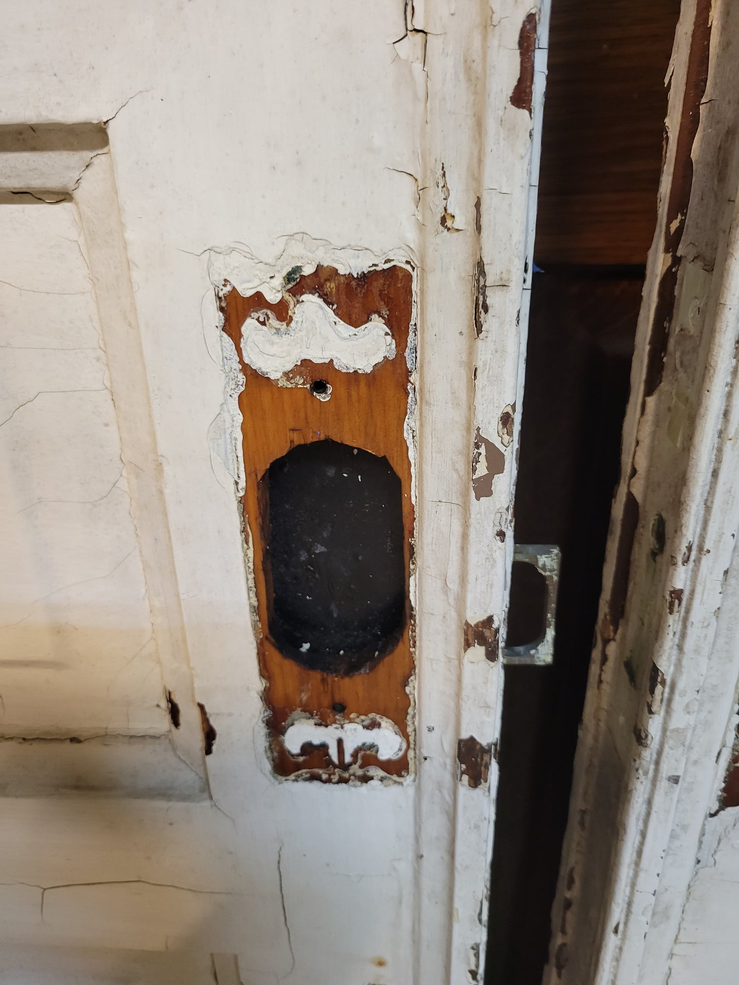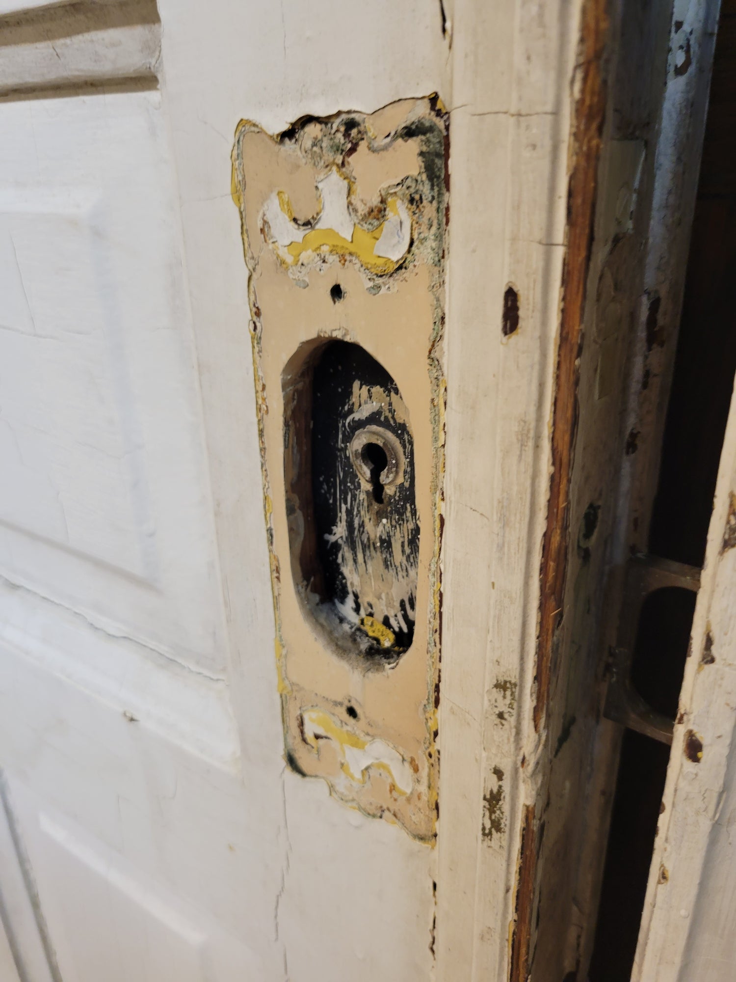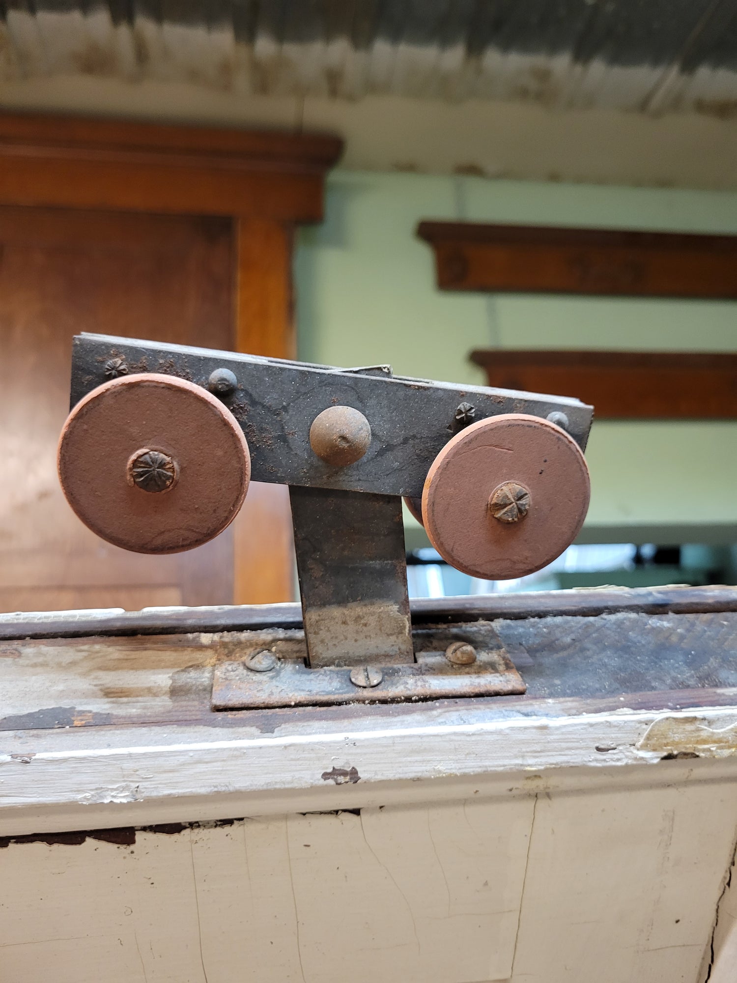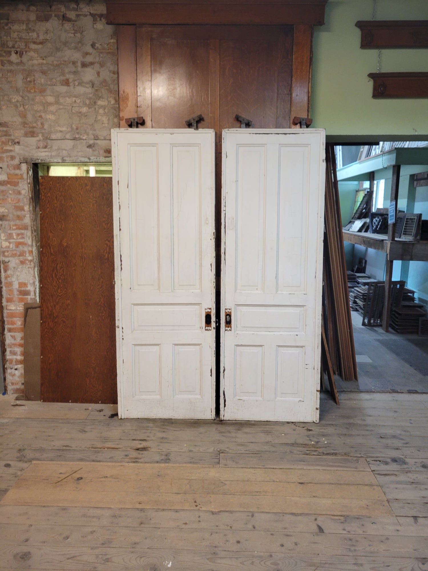 An antique pair of white painted, raised panel doors. These were originally designed to roll into a wall where they would be hidden until pulled out, but many buyers opt for an exterior mount or 'barn door' style mounting. The set's painted finish is distressed from many years of use as shown and there are some small holes from previous installation of hardware. There are no pull handles included with this set, but the original mortise locks are still in the doors although they have been painted over and one spring loaded handle is stuck in the 'out' position as shown in the photos. The rollers are missing some of their wheels. New rollers can be purchased from many online retailers or home improvement stores to use with these doors and would be an attractive upgrade from the utilitarian rollers these have currently.