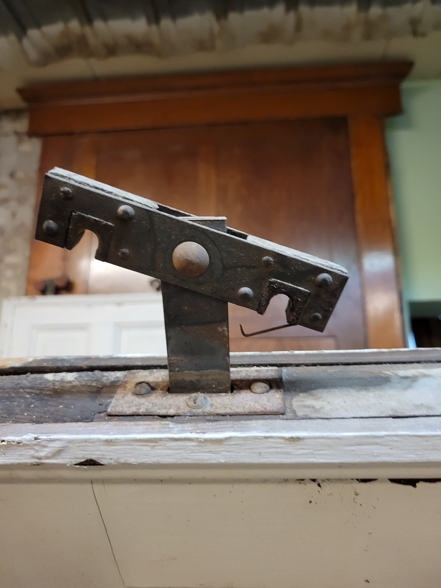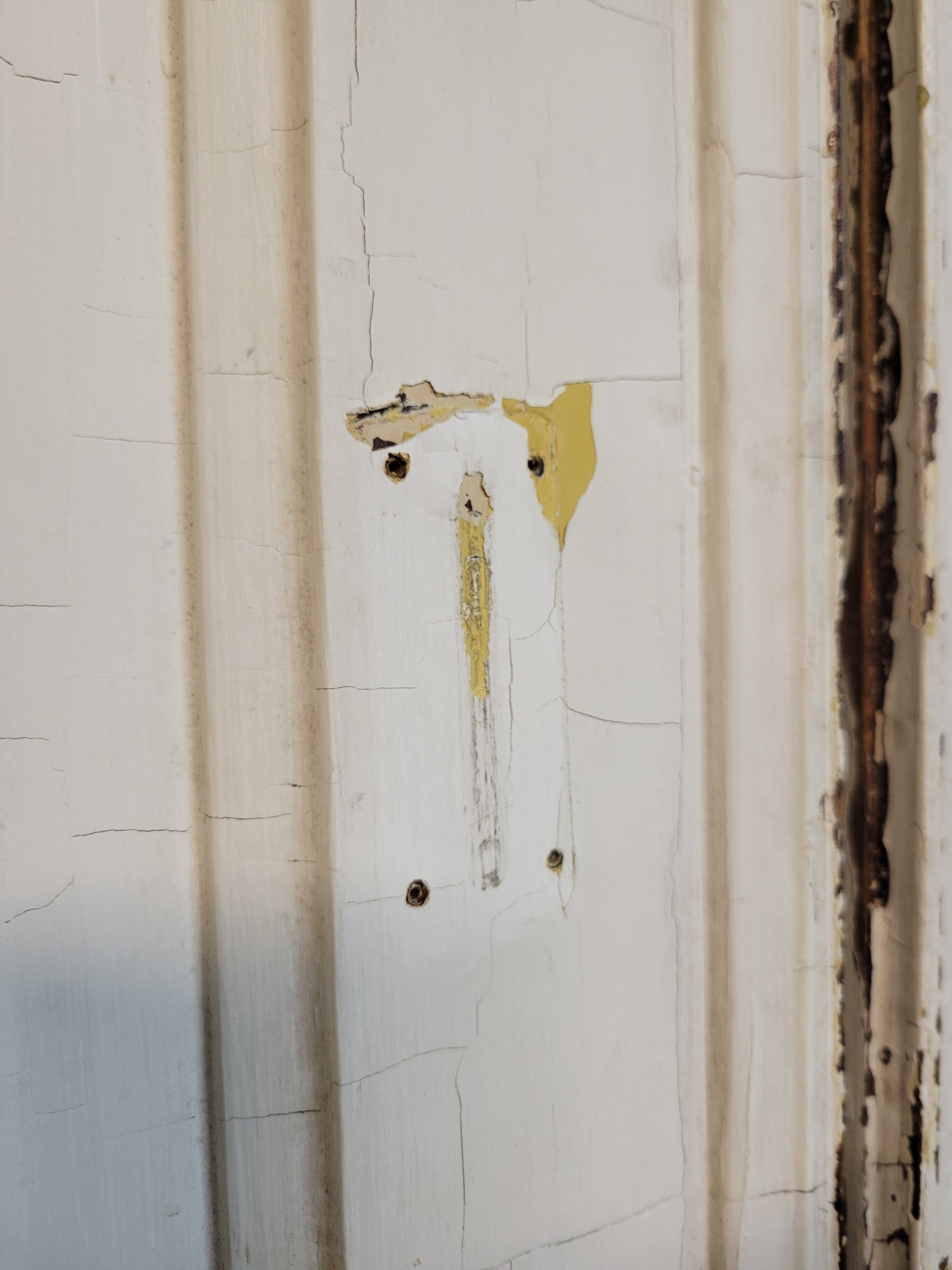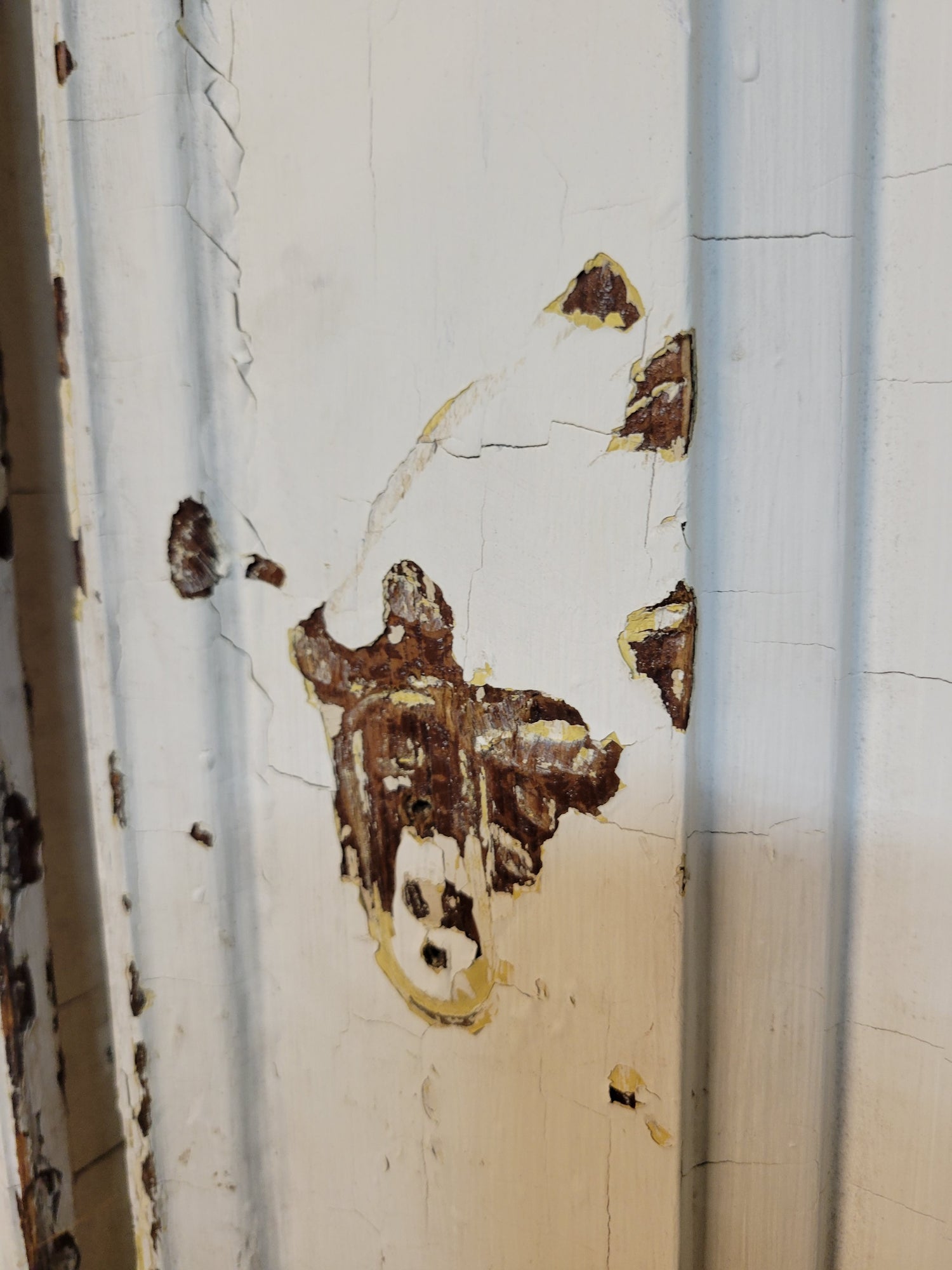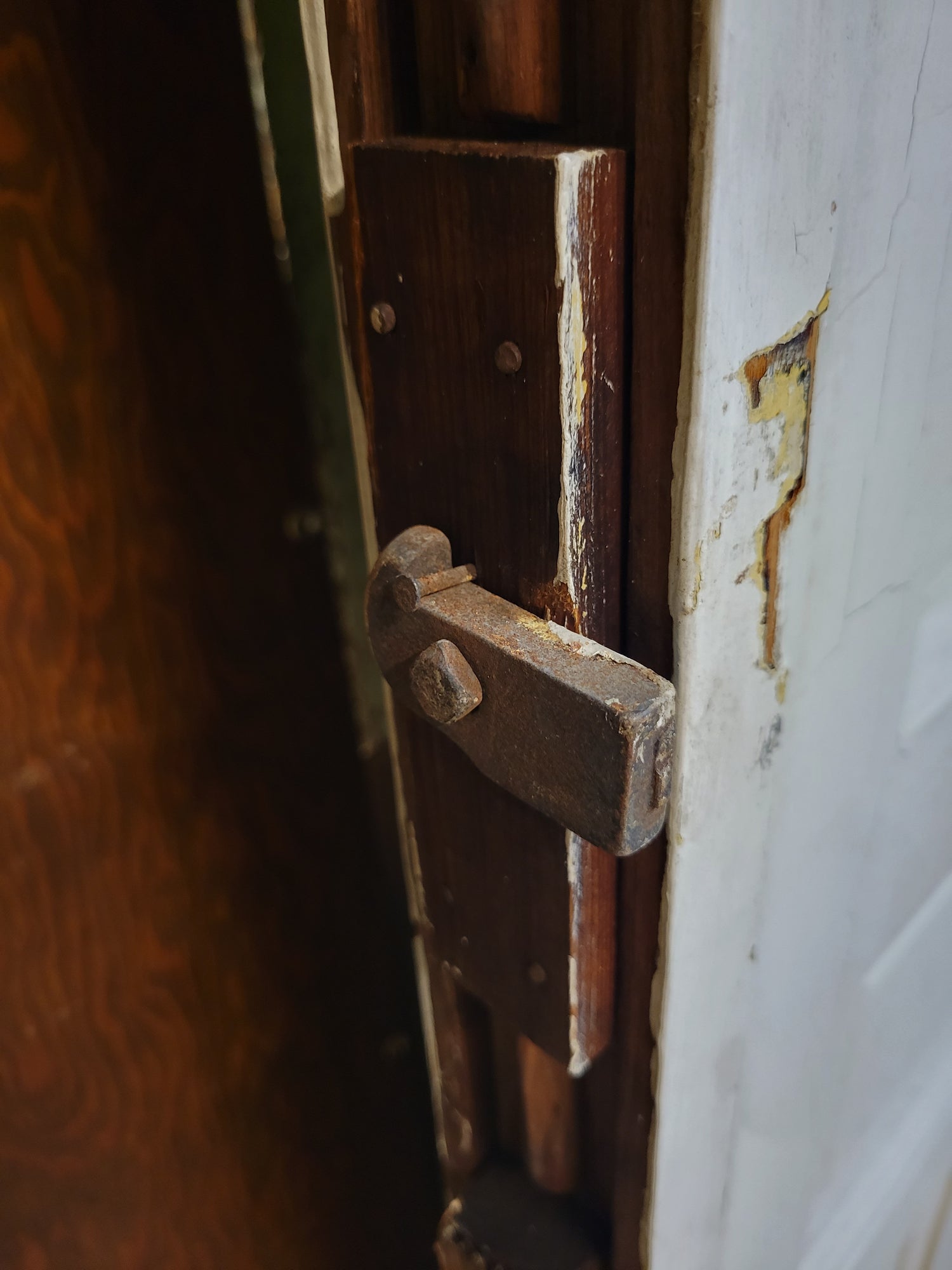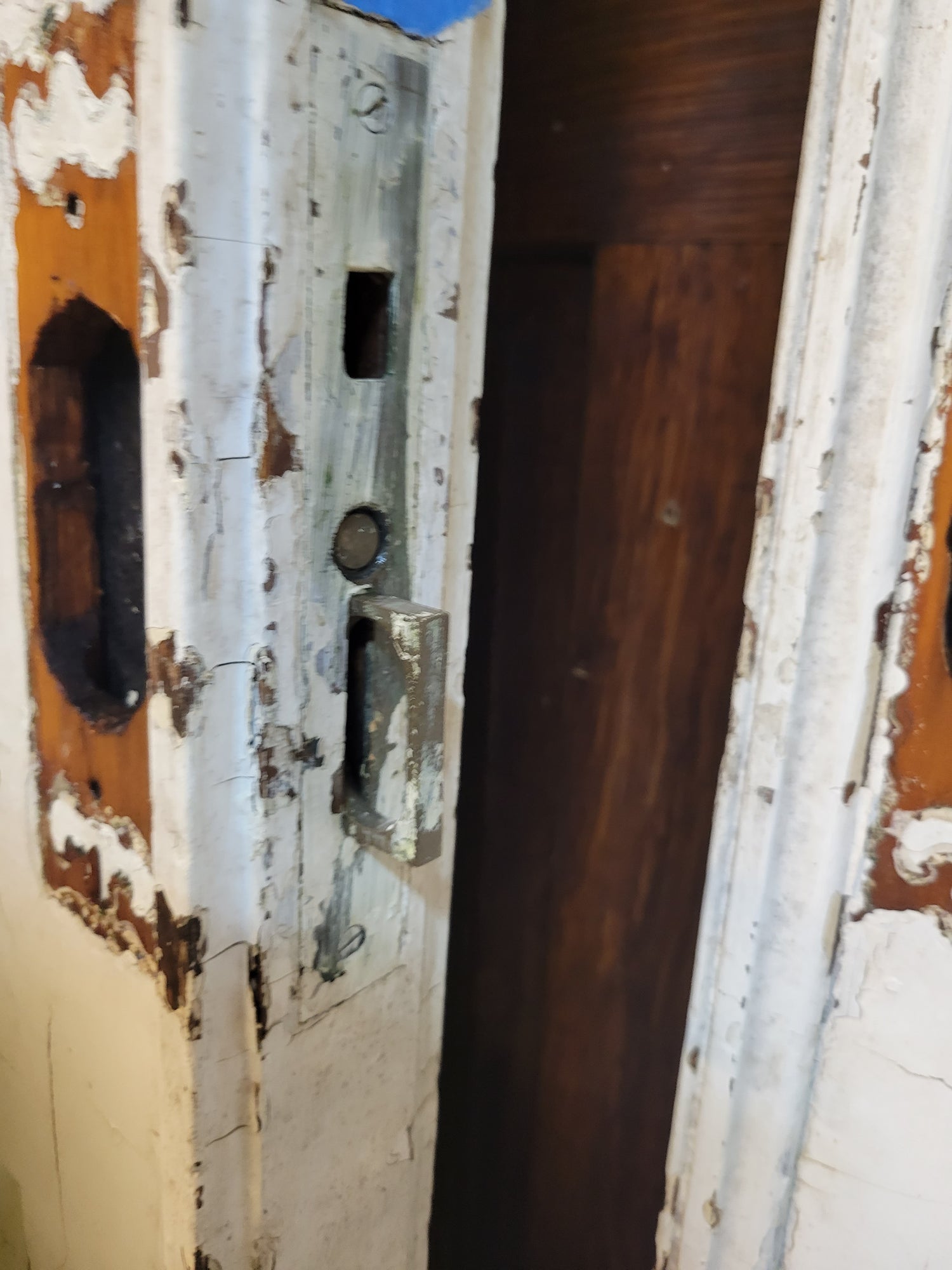 An antique pair of white painted, raised panel doors. These were originally designed to roll into a wall where they would be hidden until pulled out, but many buyers opt for an exterior mount or 'barn door' style mounting. The set's painted finish is distressed from many years of use as shown and there are some small holes from previous installation of hardware. There are no pull handles included with this set, but the original mortise locks are still in the doors although they have been painted over and one spring loaded handle is stuck in the 'out' position as shown in the photos. The rollers are missing some of their wheels. New rollers can be purchased from many online retailers or home improvement stores to use with these doors and would be an attractive upgrade from the utilitarian rollers these have currently.