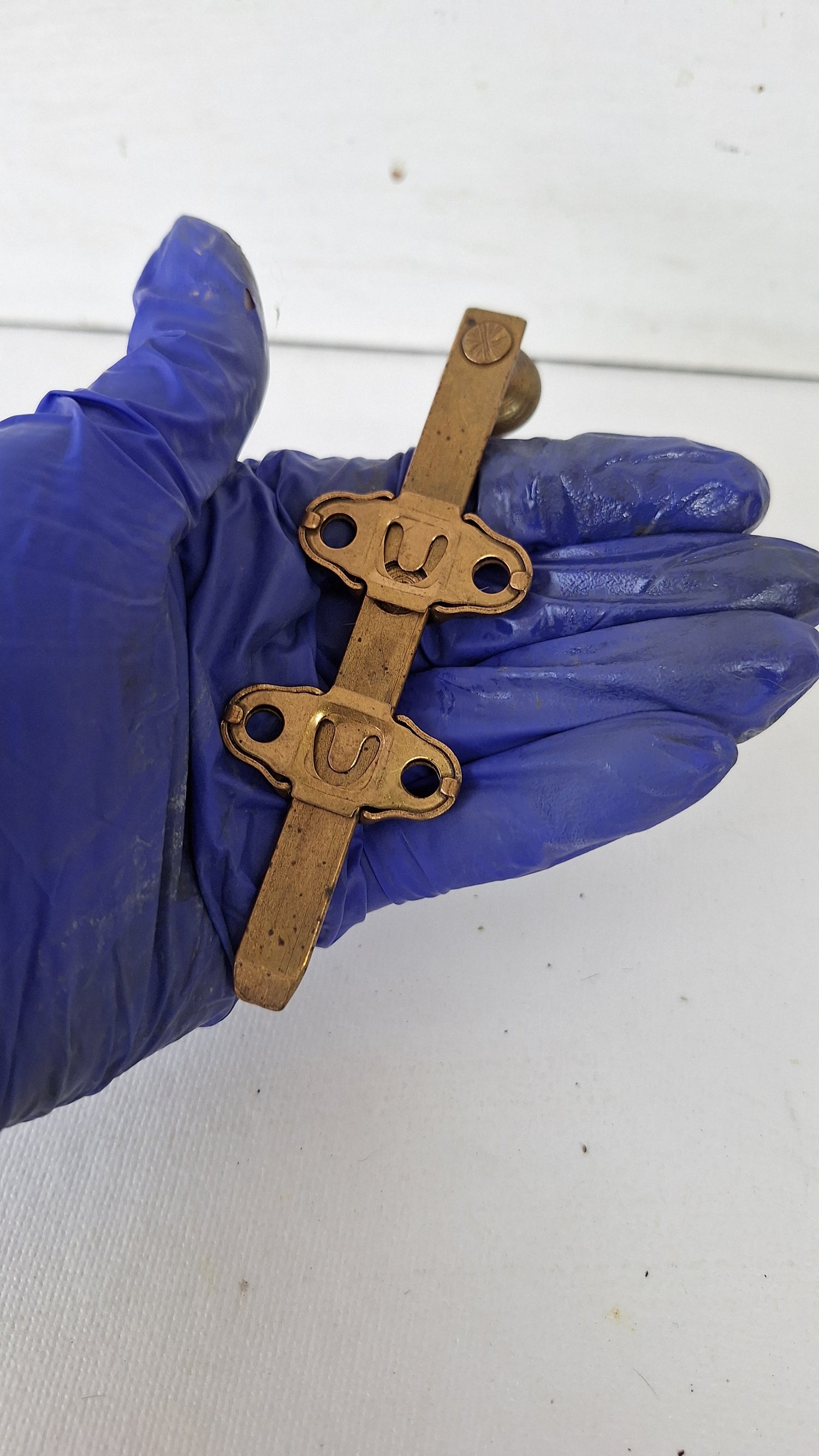 A working vintage iron French door latch. This style was typically found at the top of one door of a double door set and would latch into a strike plate in the door jamb to keep the pair securely closed. This piece is in 'as found' condition. Please see all of our pictures for details and measurements. This item ships free within the US.