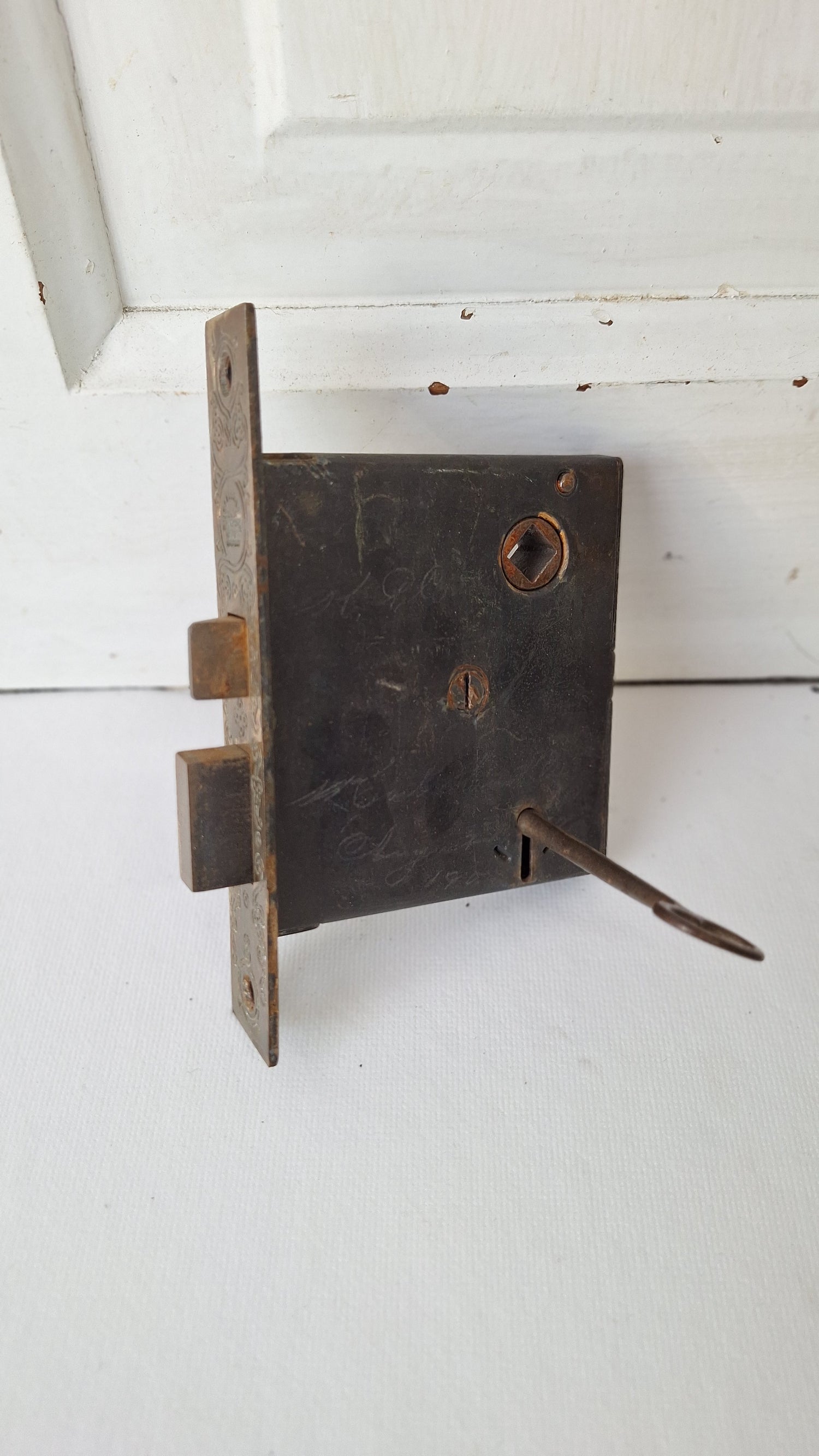 An ornately designed salvaged mortise lock in working condition complete with a coordinating skeleton key that operates the privacy lock. This piece has been cleaned and works well. The mortise can be opened to switch the direction of the latch for a different swing direction on a door as well.