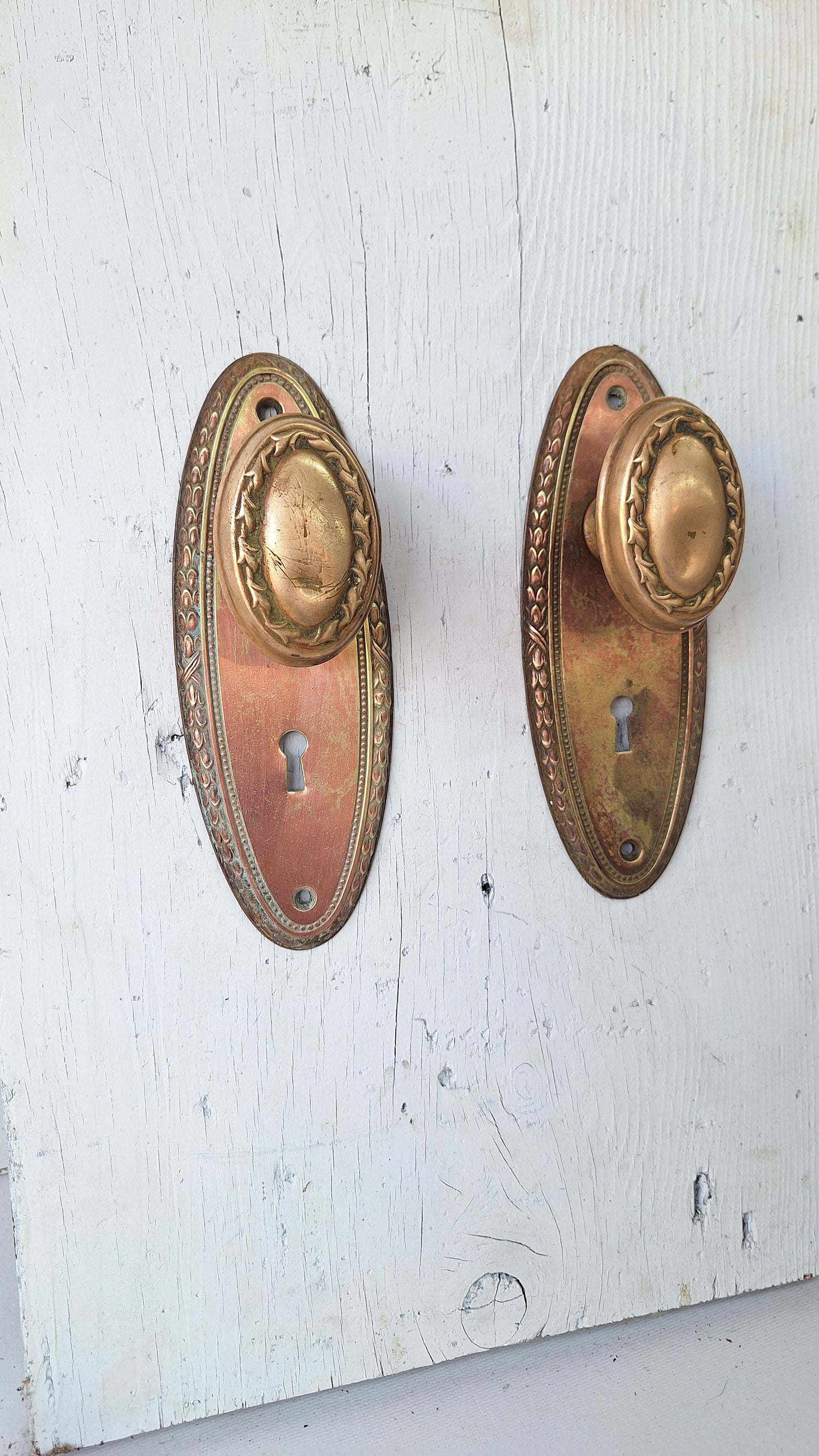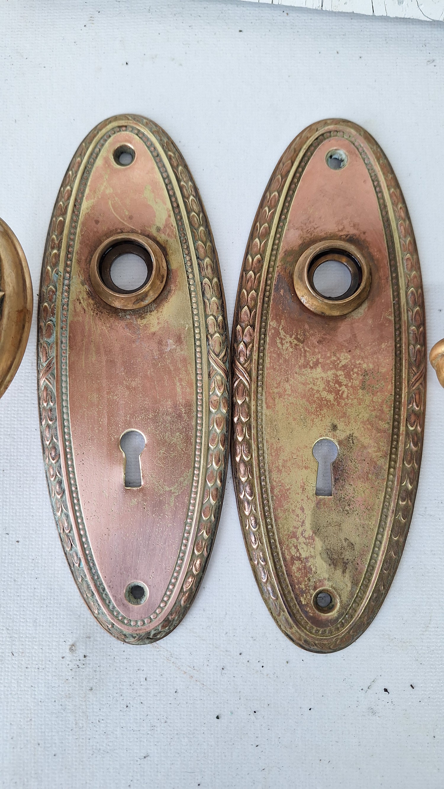 Fancy Oval Brass Doorknobs and Plates, Antique Door Hardware Set