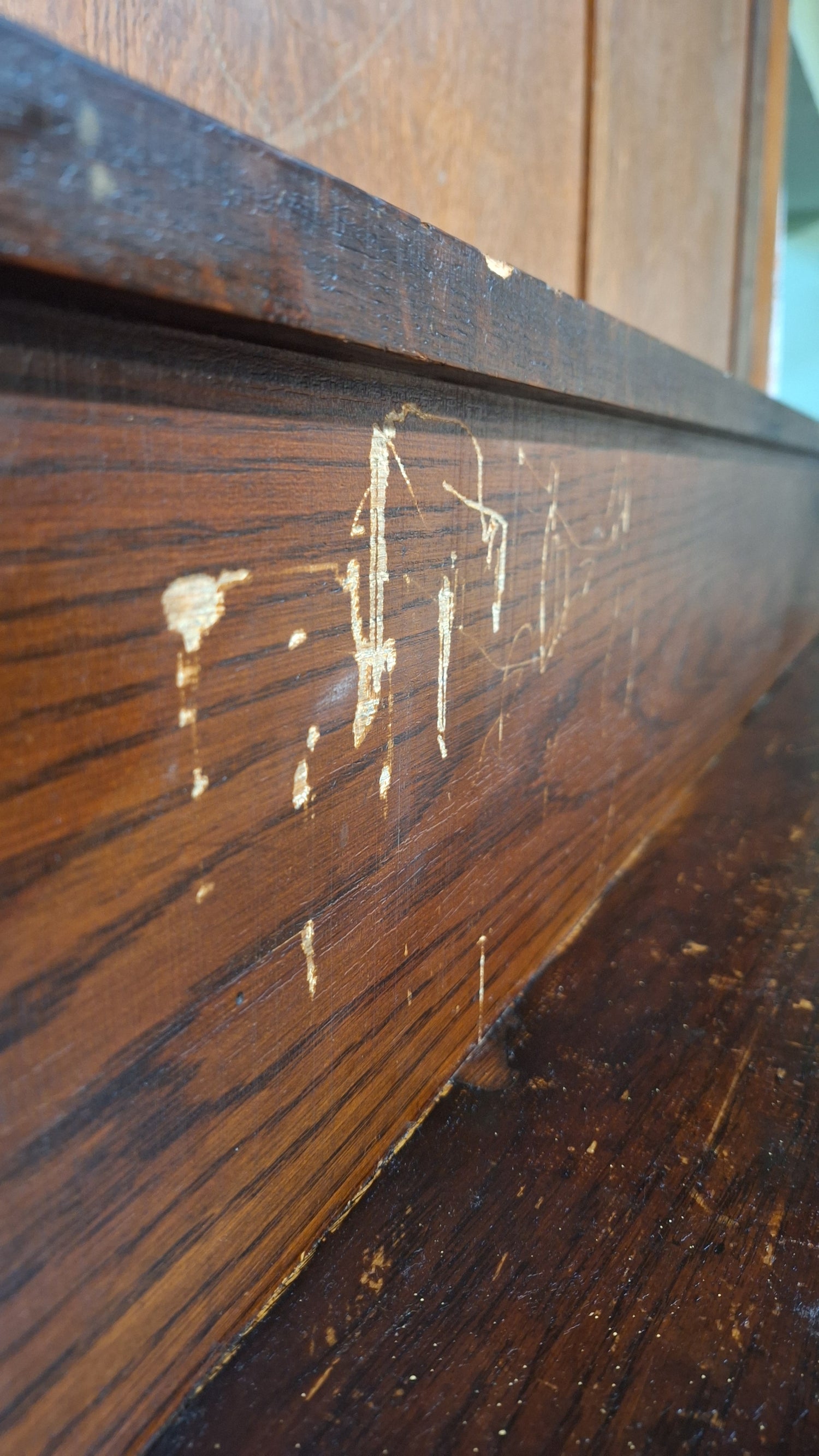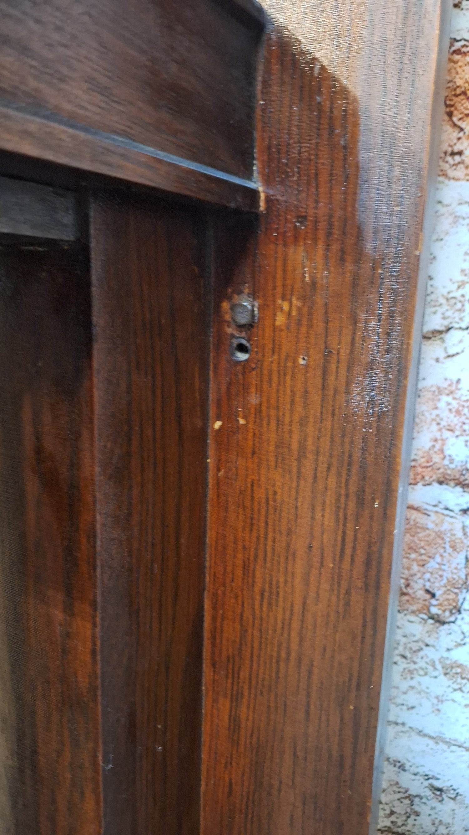 A simple, but stately, antique fireplace surround made from oak with quarter sawn columns featuring a stunning grain pattern. This piece is in very solid condition with signs of wear in the finish as shown such as scratches in the wood or finish. There are two holes on either side of the shelf from where another section was attached, but later removed. There are small holes along the front of the shelf from nails and wear the the top of the shelf and top edge of the mantle.