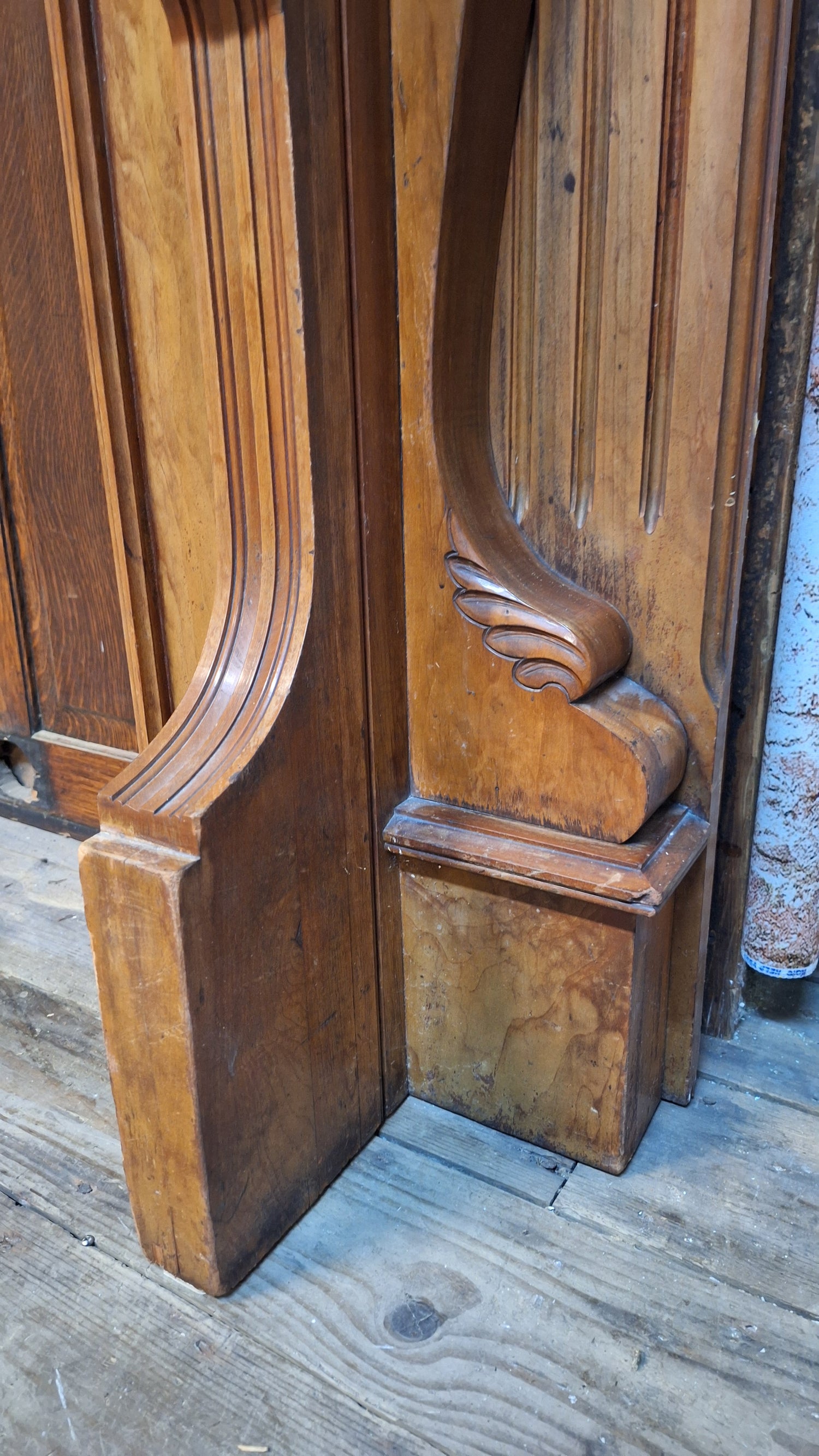 A beautiful solid wood mantel with a hand carved details along almost every surface and beautiful molded trim. It has a gorgeous profile with curved legs and ornate details that make it a stand-out piece. There are areas of discoloration to the wood, imperfections to the finish and wear to the wood as shown. The top of the mantle shelf shows wear as pictured. Please see all of our pictures for close ups and details. Please note that this is pictured against a wood backdrop which is not part of this mantle.
