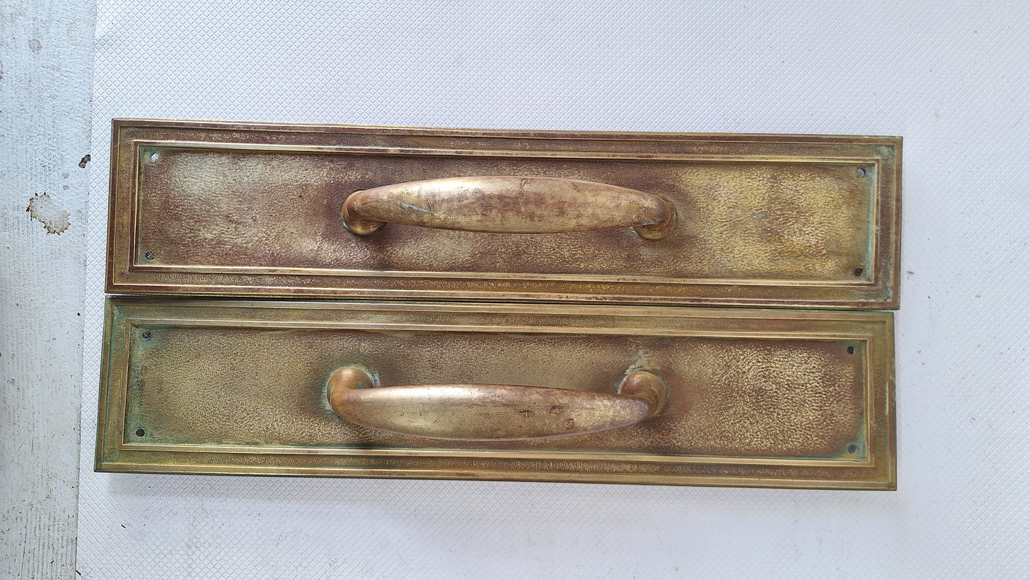 A simple, but functional and elegant pair of bronze plates with cast bronze pull handles. These are simple to install and give a great vintage appearance to doors, new or old. The plates are heavy cast bronze with a beautiful patina. Please see all of our pictures for details and dimensions on this set. This set ships free within the US.